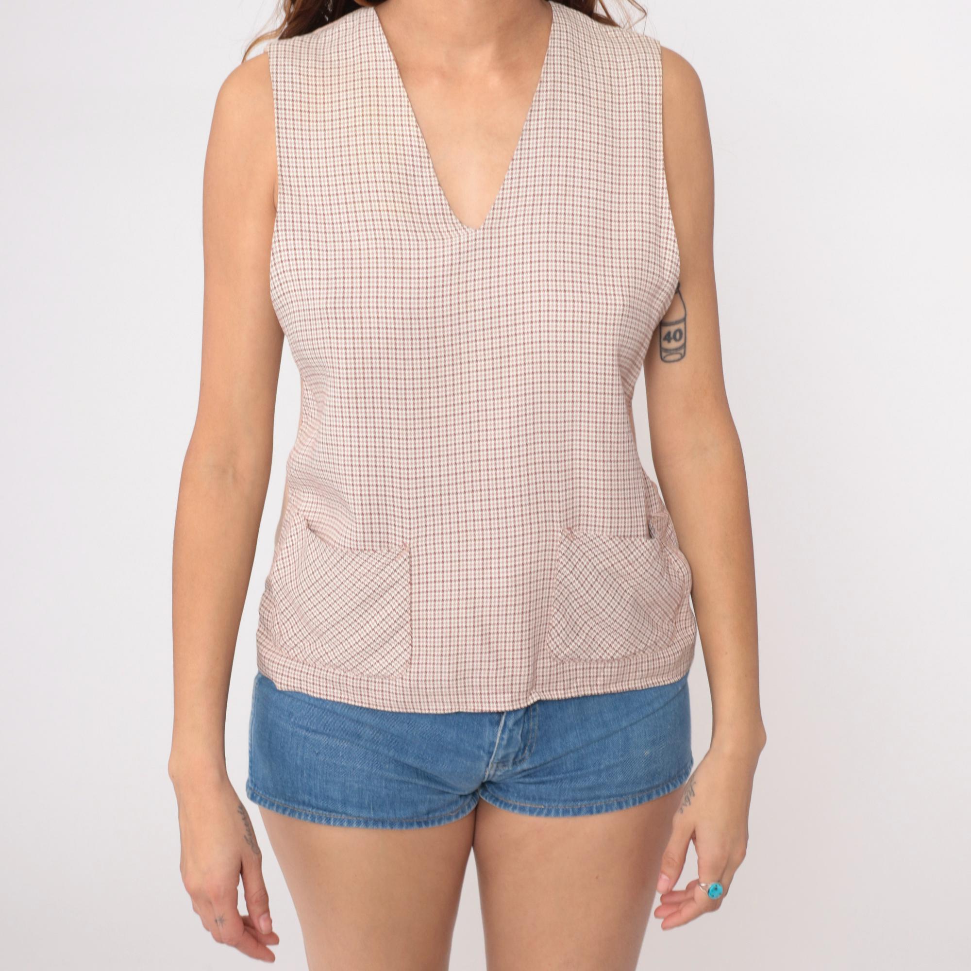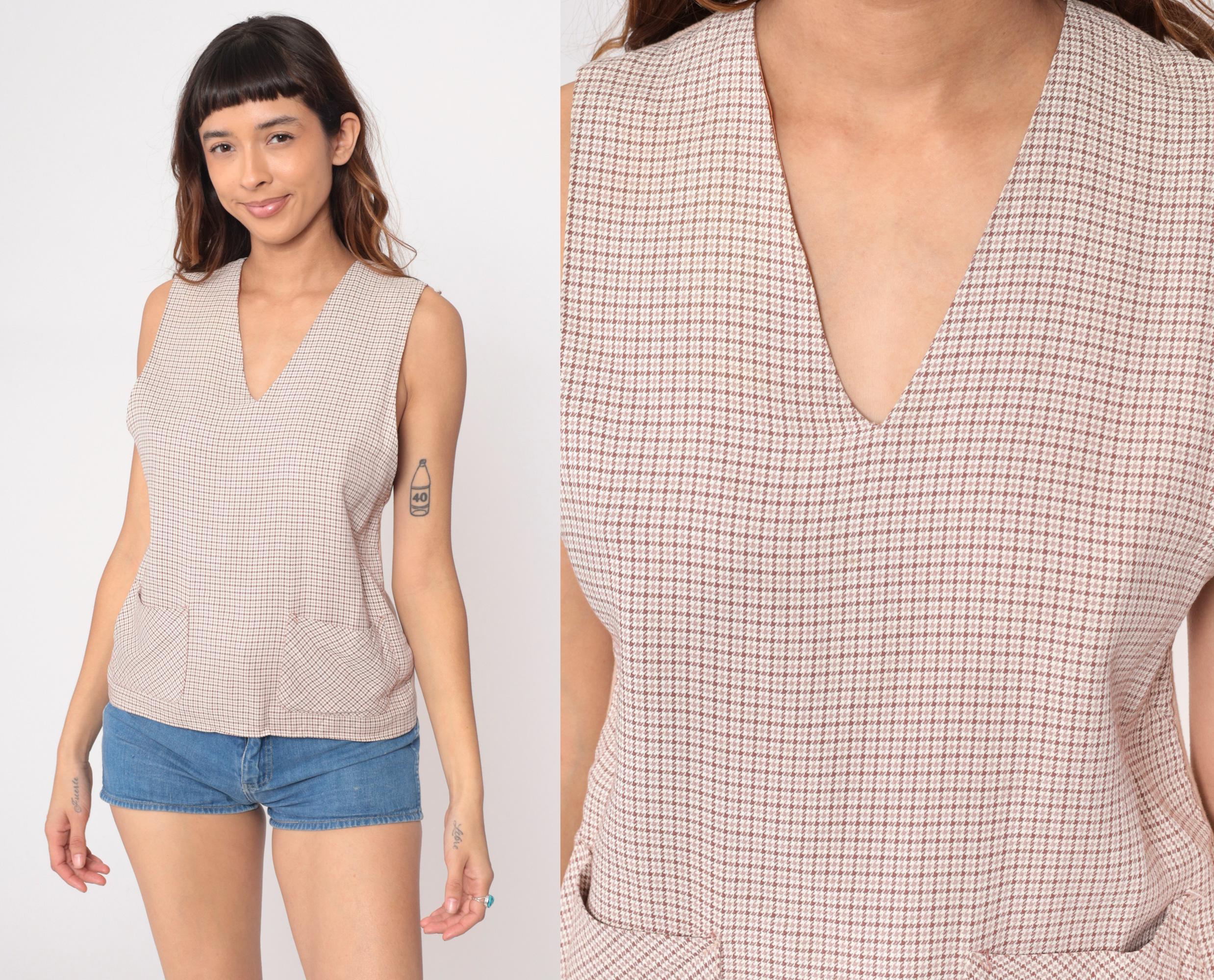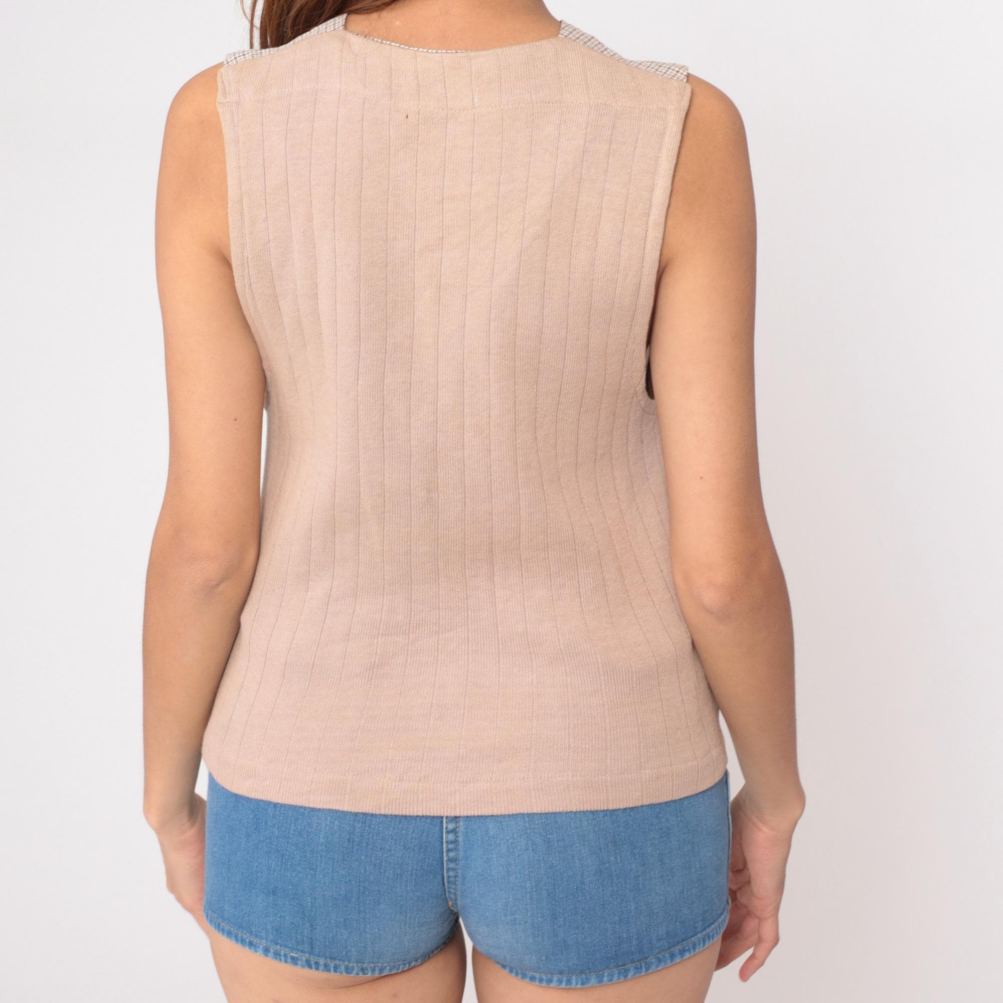 70s beige ribbed knit vest from campus sportswear with V-neck and brown and cream houndstooth check trim at neckline and shoulders. Sleeveless with vertical ribbing throughout, two patch pockets at hips.