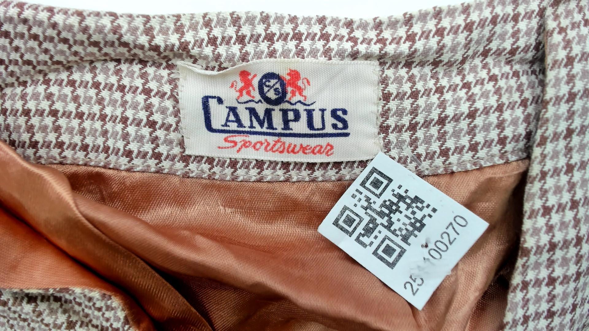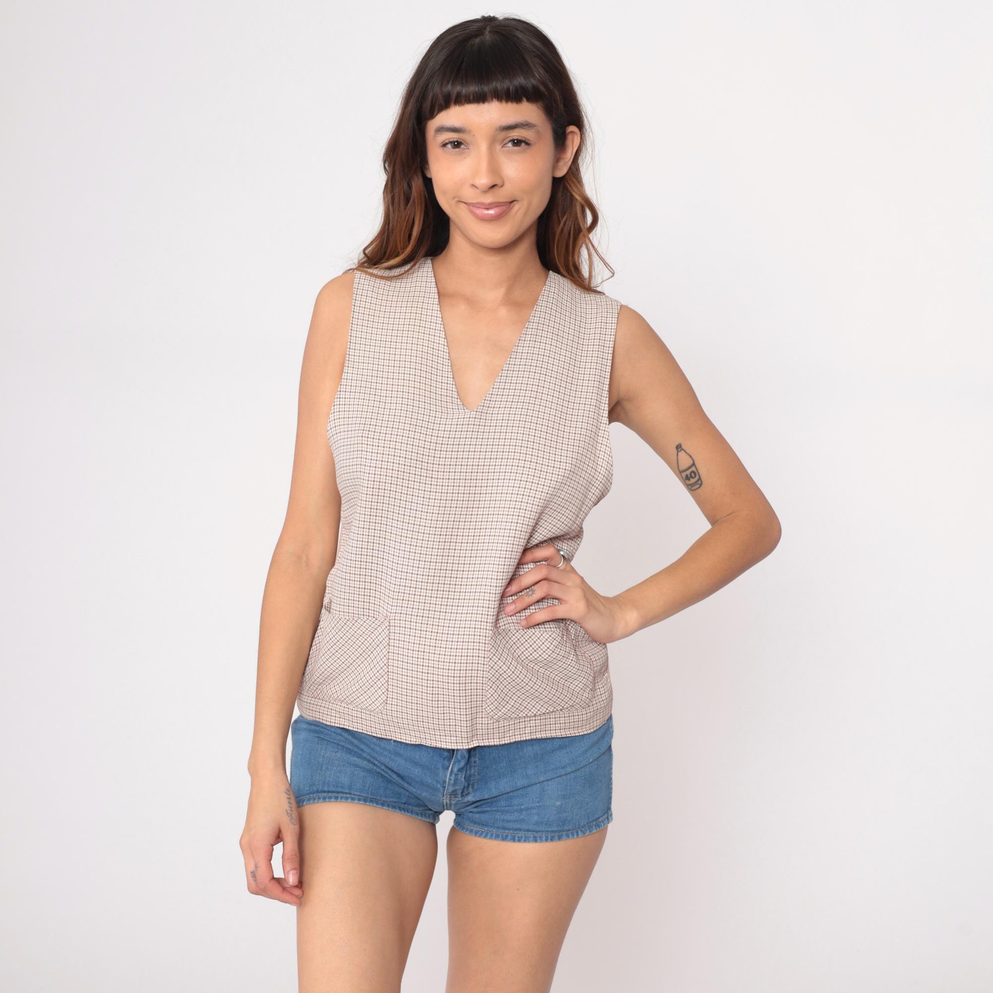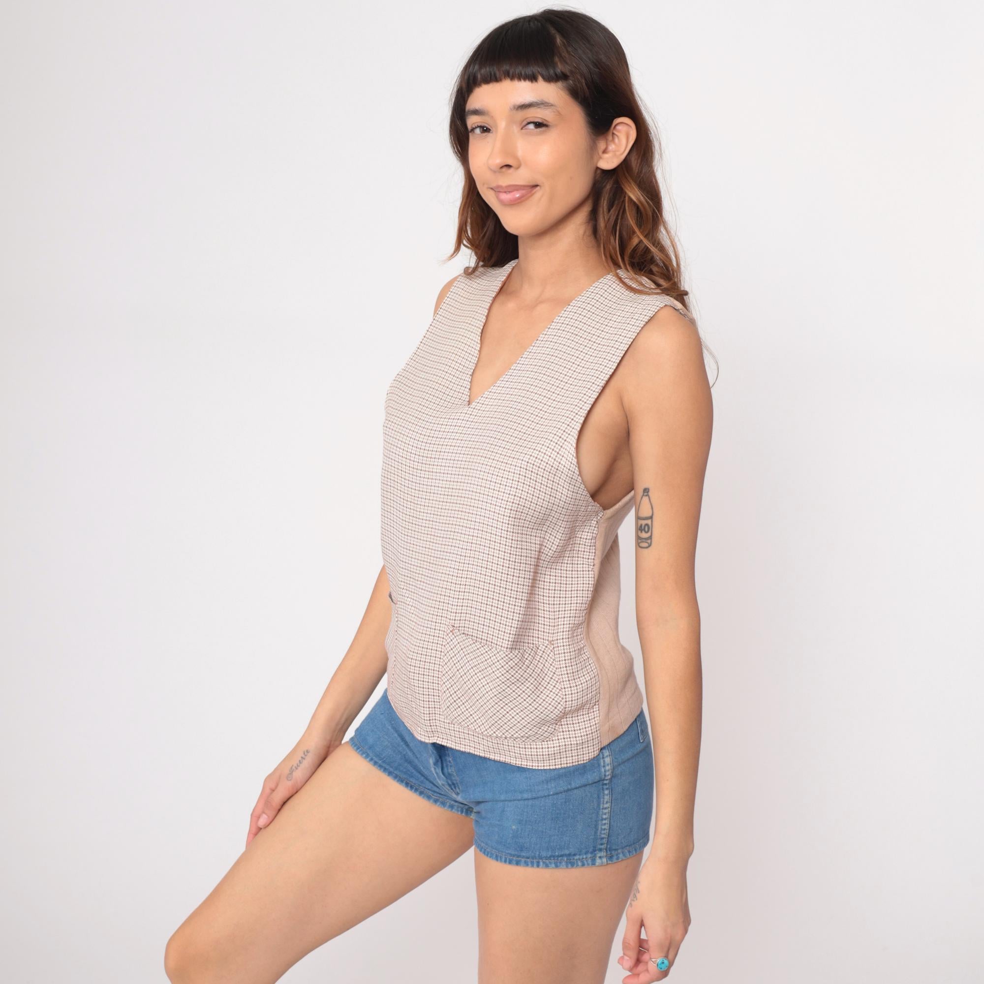 70s beige ribbed knit vest from campus sportswear with V-neck and brown and cream houndstooth check trim at neckline and shoulders. Sleeveless with vertical ribbing throughout, two patch pockets at hips.