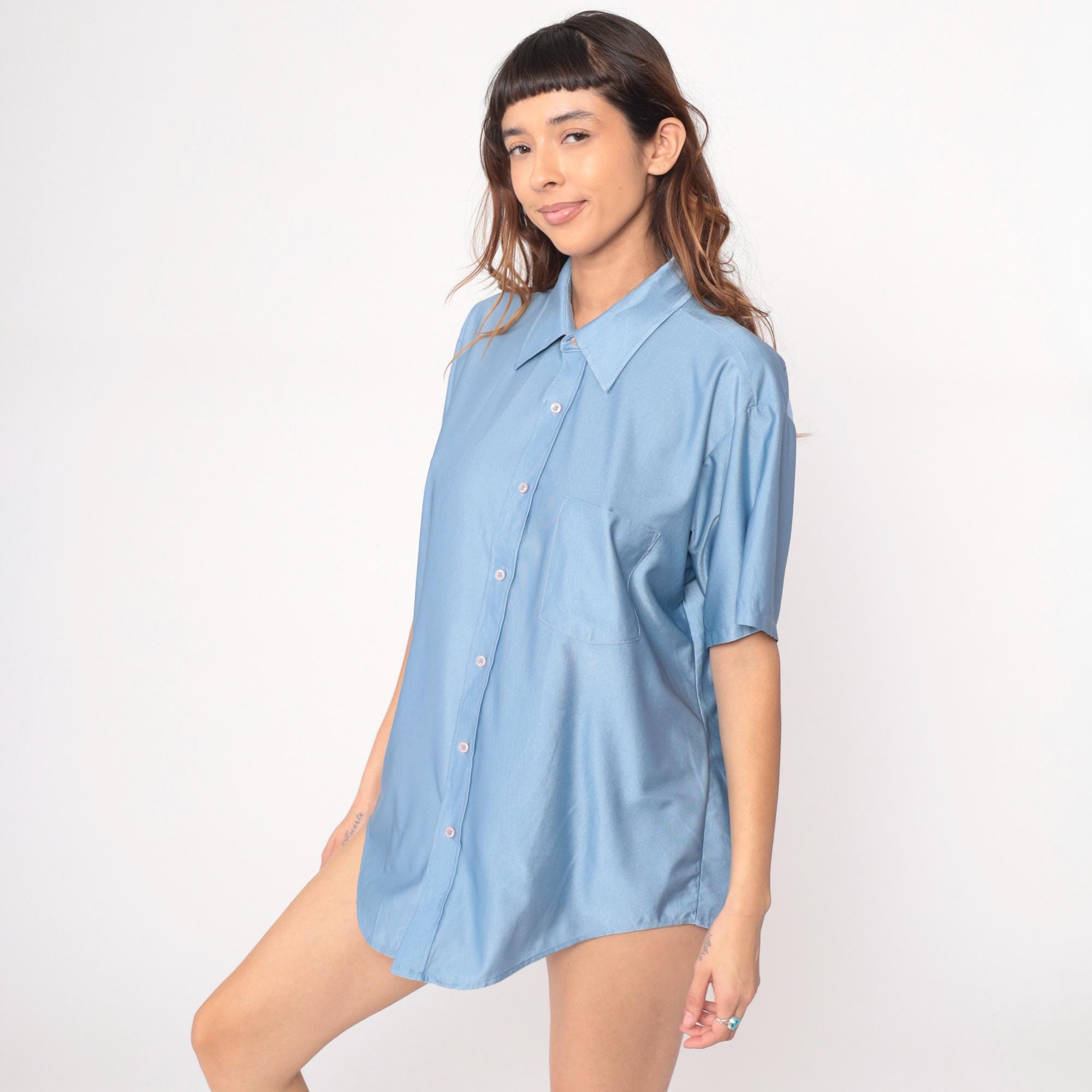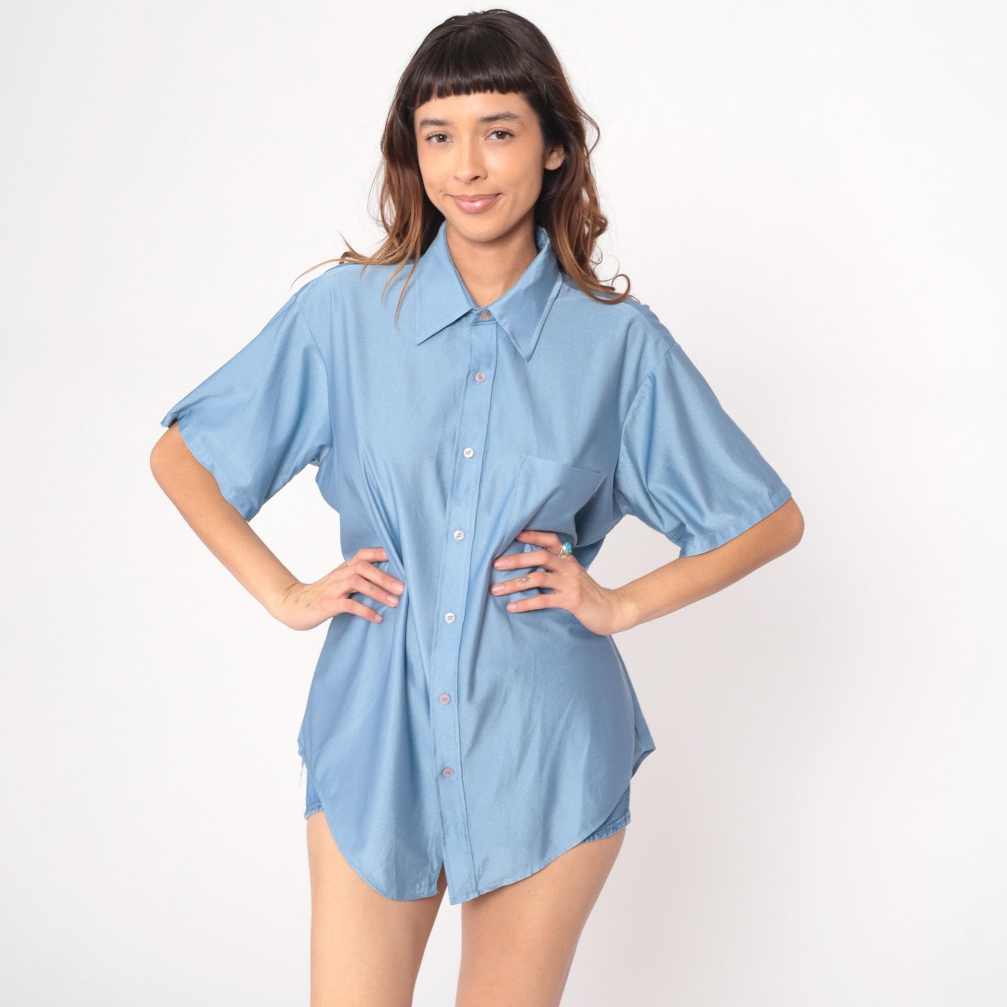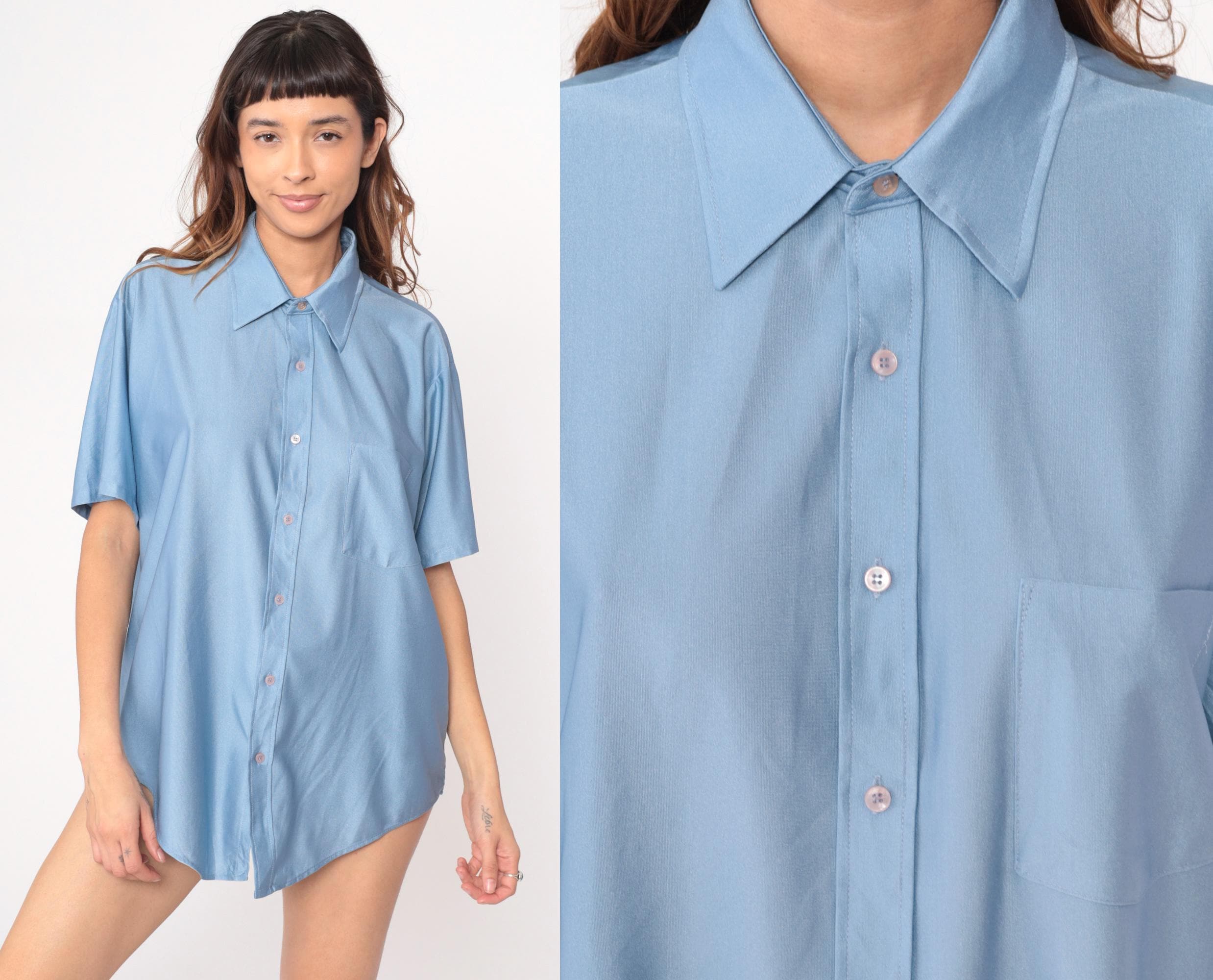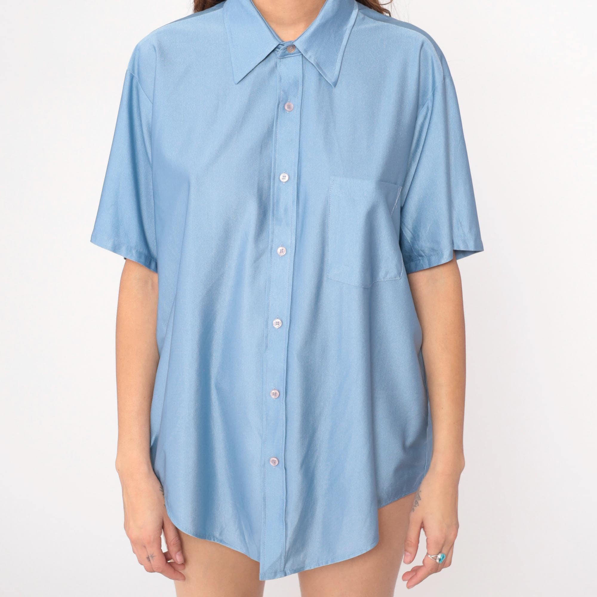 70s light blue button-front shirt from van huesen with pointed collar and short sleeves. Oversized, relaxed fit with chest pocket. Nylon.