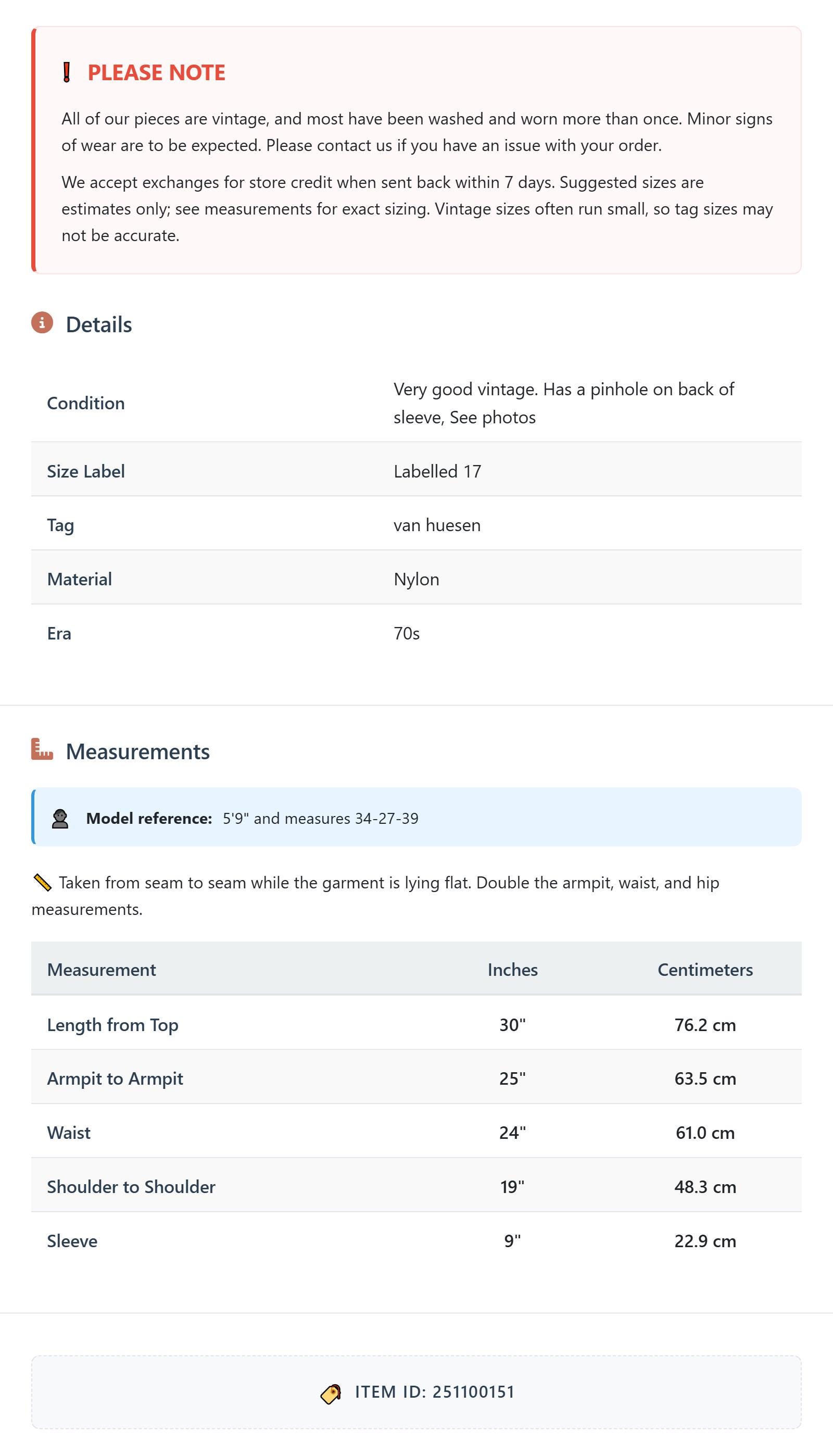 All of our pieces are vintage, and most have been washed and worn more than once. Minor signs of wear are to be expected. Please contact us if you have an issue with your order. We accept exchanges for store credit when sent back within 7 days.