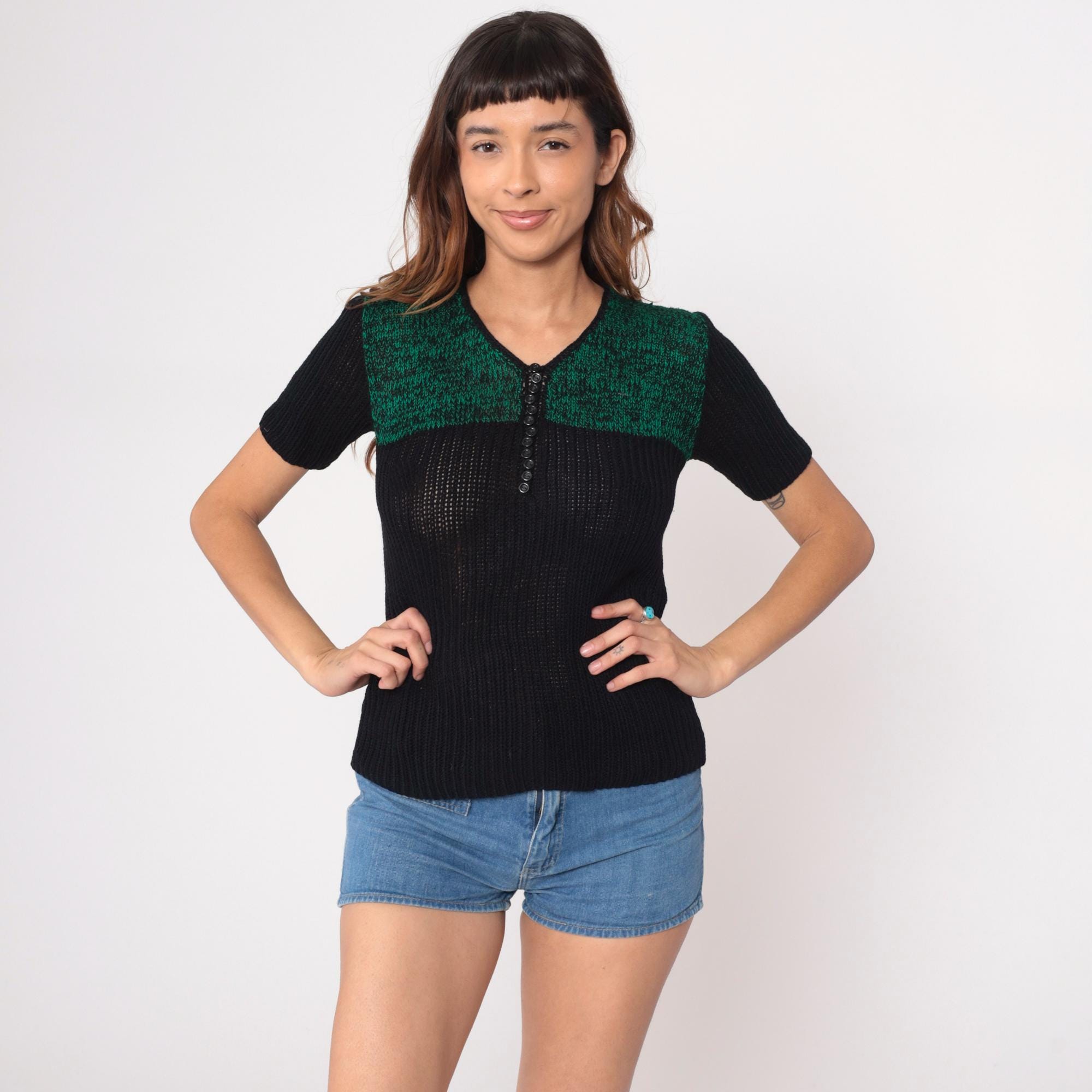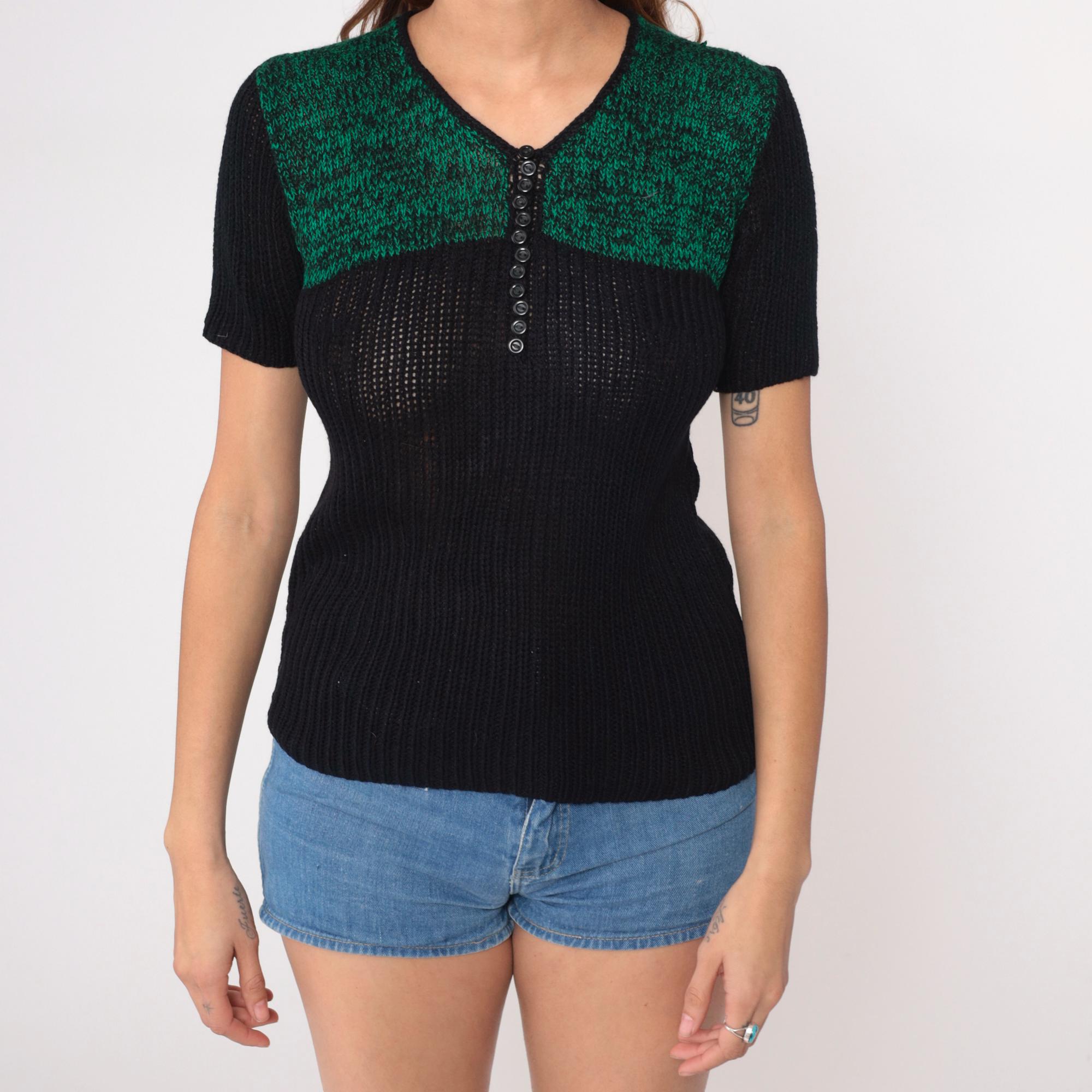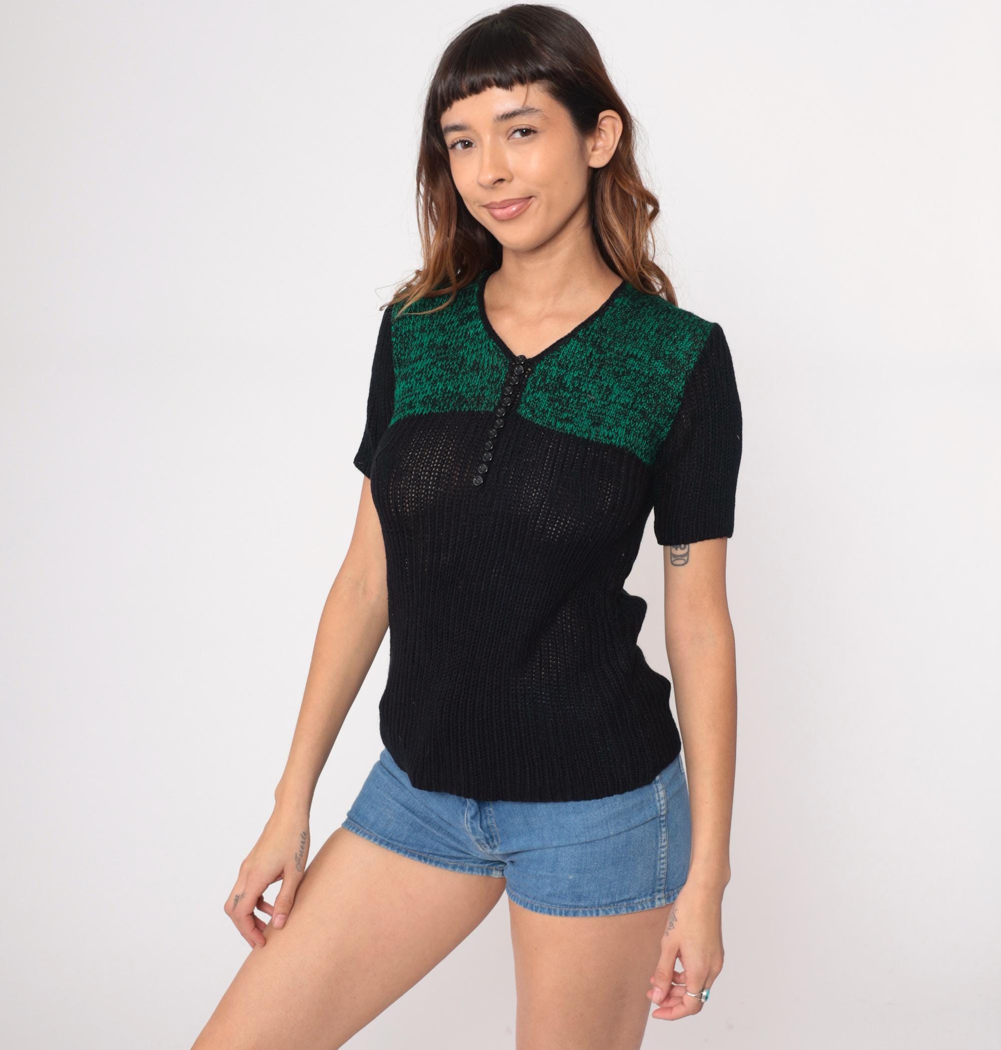 70s black knit top with green marled yoke and V-neck button front closure. Short sleeves with ribbed knit body and textured green collar area extending across shoulders and upper chest. Black buttons down center front, black trim at neckline.