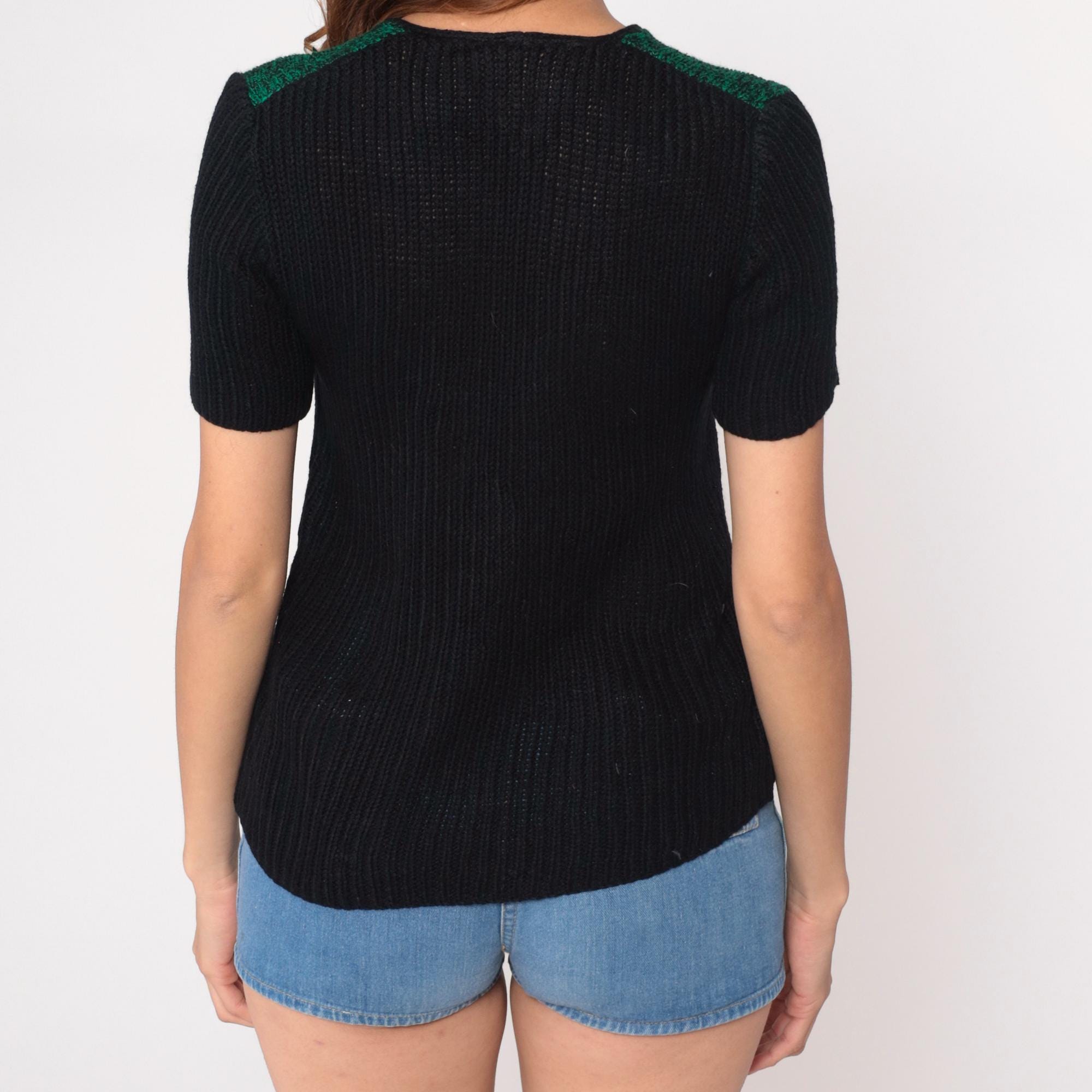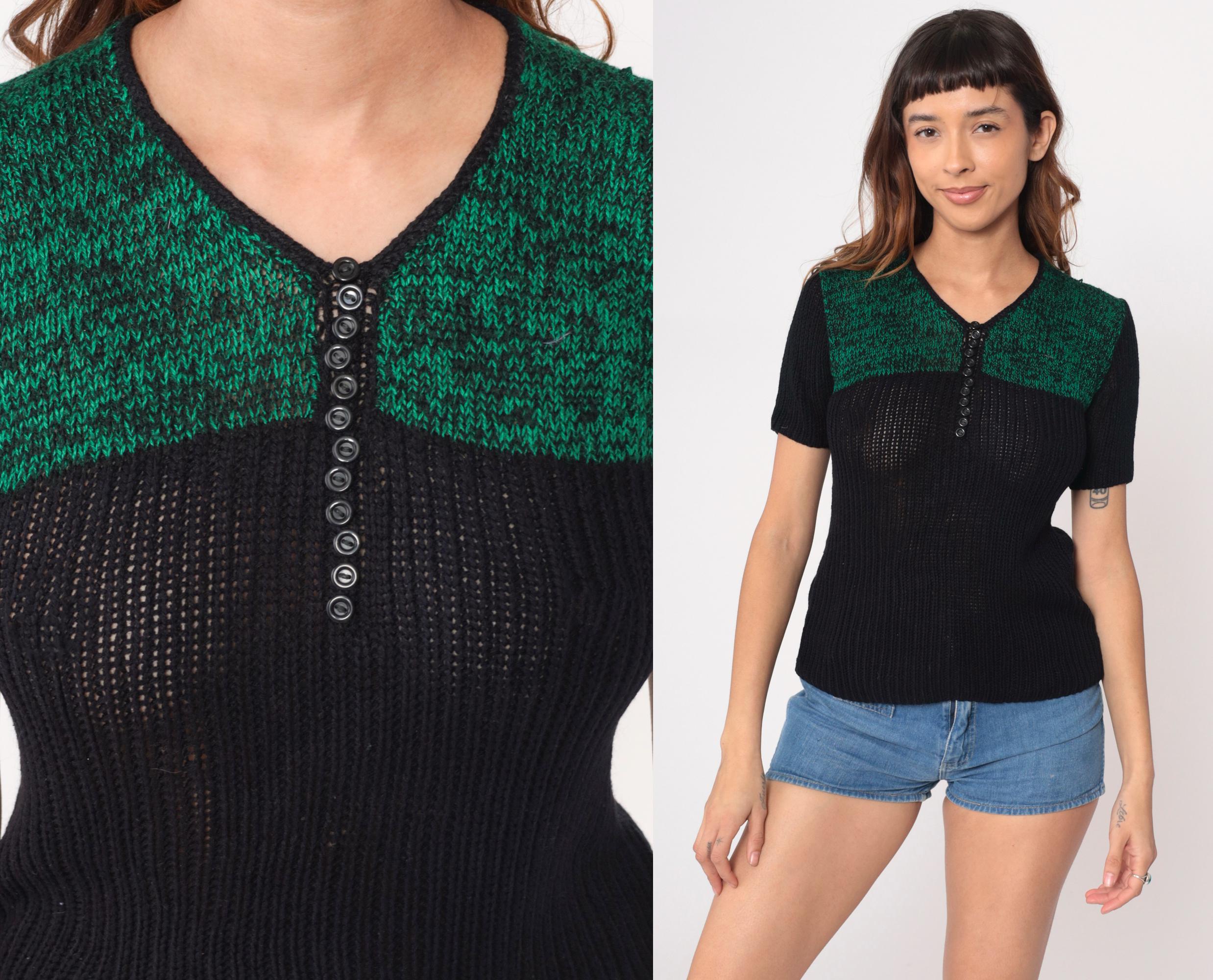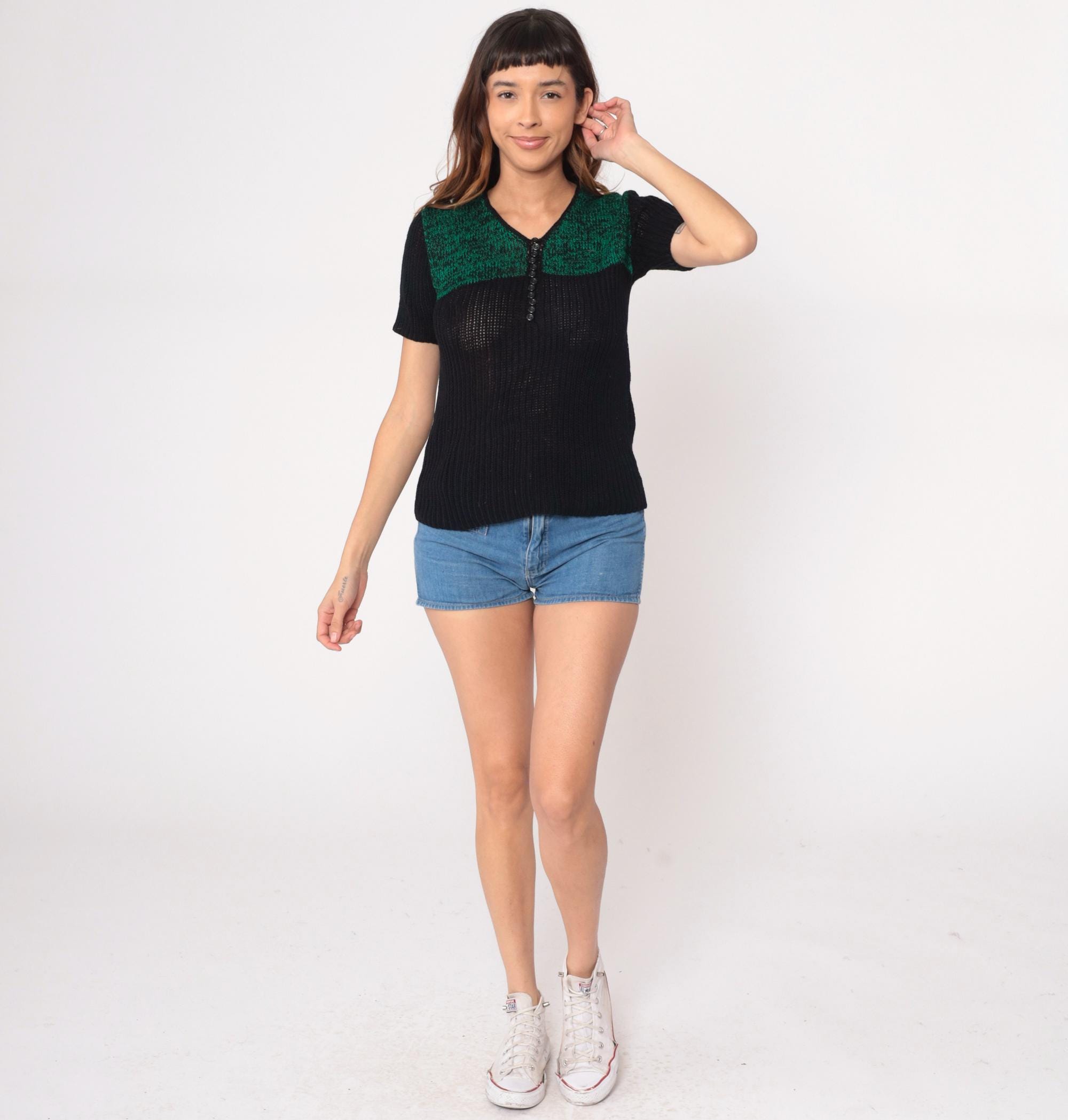 70s black knit top with green marled yoke and V-neck button front closure. Short sleeves with ribbed knit body and textured green collar area extending across shoulders and upper chest. Black buttons down center front, black trim at neckline.