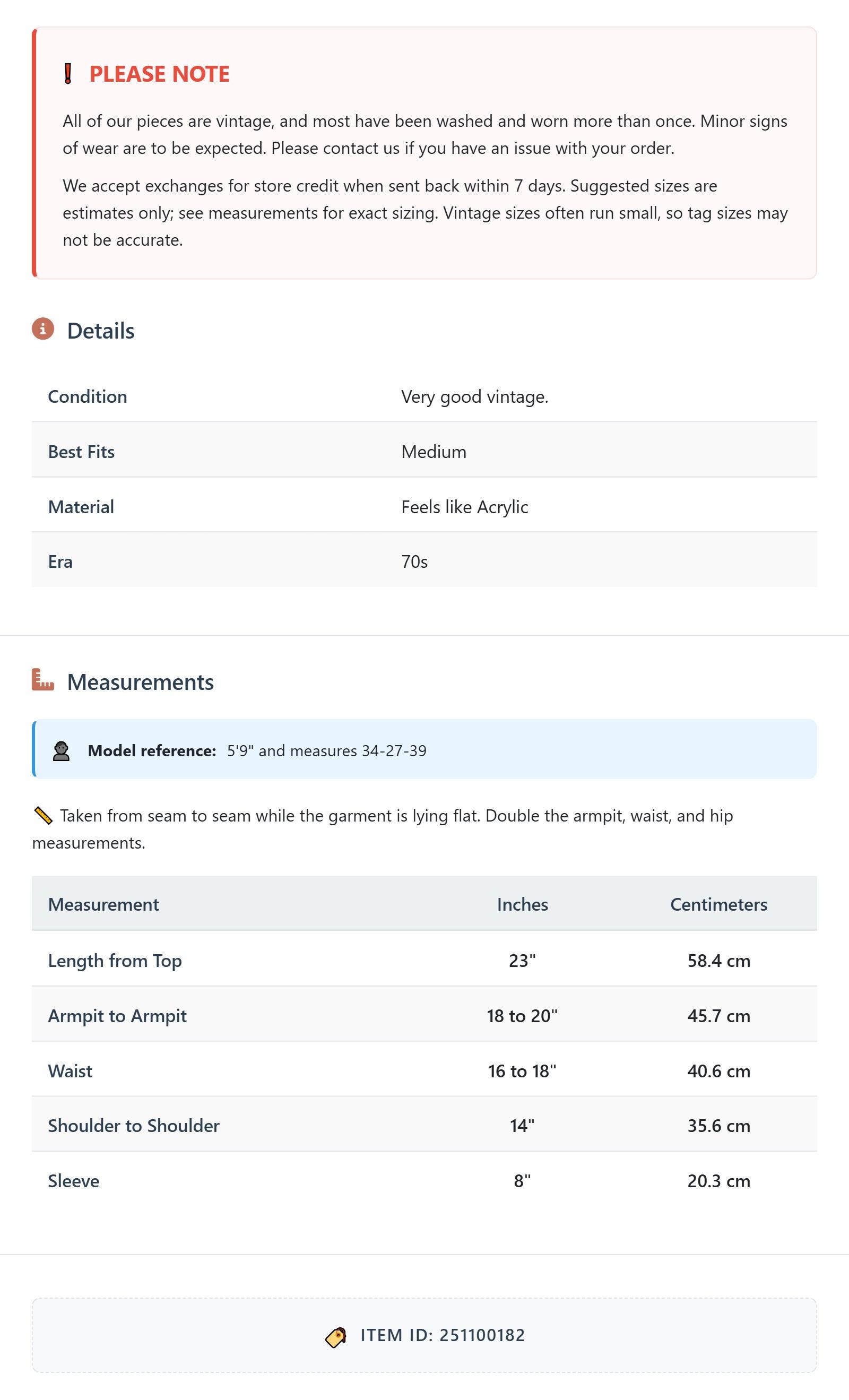Suggested sizes are estimates only; see measurements for exact sizing. Vintage sizes often run small, so tag sizes may not be accurate.