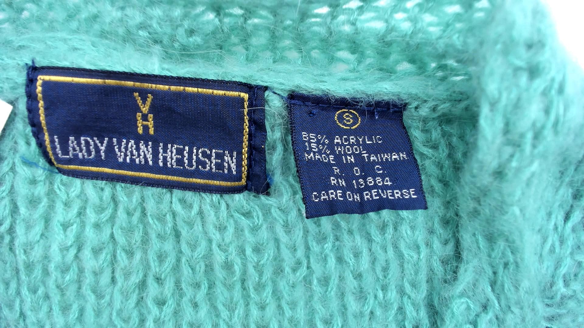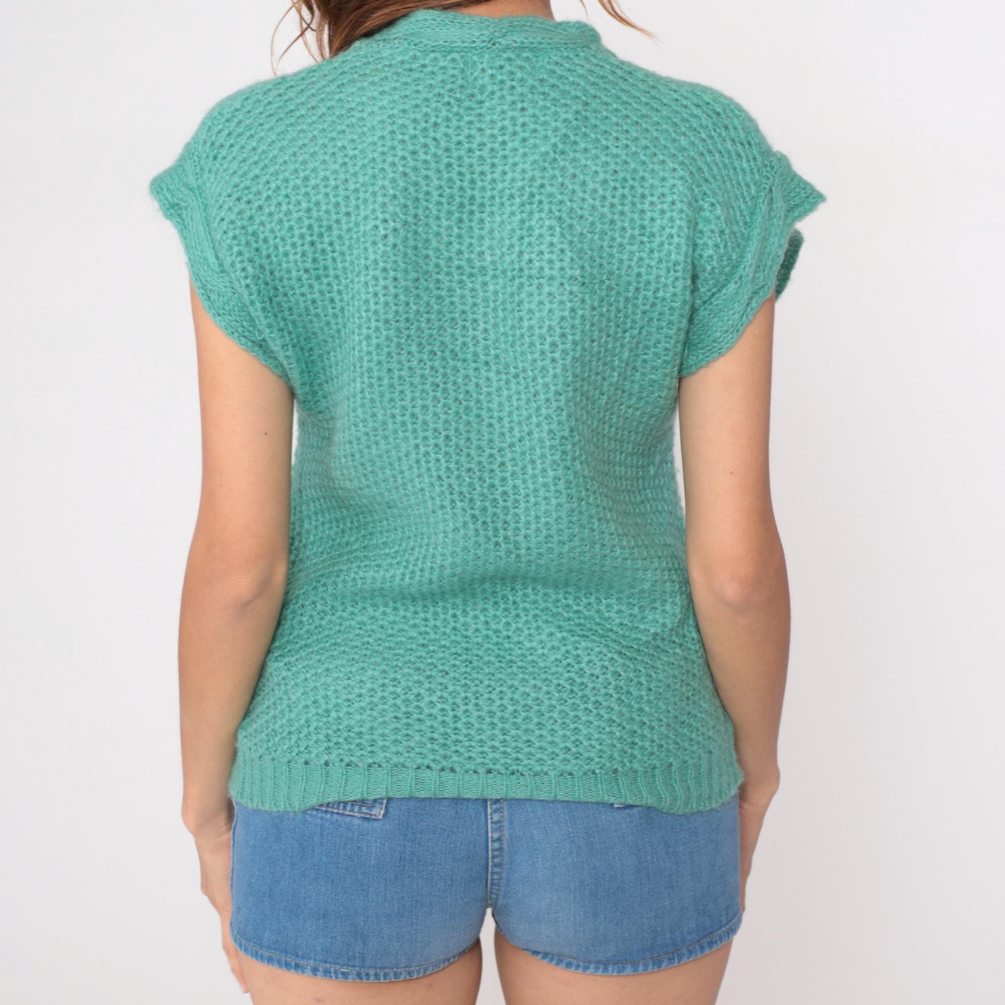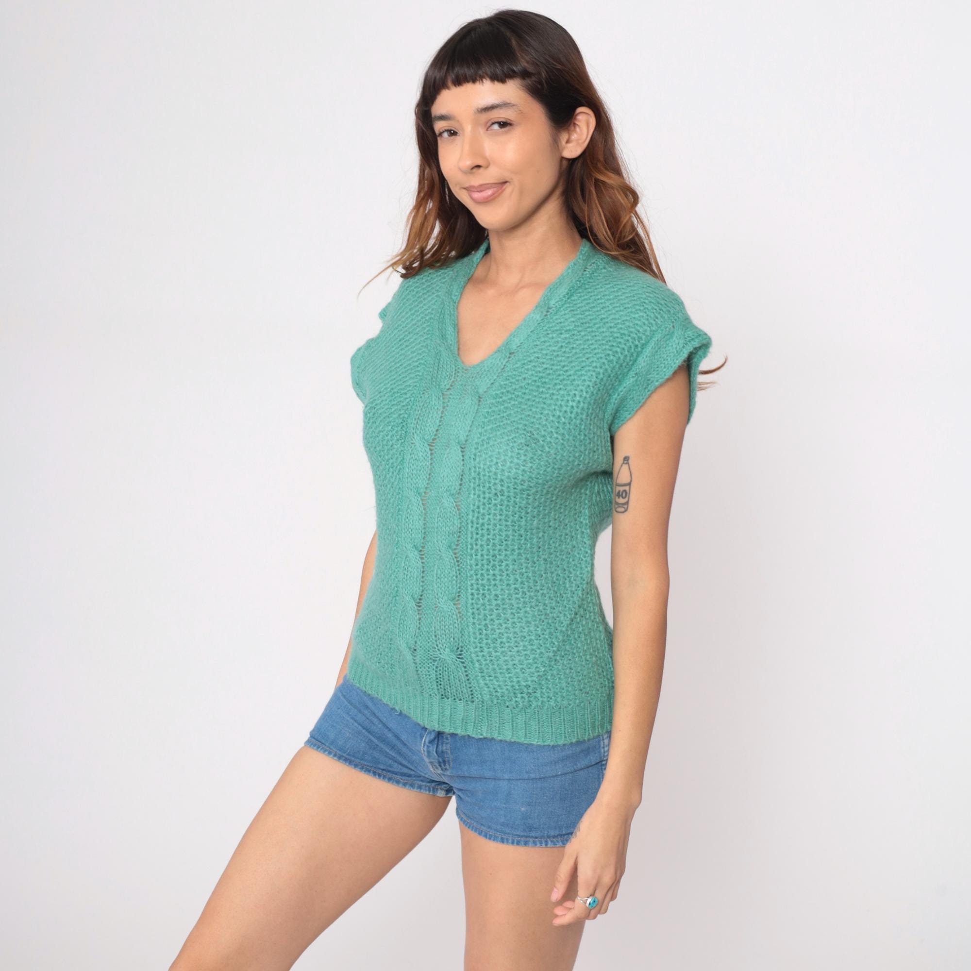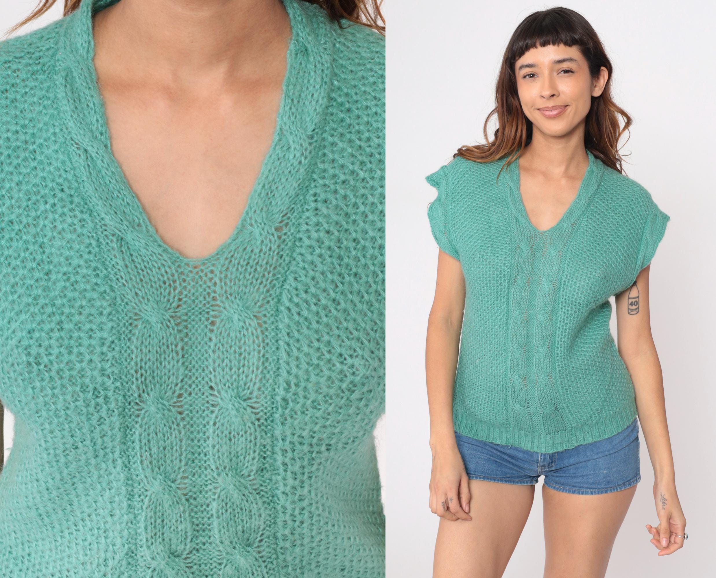 80s mint green short sleeve sweater from lady van huesen in open mesh knit with cable knit design down center front. V-neckline, cap sleeves, ribbed hem. Acrylic and wool blend. Tagged size Small.