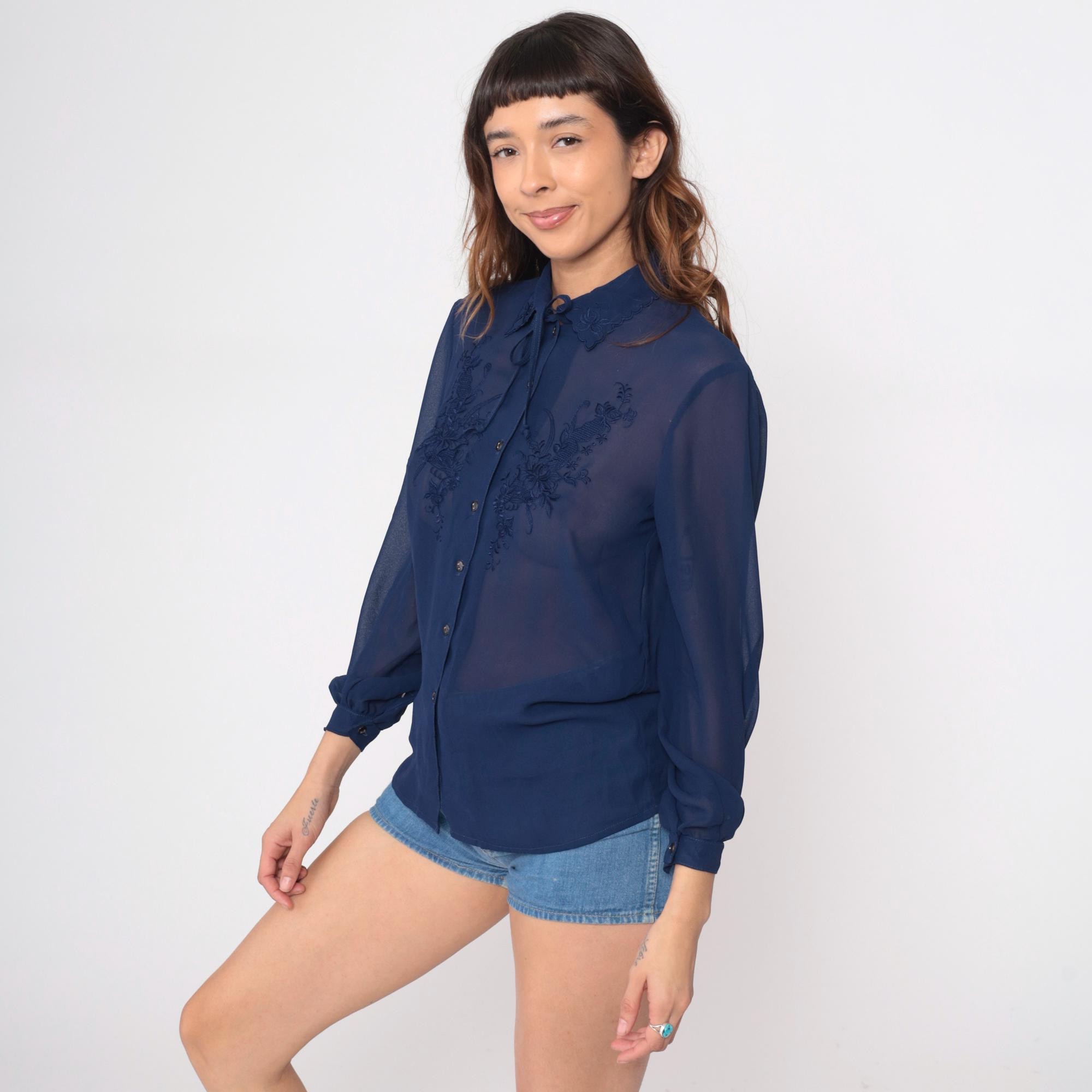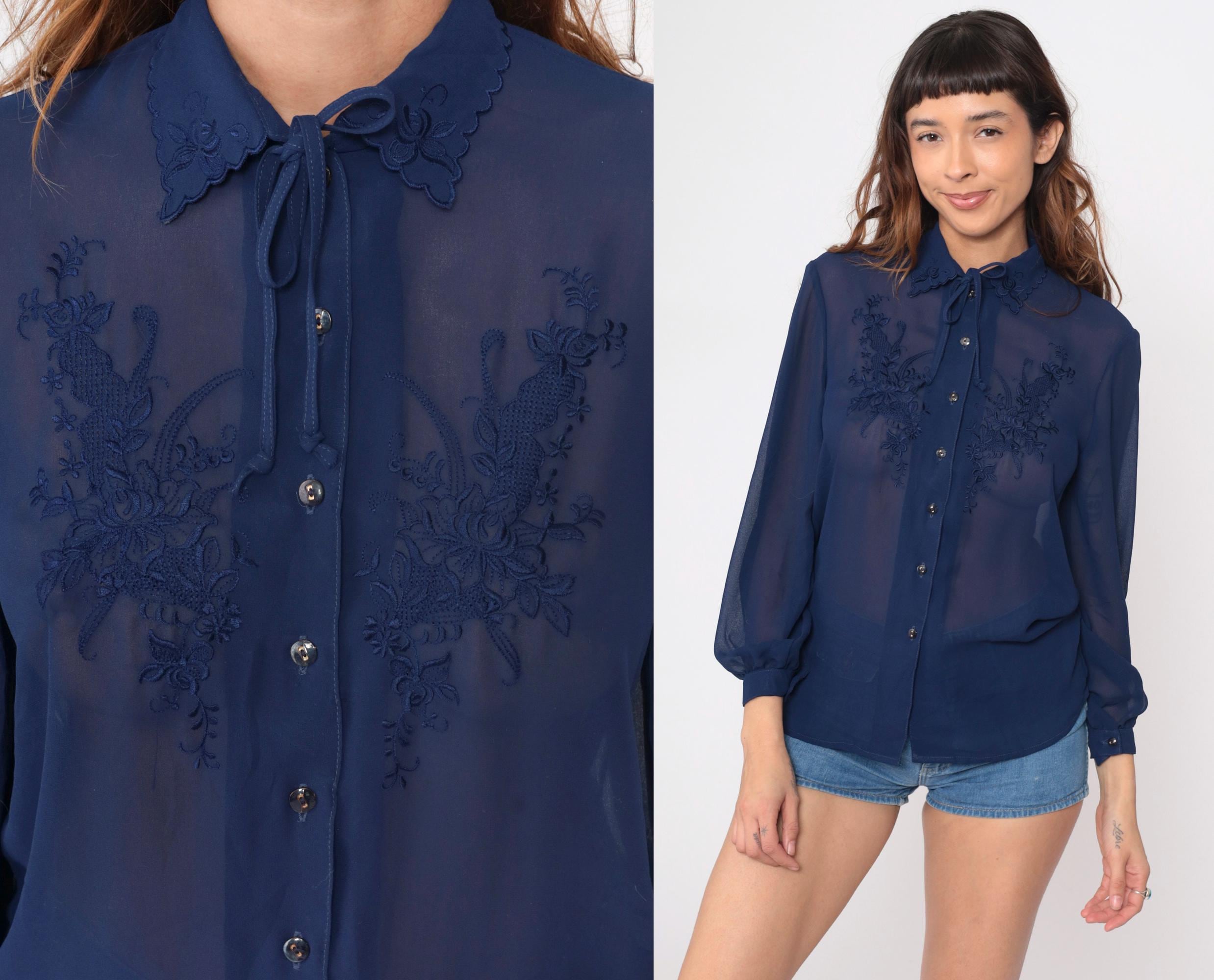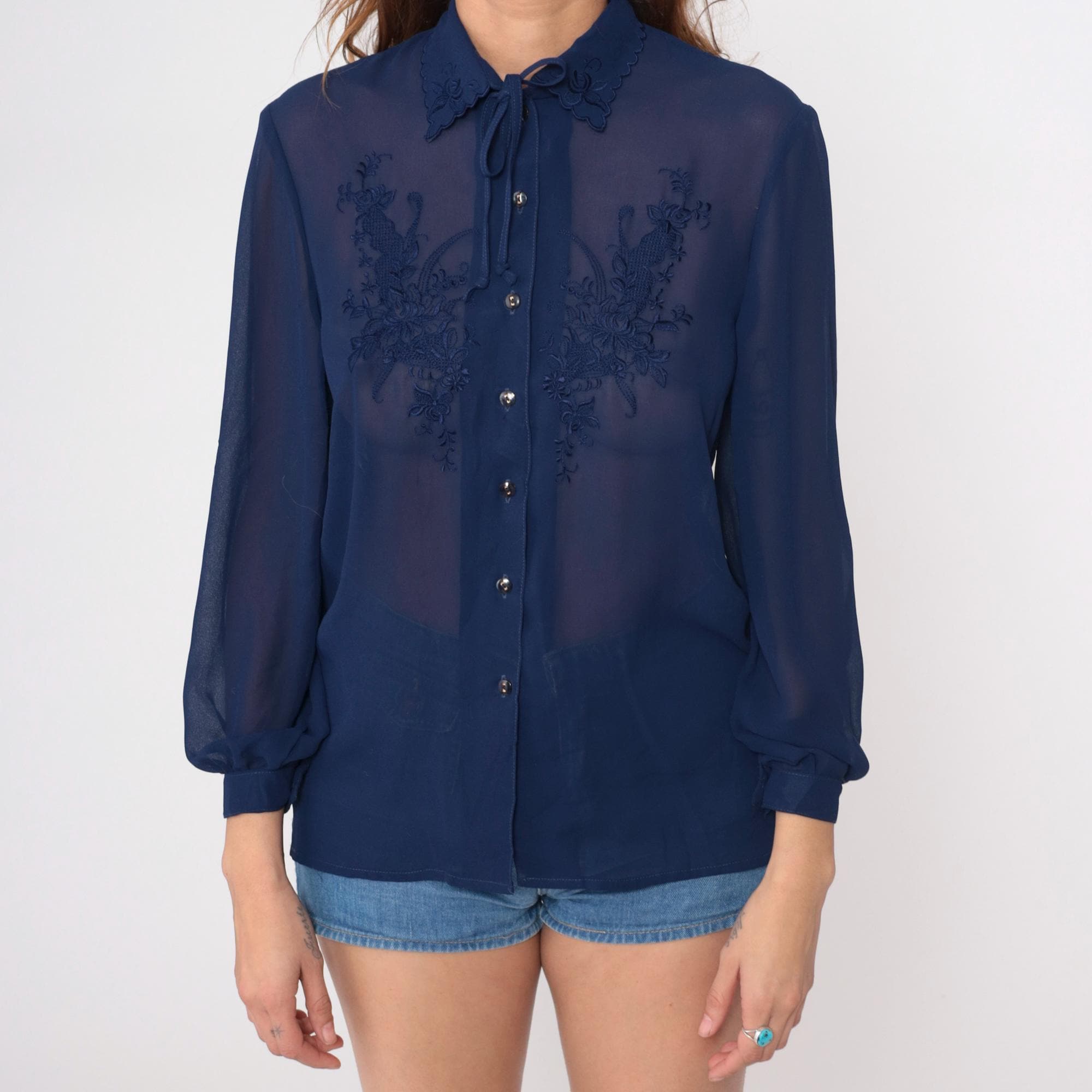 80s navy blue blouse from claude paris with tone-on-tone floral embroidery across the front yoke and scalloped collar edges. Neck tie closure at collar, button front with decorative buttons, long sleeves with fitted cuffs. Semi-sheer polyester.