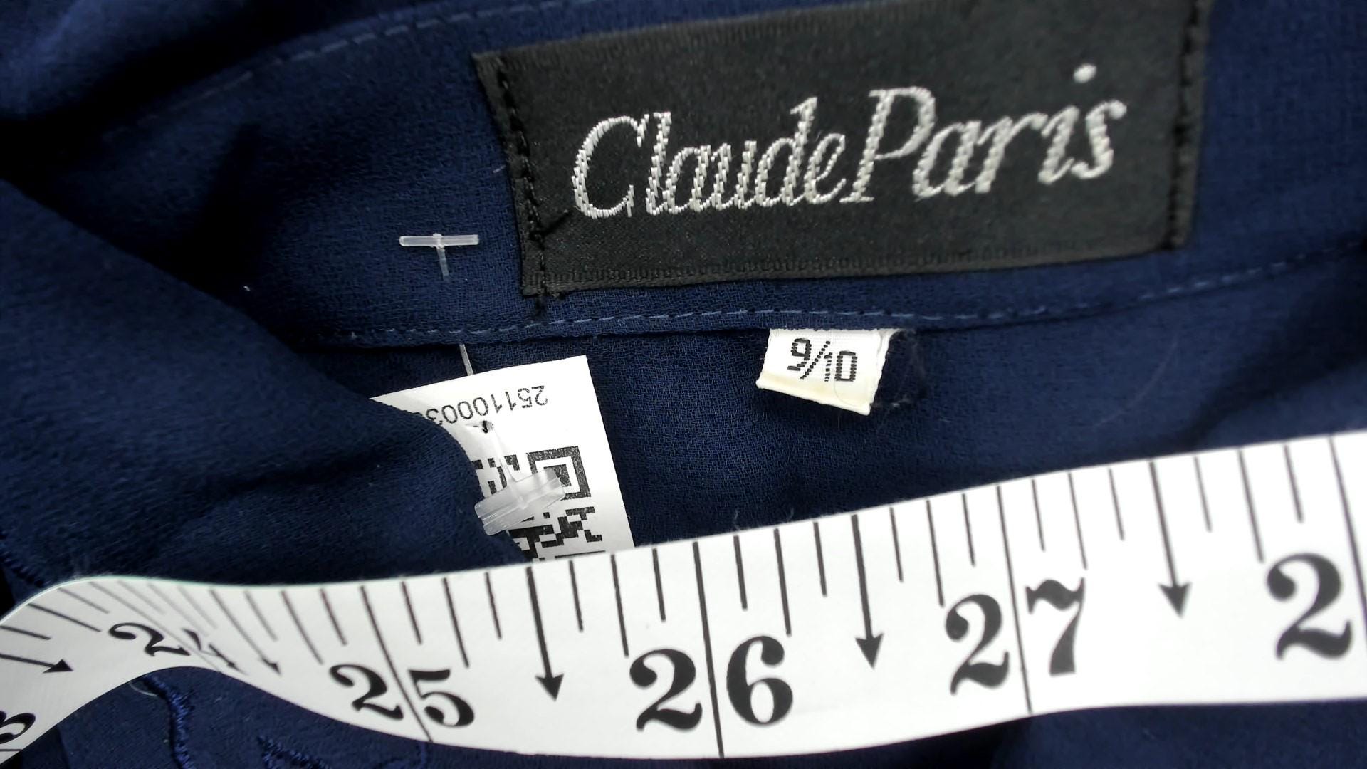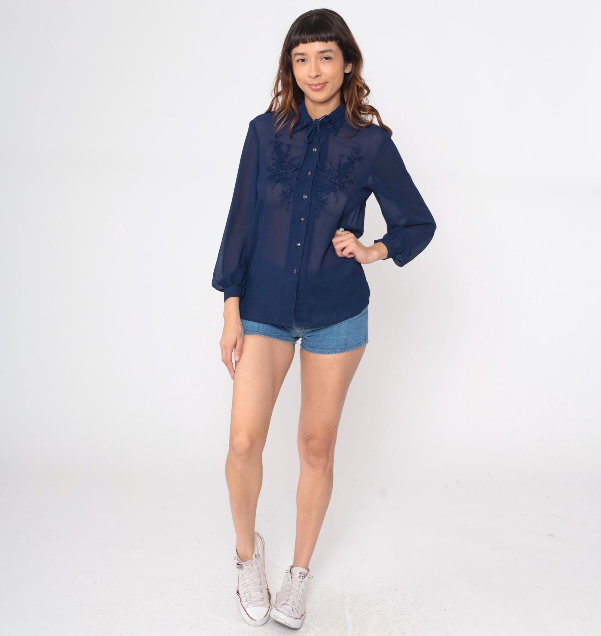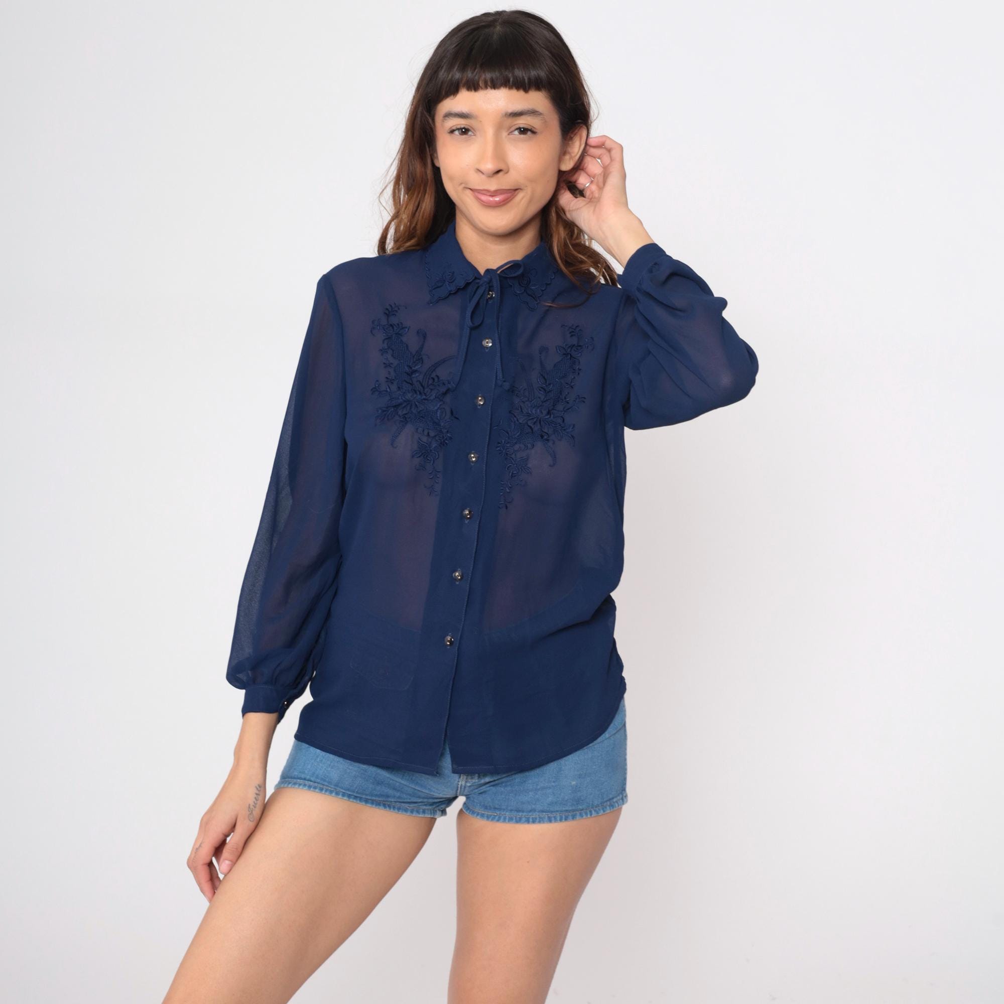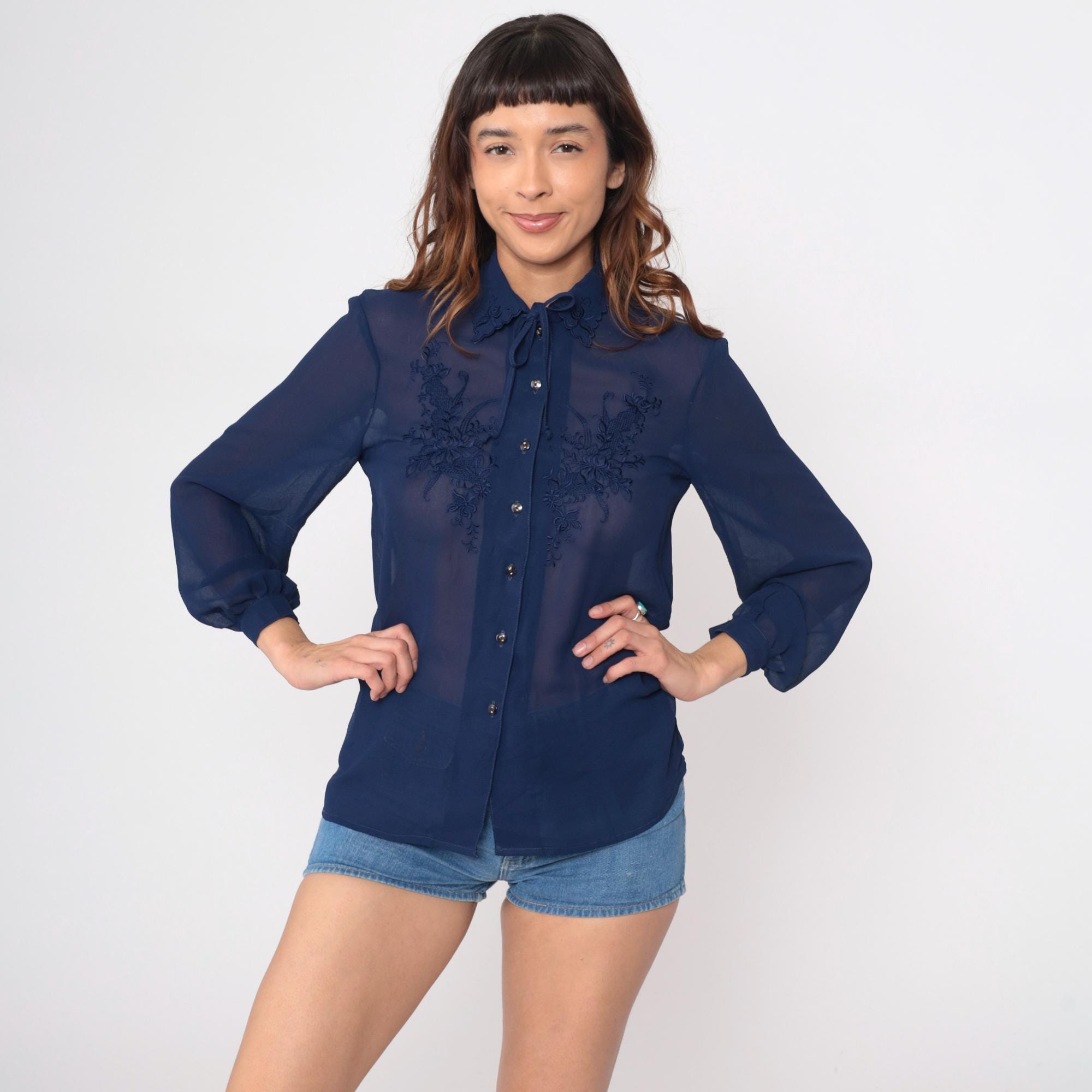80s navy blue blouse from claude paris with tone-on-tone floral embroidery across the front yoke and scalloped collar edges. Neck tie closure at collar, button front with decorative buttons, long sleeves with fitted cuffs. Semi-sheer polyester.