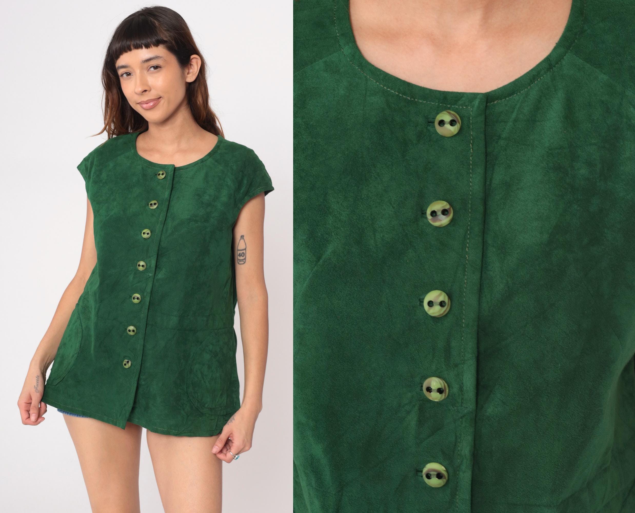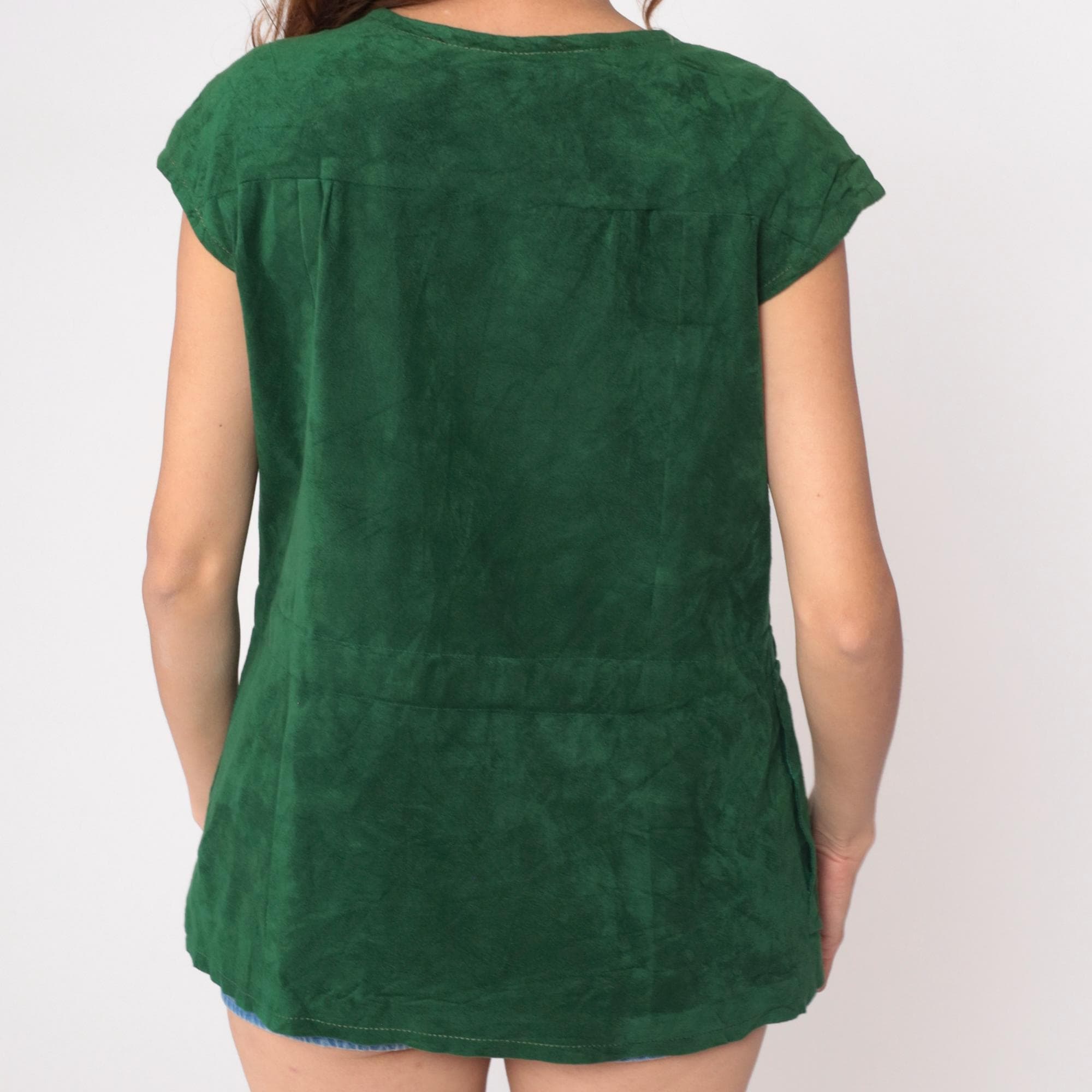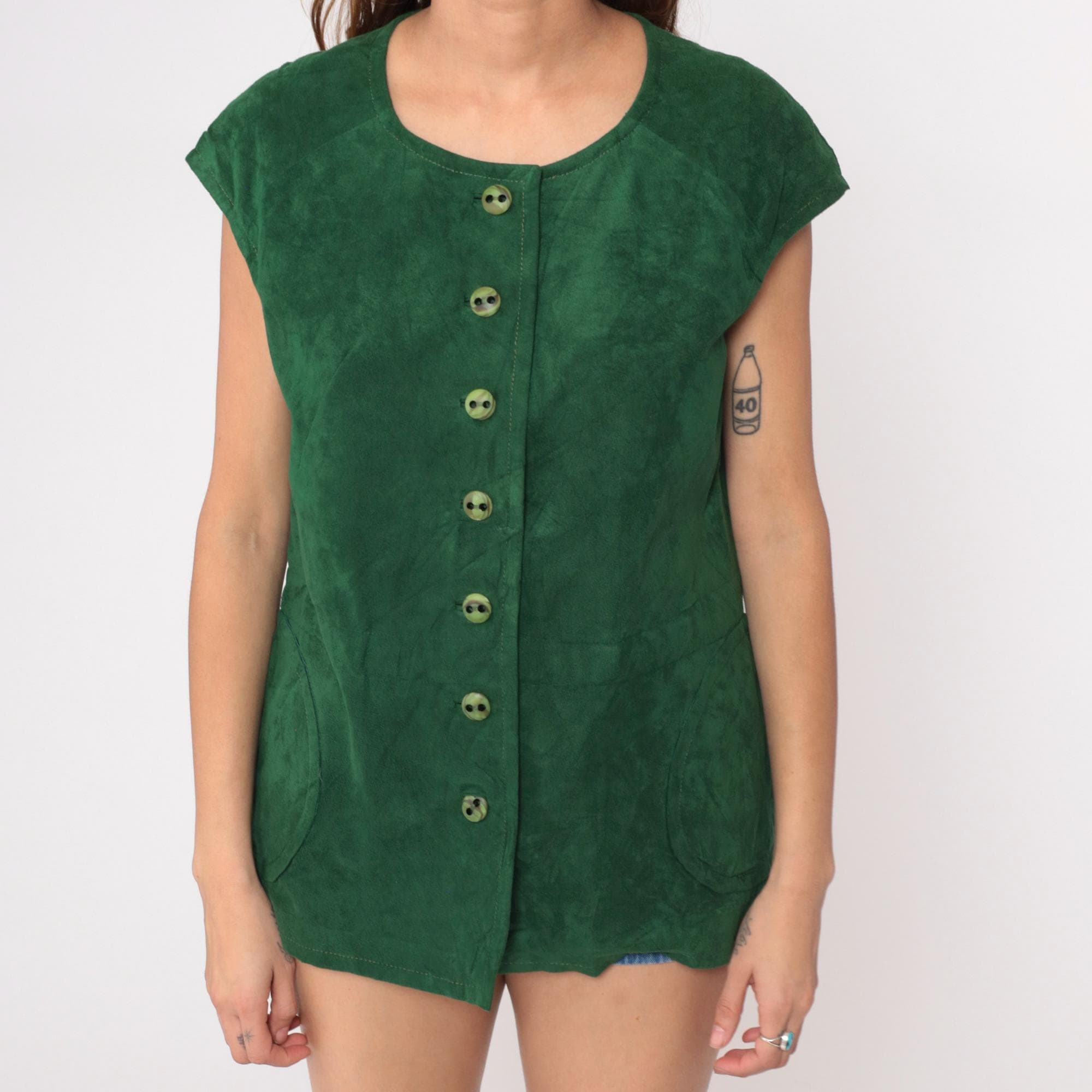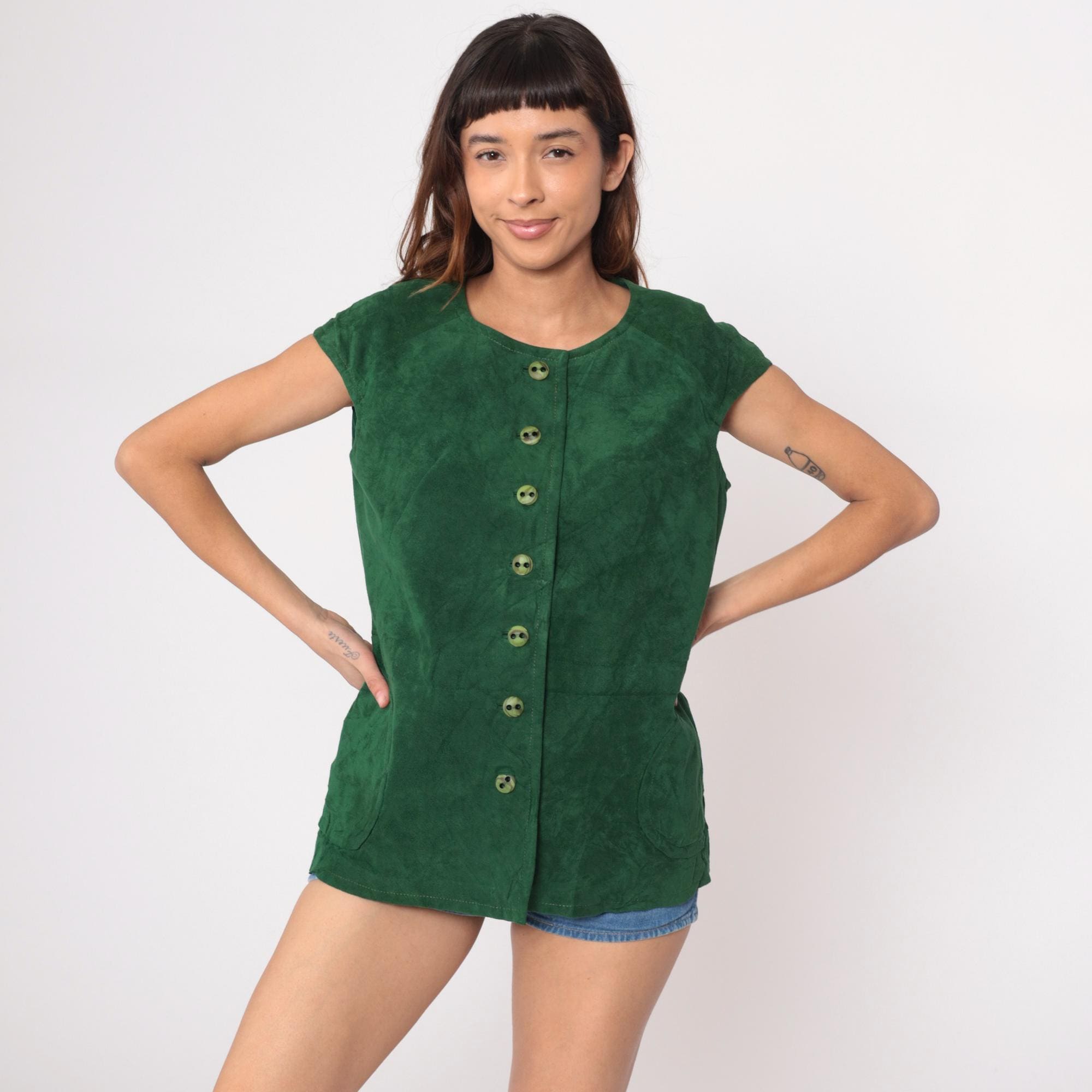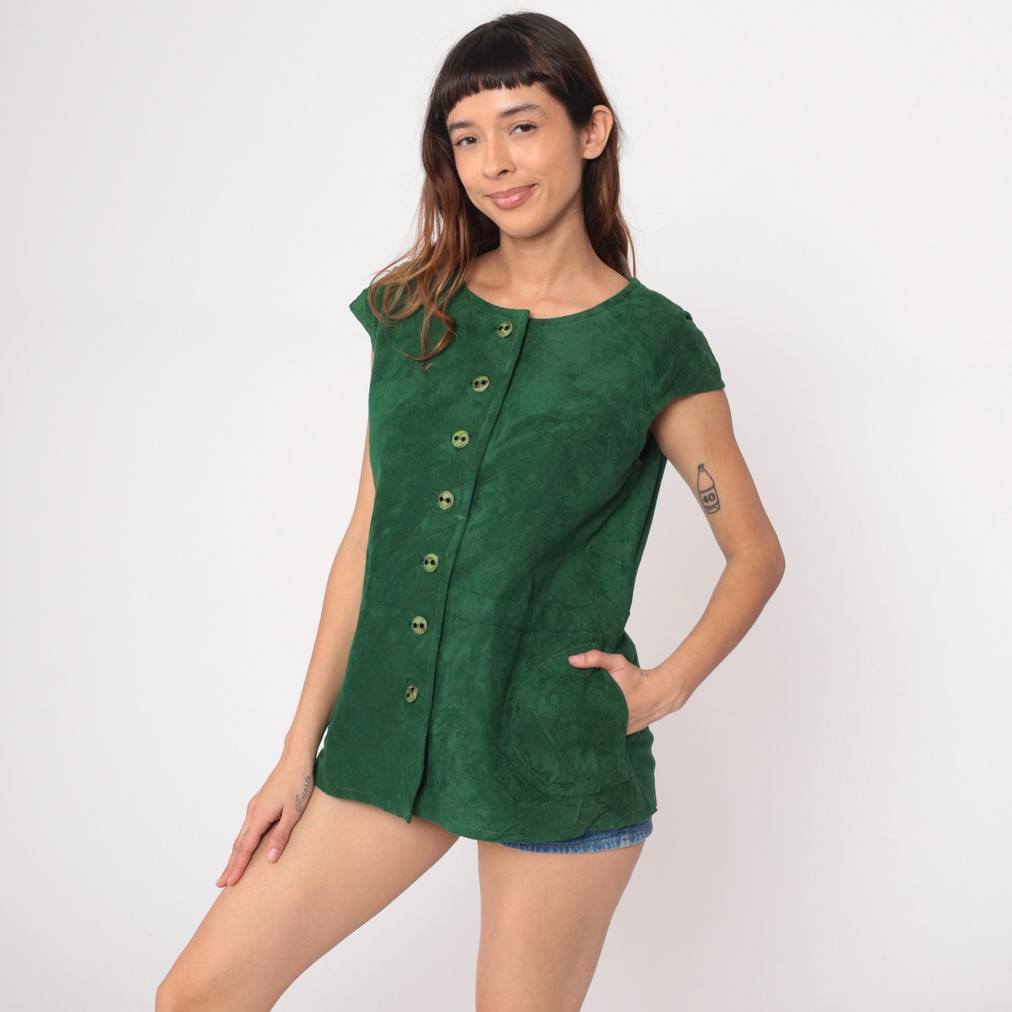 70s green tunic in faux suede with button-front closure and round scoop neckline. Seven matching green buttons down center front, short cap sleeves, relaxed boxy fit. Two patch pockets at hip.