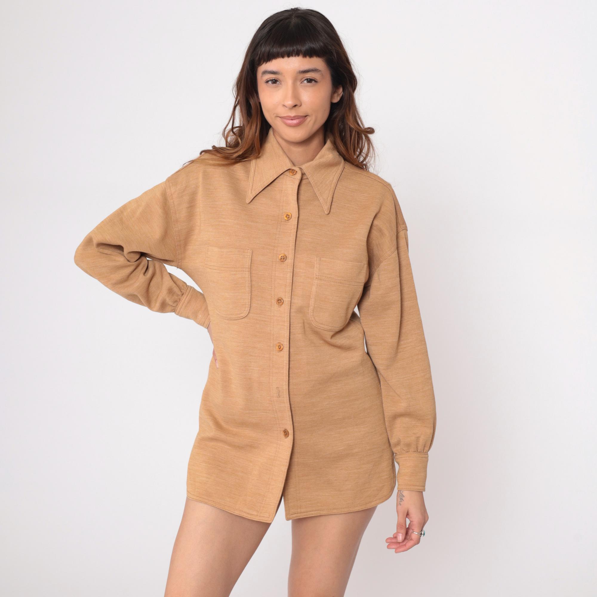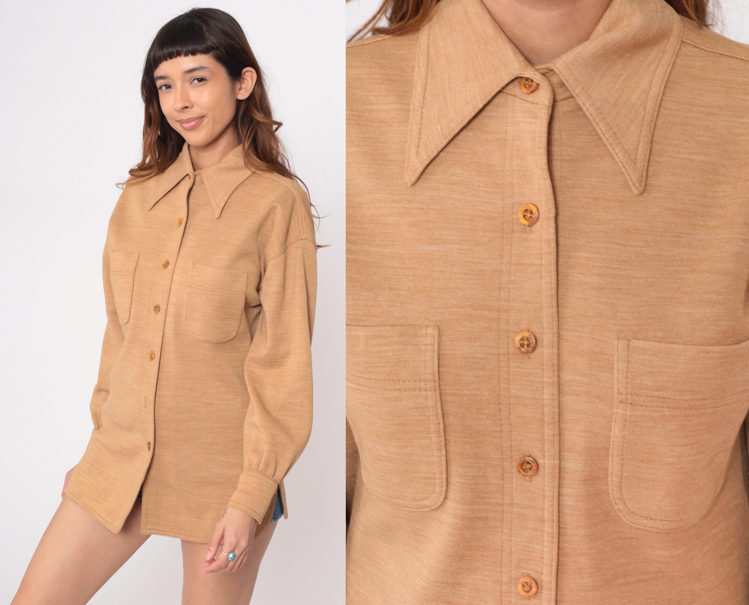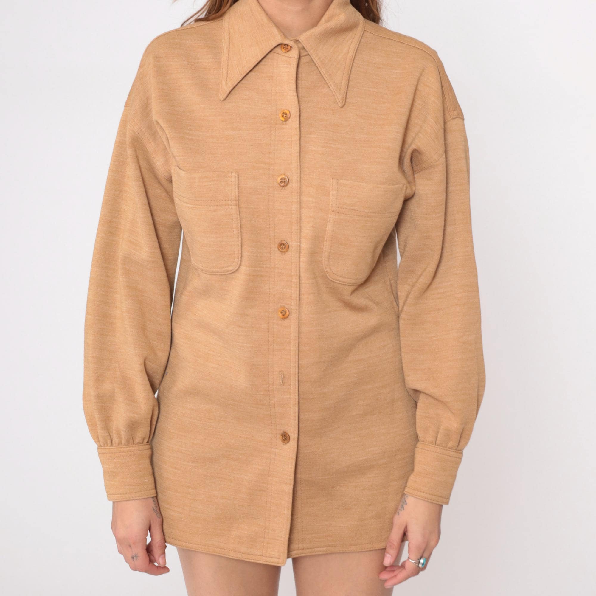 70s tan shirt jacket from act iii with pointed collar and button front closure. Two chest patch pockets, long sleeves with button cuffs. 55% polyester and 45% wool. Tagged act iii.