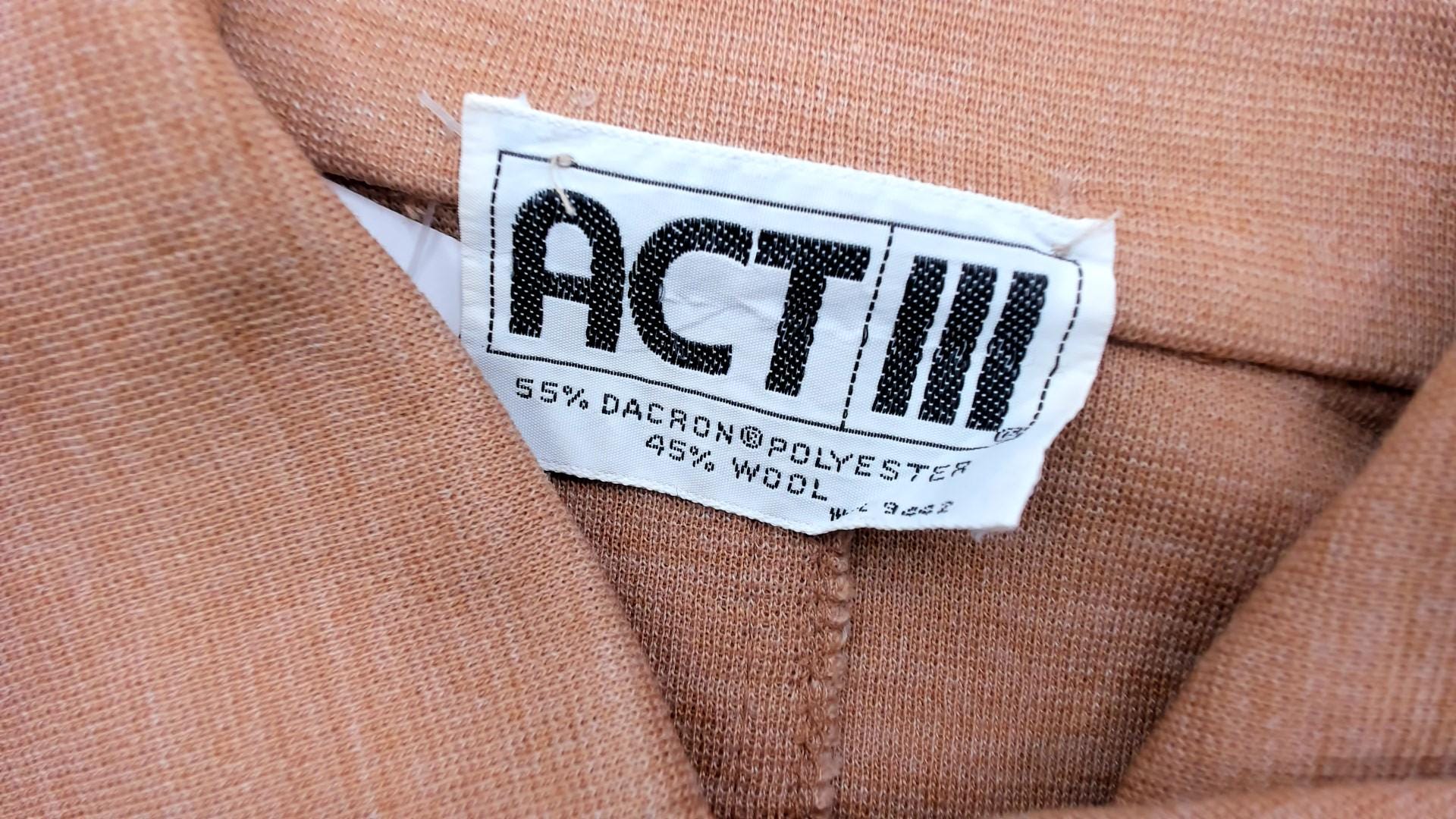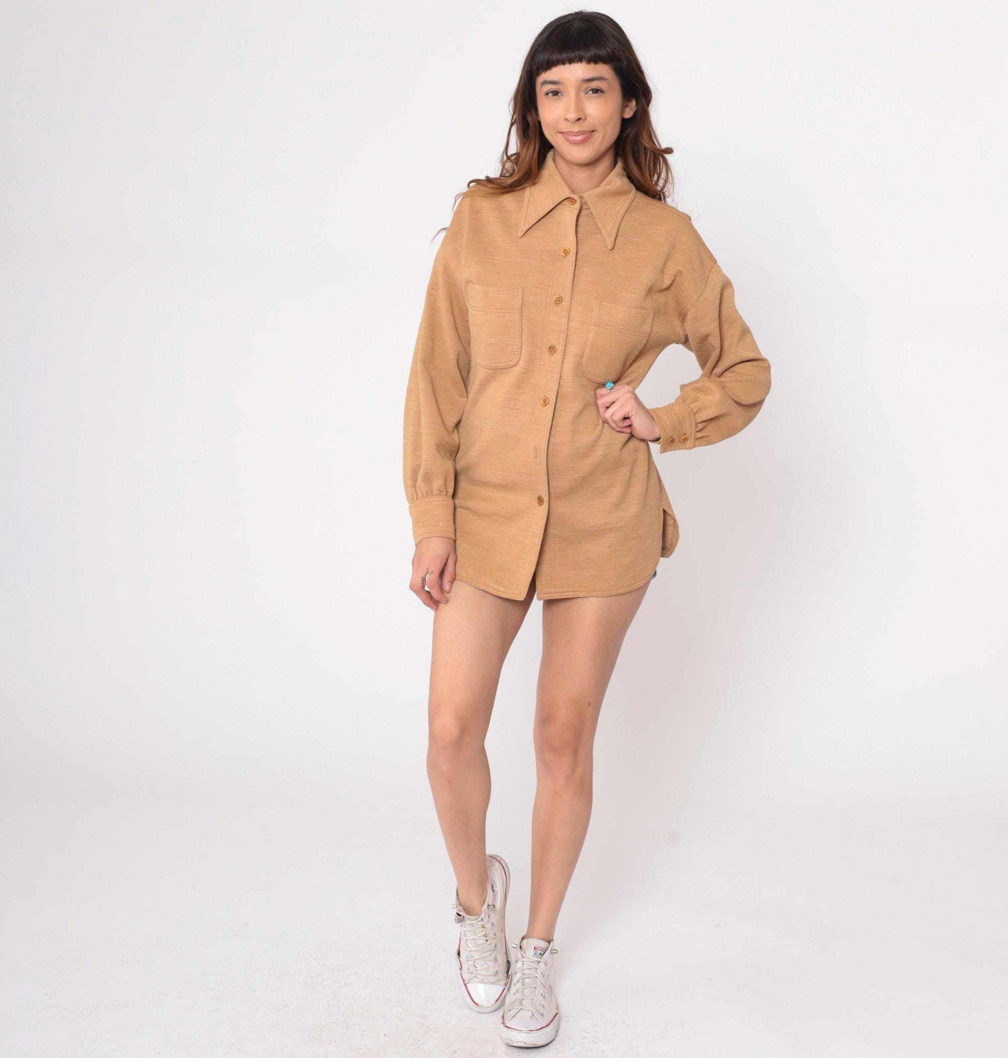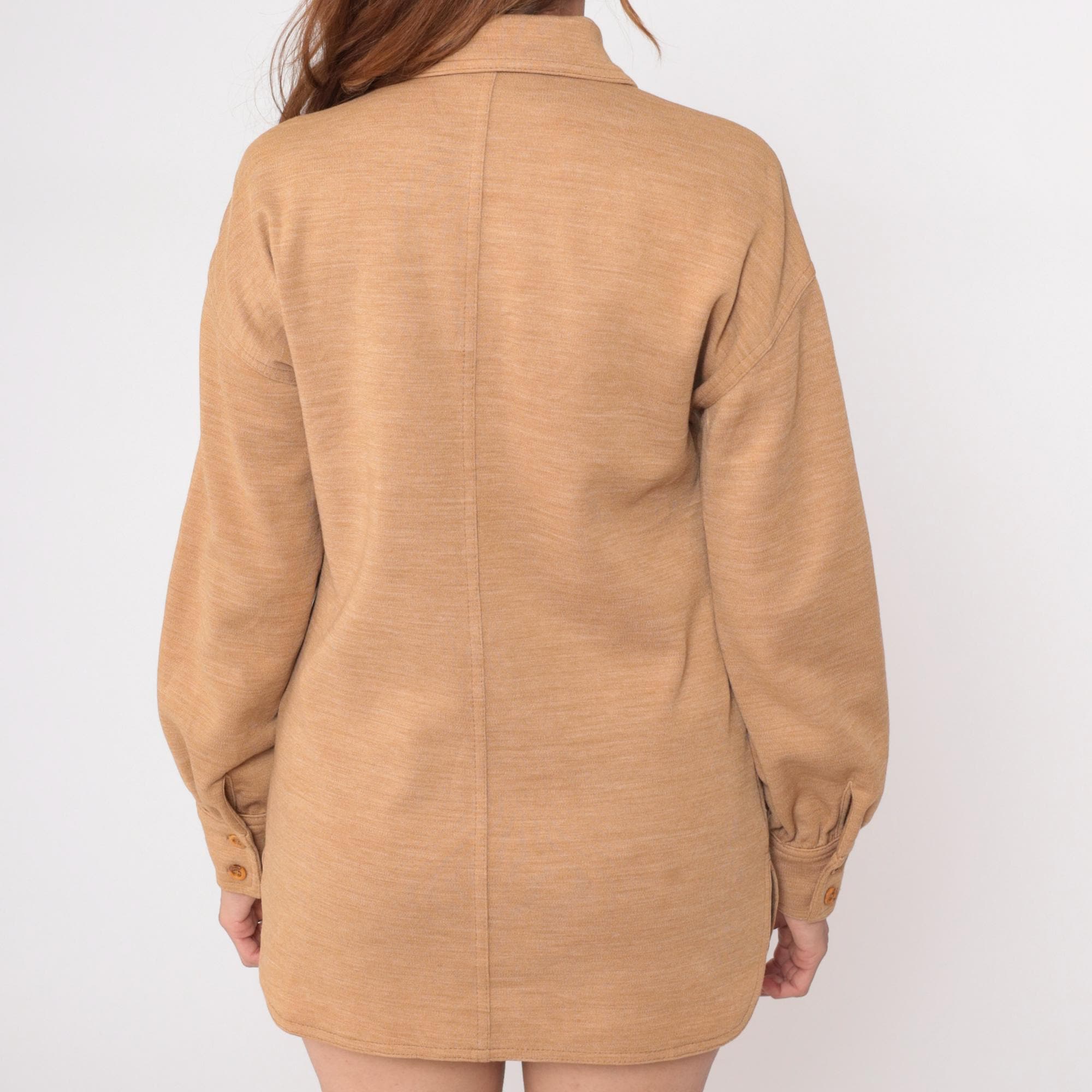 70s tan shirt jacket from act iii with pointed collar and button front closure. Two chest patch pockets, long sleeves with button cuffs. 55% polyester and 45% wool. Tagged act iii.