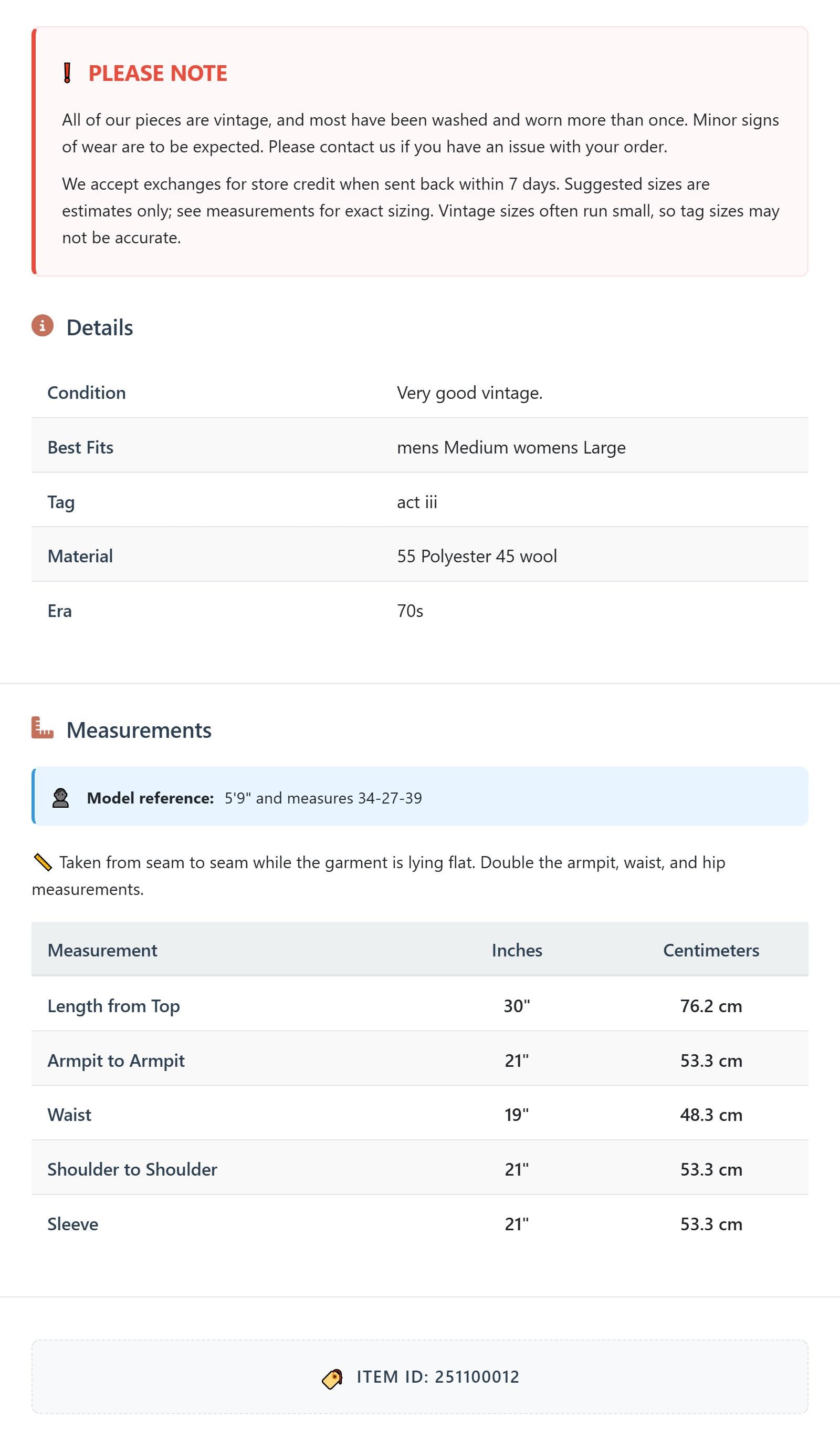 All of our pieces are vintage, and most have been washed and worn more than once. Minor signs of wear are to be expected. Please contact us if you have an issue with your order. We accept exchanges for store credit when sent back within 7 days.