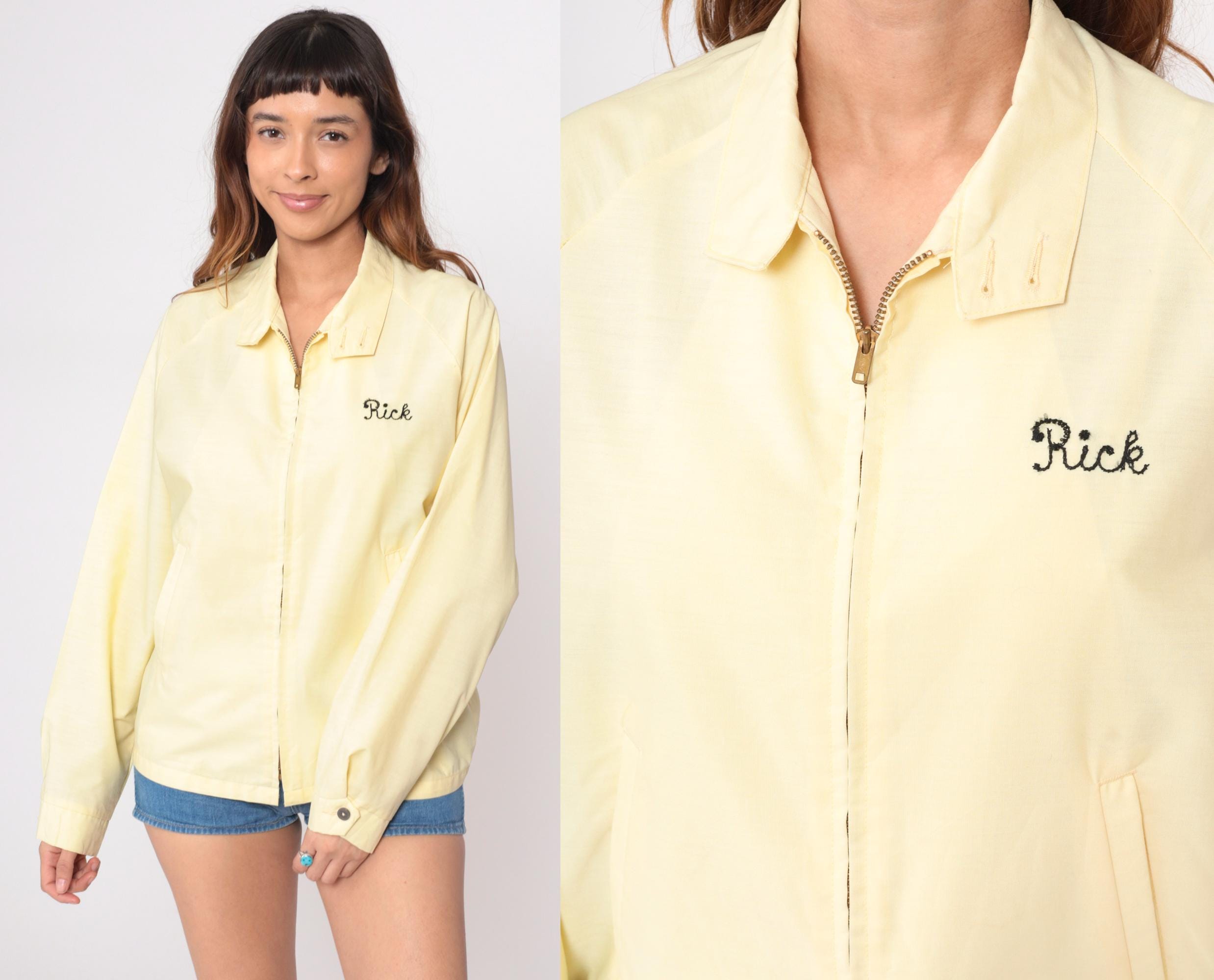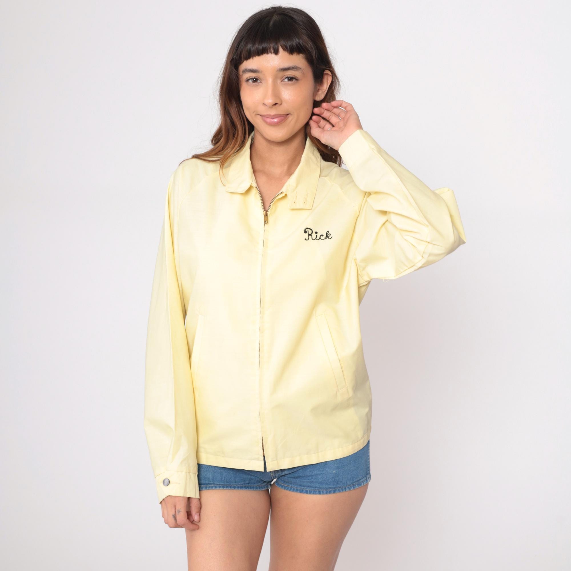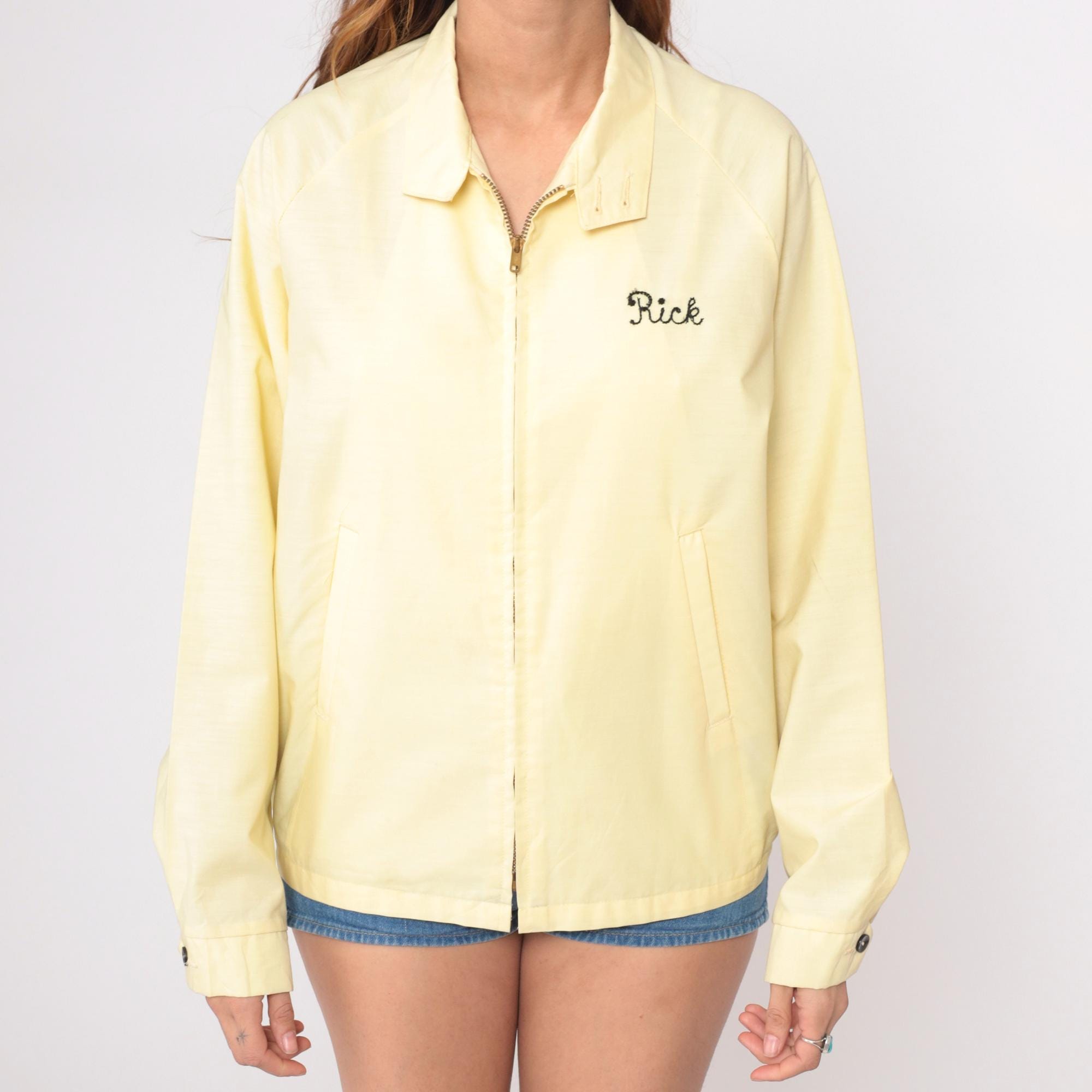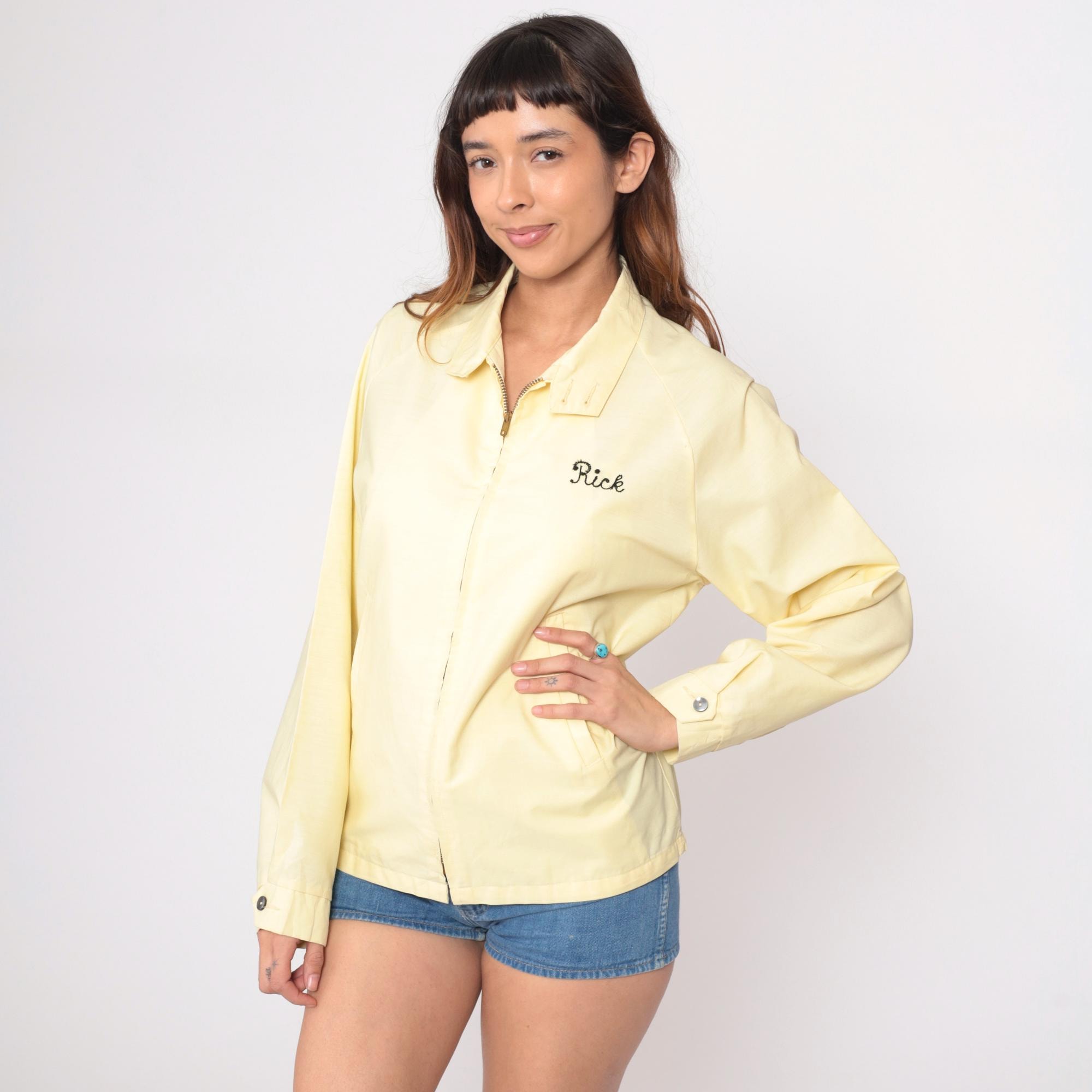 70s butter yellow work jacket from Towncraft JC Penney with "Rick" embroidered in script on the left chest and "Bishops S.W.L.A." embroidered in gothic lettering across the back. Zip front closure with collar, two front slash pockets, and long sleeves with button cuffs. Cotton and polyester blend. Tagged Towncraft JC Penney.