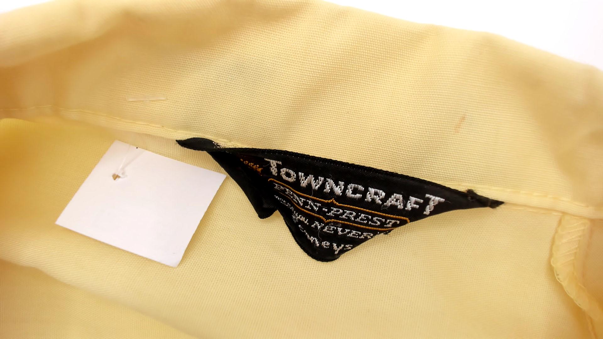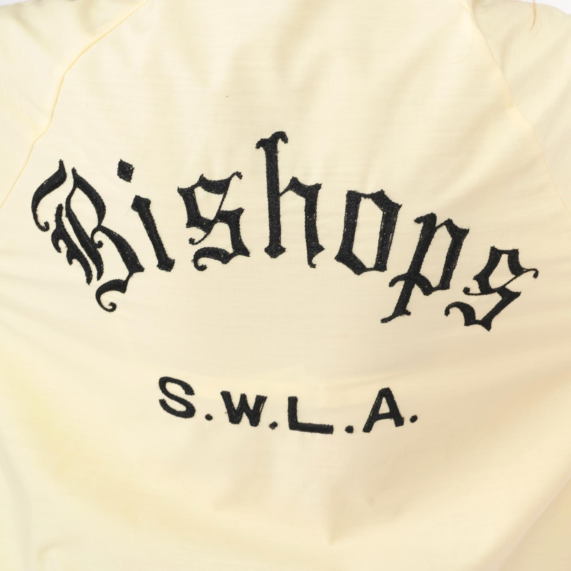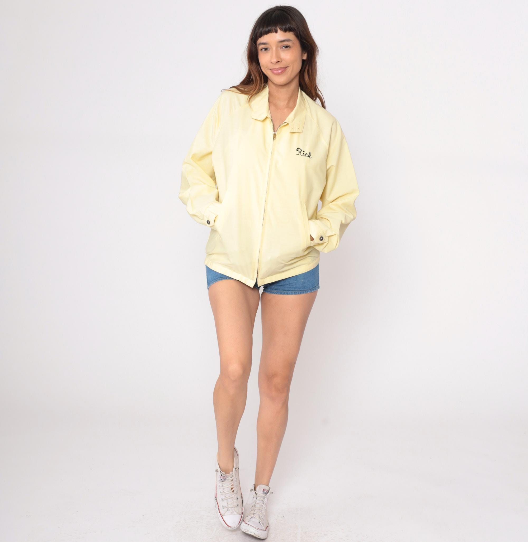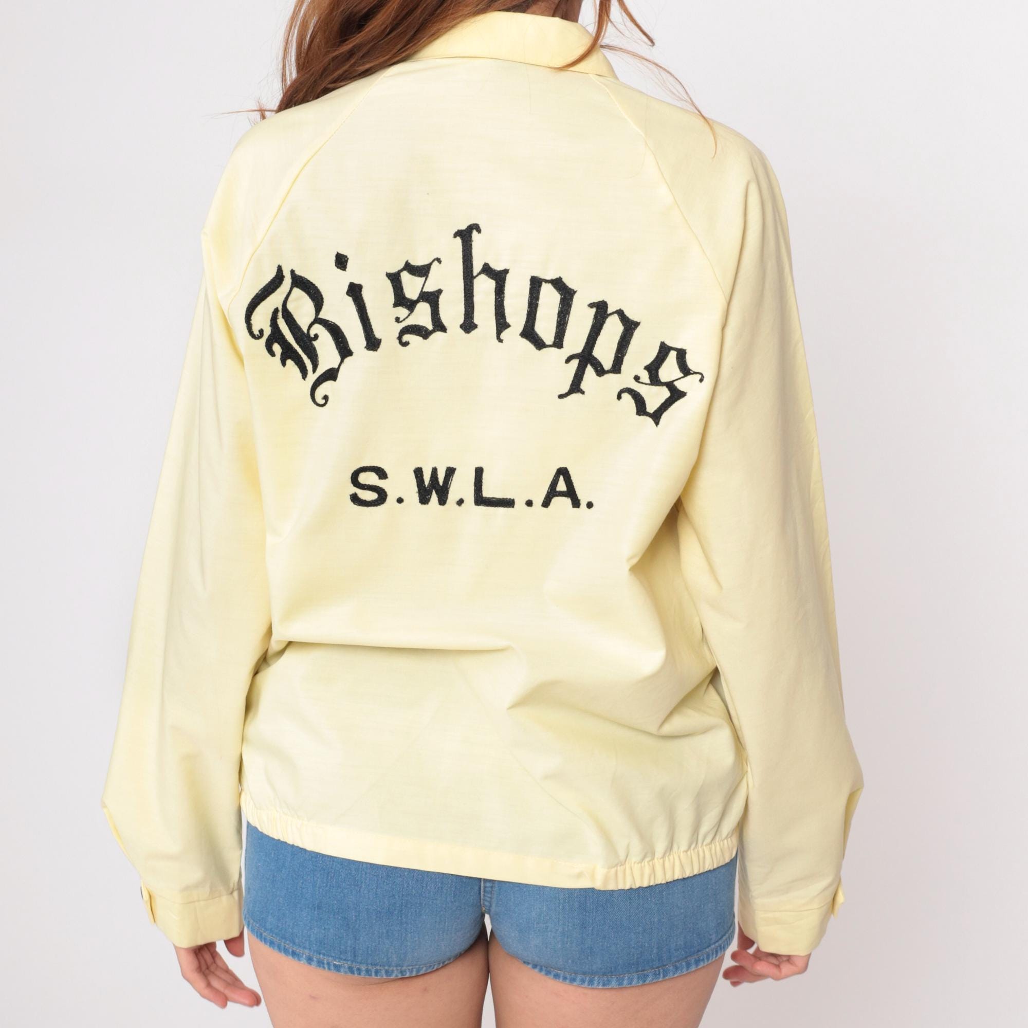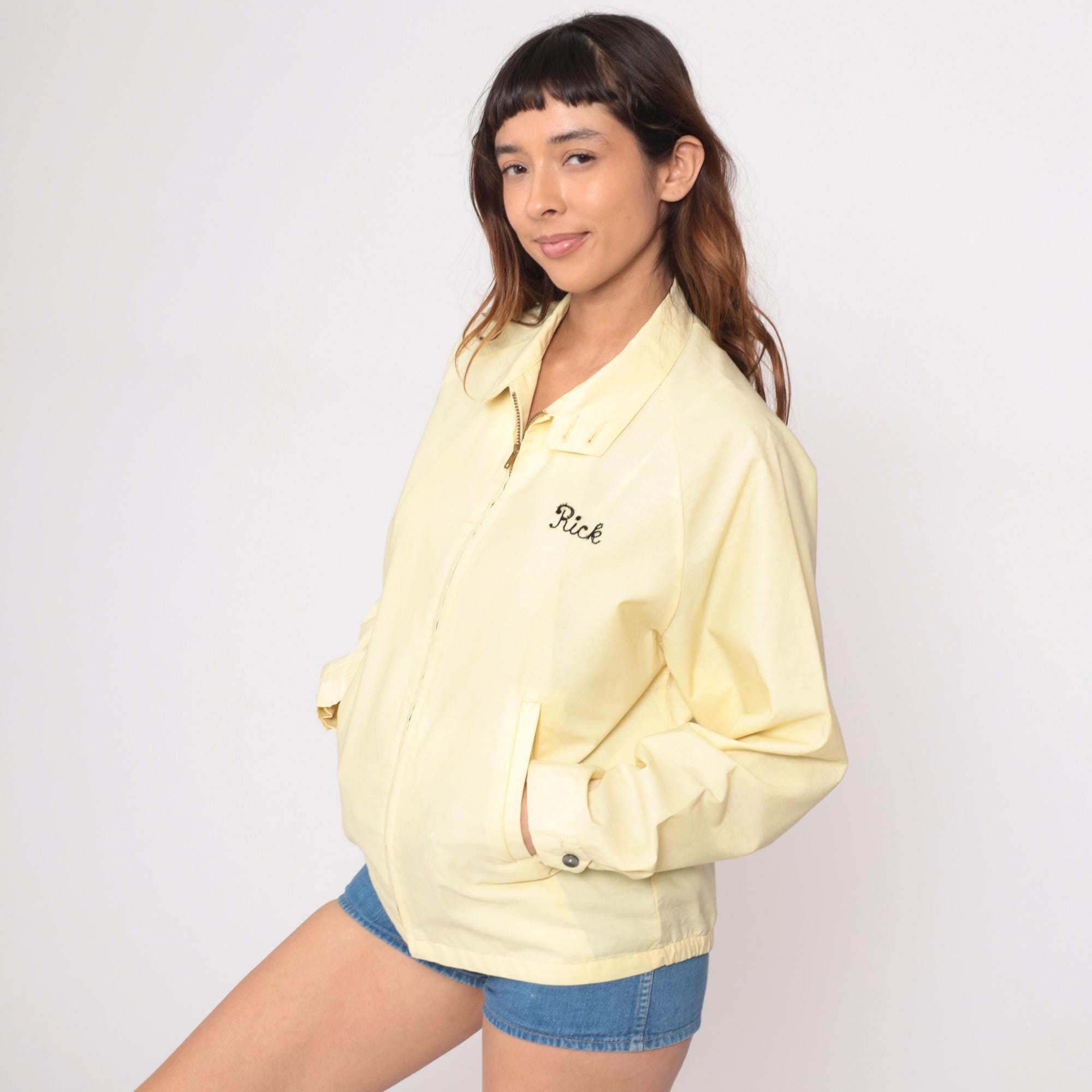 70s butter yellow work jacket from Towncraft JC Penney with "Rick" embroidered in script on the left chest and "Bishops S.W.L.A." embroidered in gothic lettering across the back. Zip front closure with collar, two front slash pockets, and long sleeves with button cuffs. Cotton and polyester blend. Tagged Towncraft JC Penney.