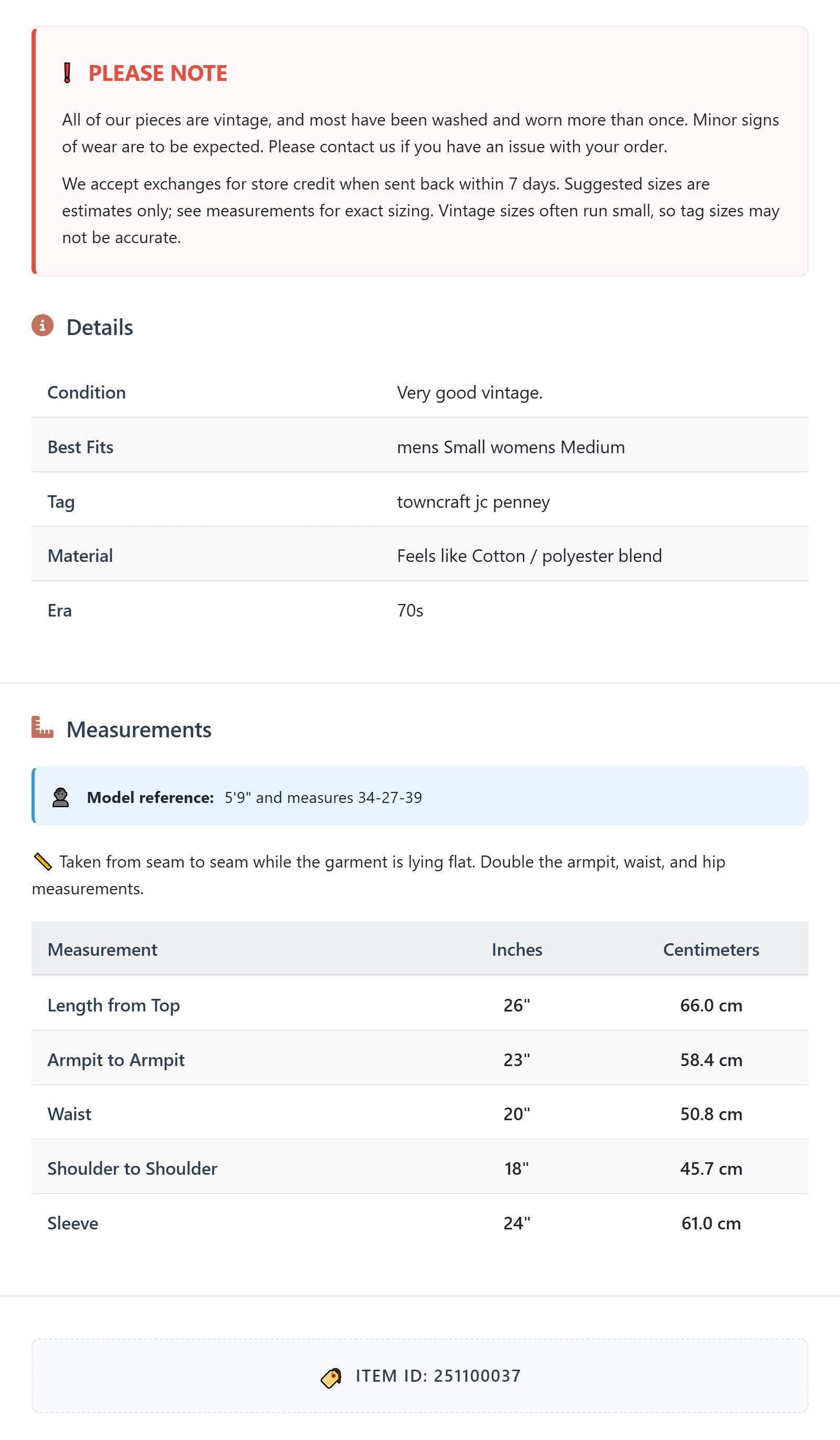 All of our pieces are vintage, and most have been washed and worn more than once. Minor signs of wear are to be expected. Please contact us if you have an issue with your order. We accept exchanges for store credit when sent back within 7 days.