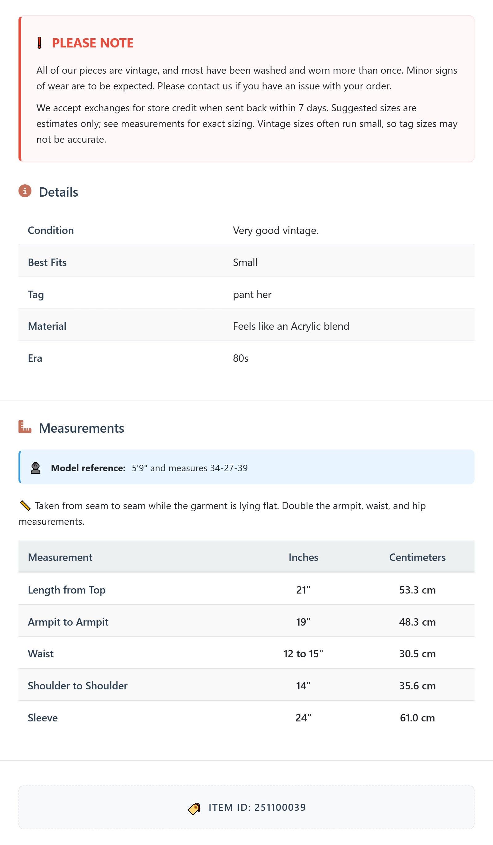 Suggested sizes are estimates only; see measurements for exact sizing. Vintage sizes often run small, so tag sizes may not be accurate.