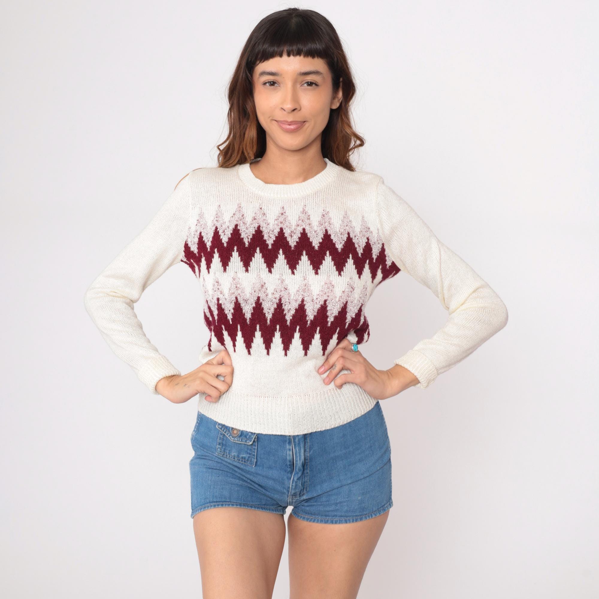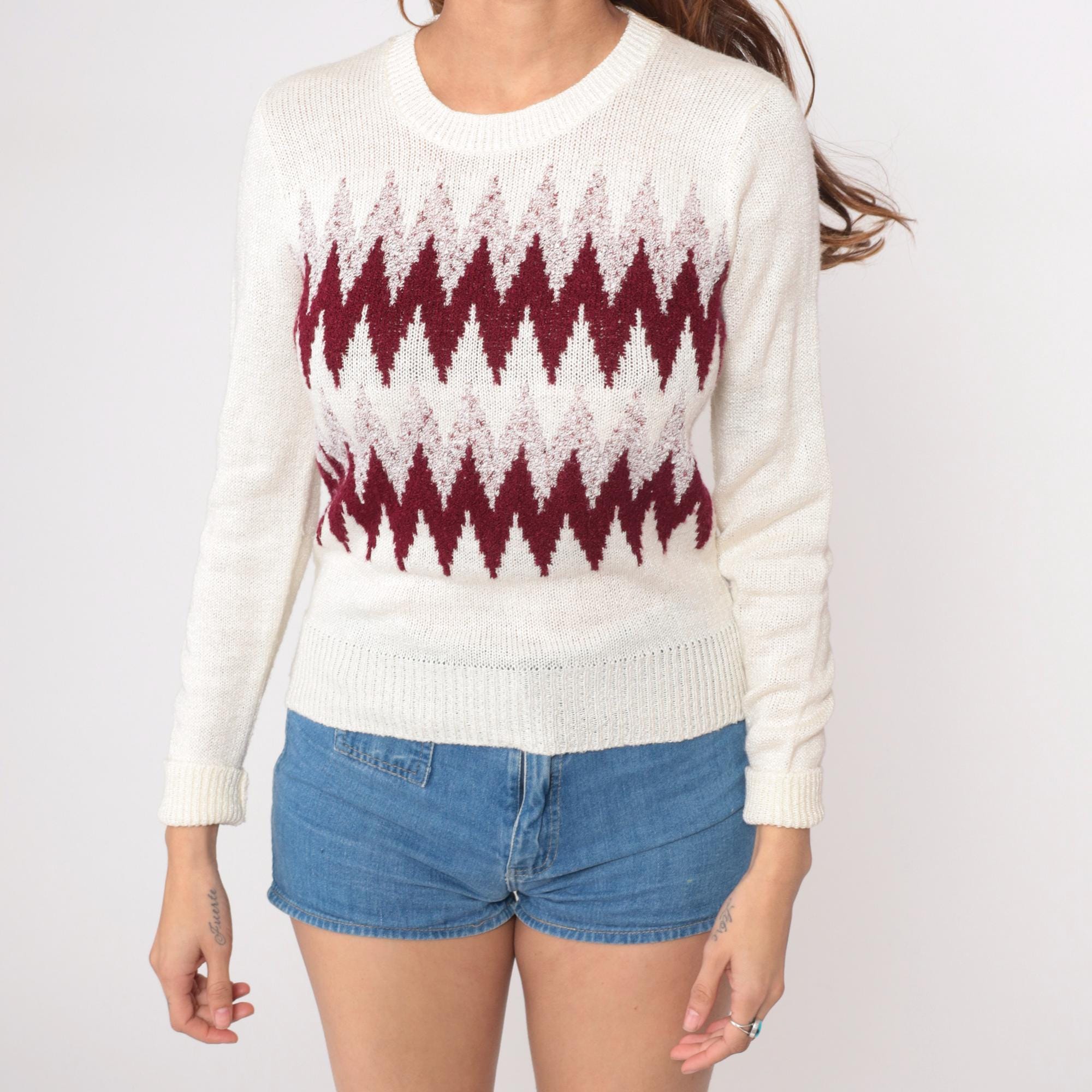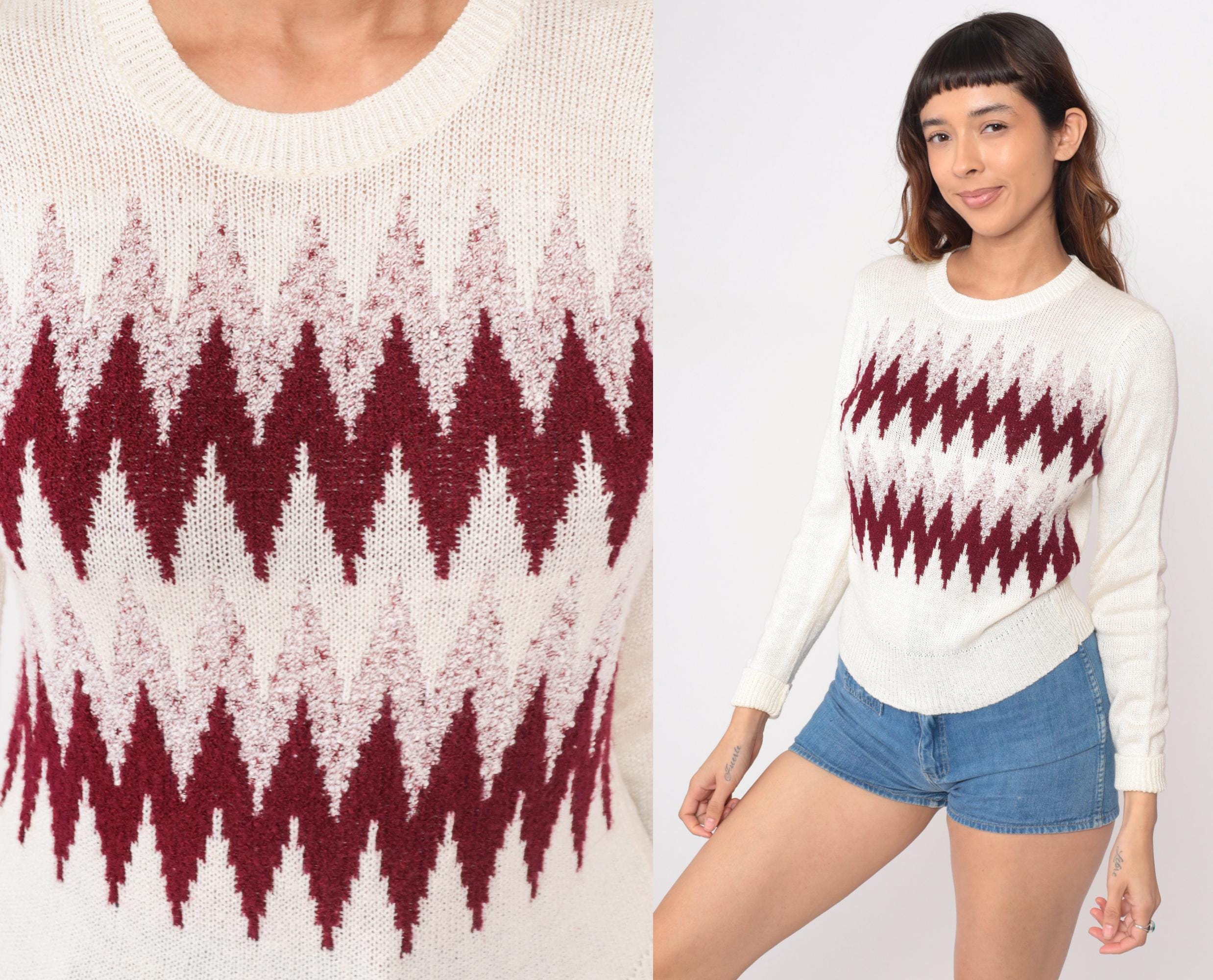 80s cream sweater with burgundy and mauve geometric diamond pattern in two horizontal bands across the chest. Crew neckline, long sleeves, ribbed trim at neckline, cuffs, and hem. Acrylic blend. Tagged panther.