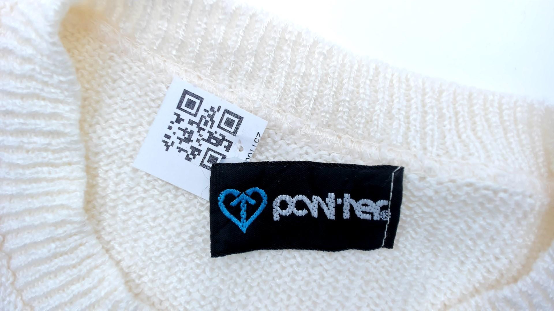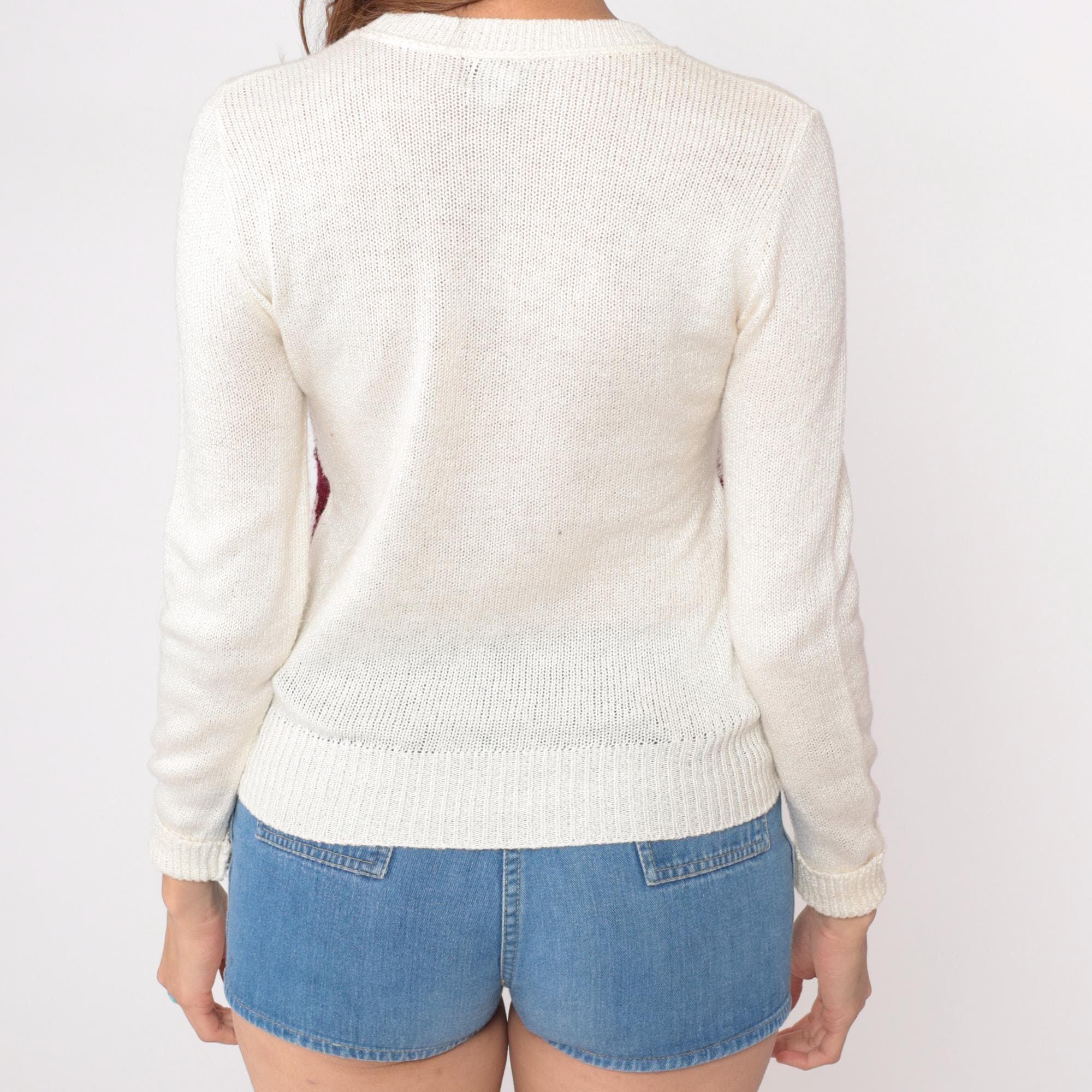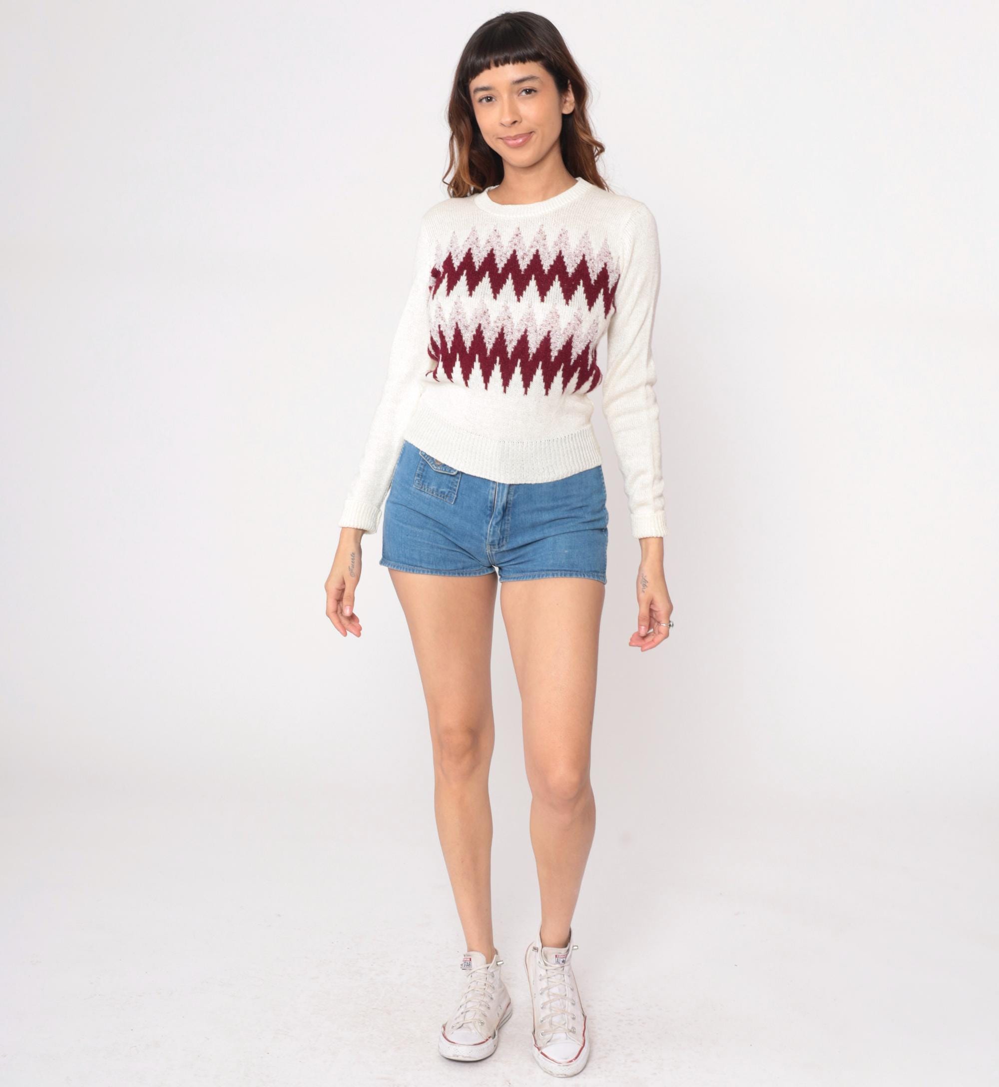 80s cream sweater with burgundy and mauve geometric diamond pattern in two horizontal bands across the chest. Crew neckline, long sleeves, ribbed trim at neckline, cuffs, and hem. Acrylic blend. Tagged panther.