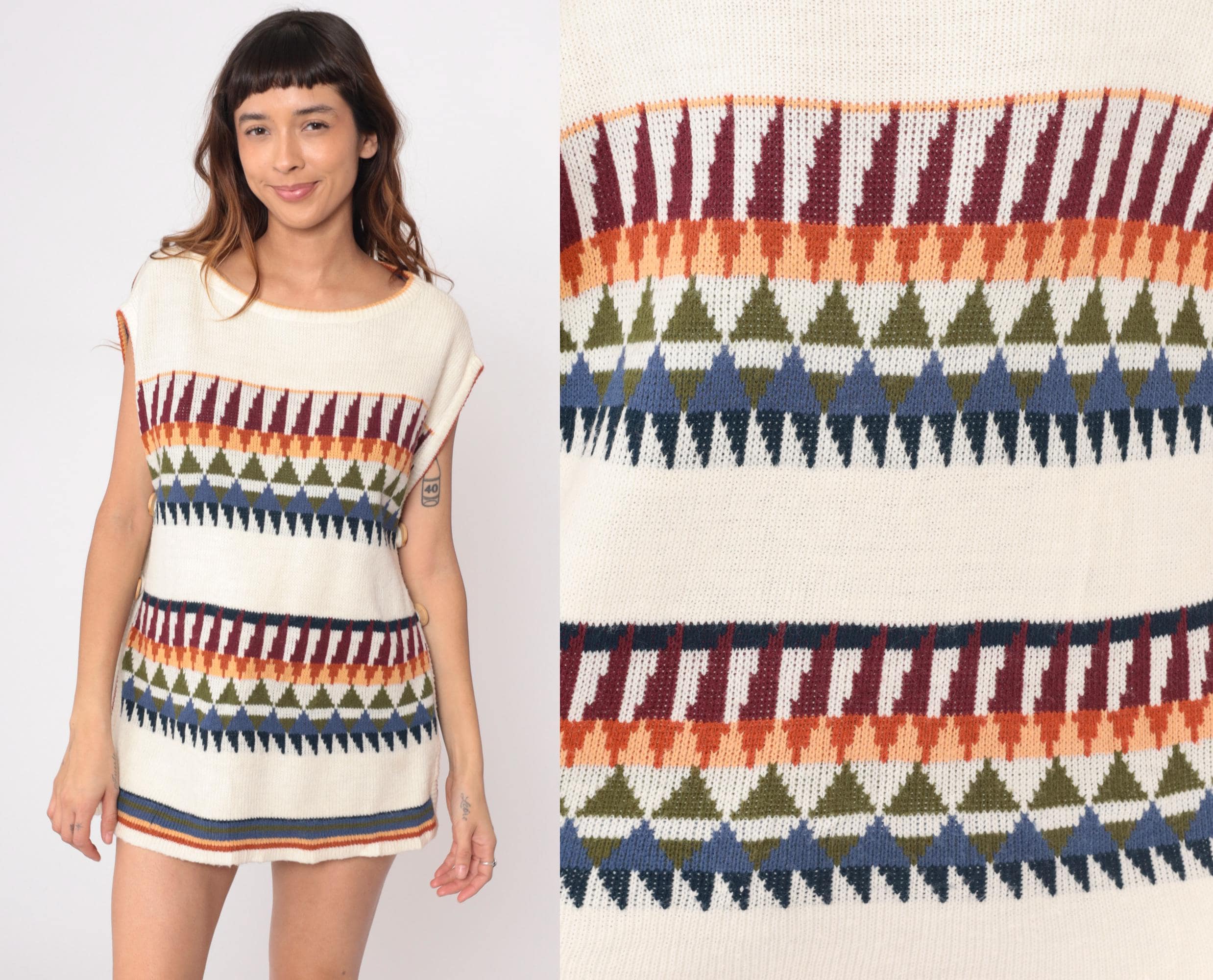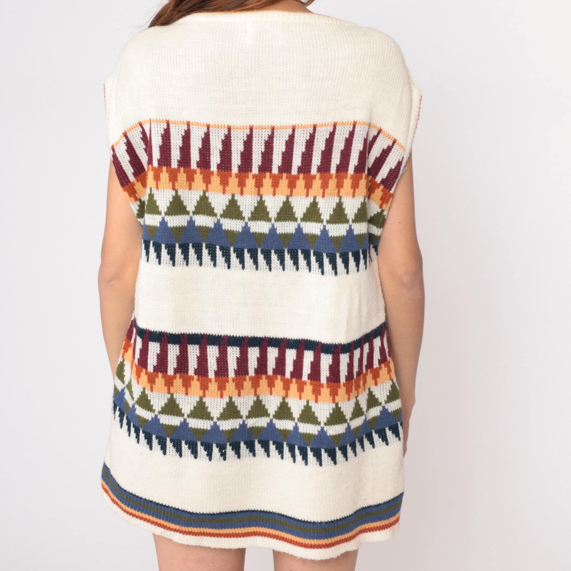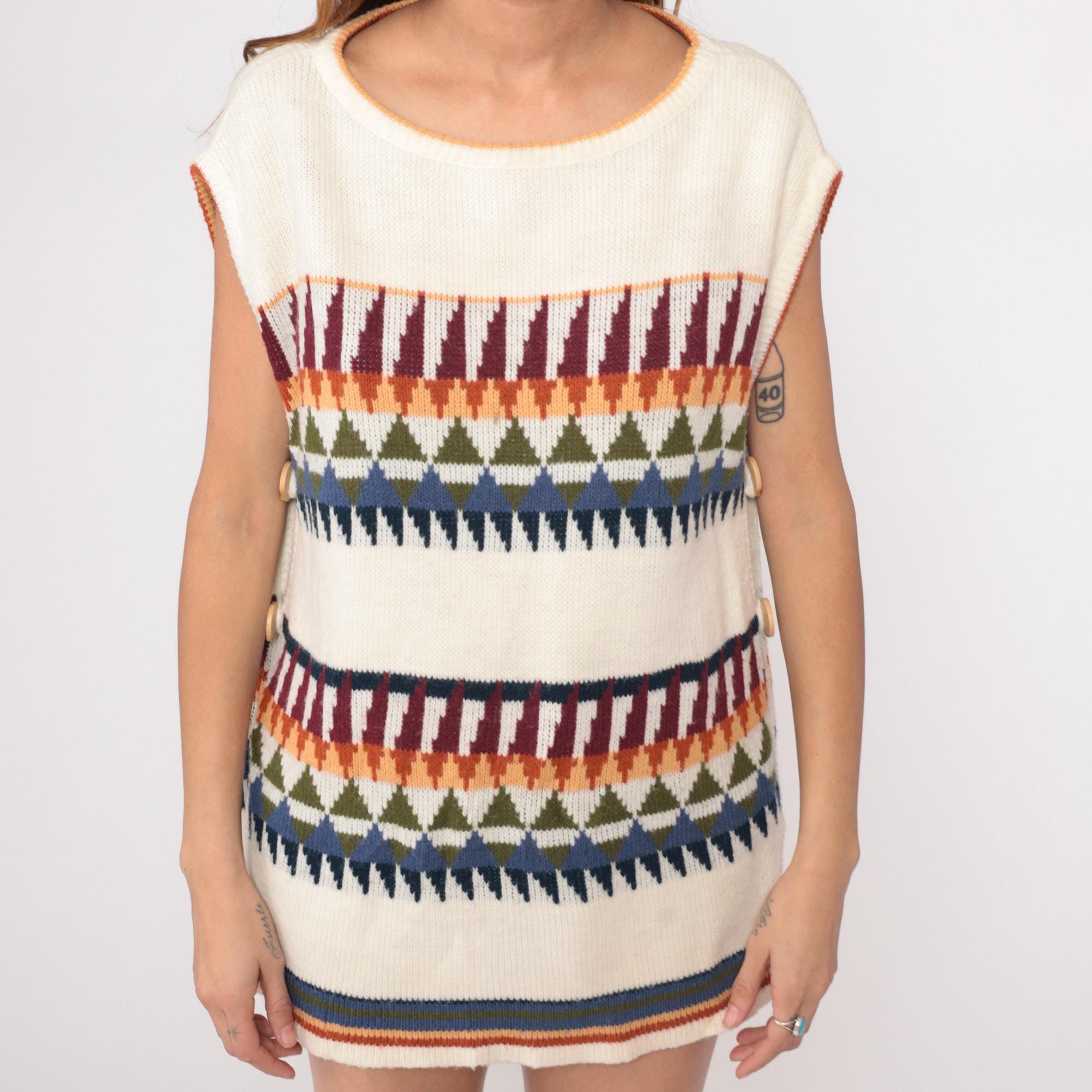 70s cream knit sleeveless tunic from Herald Place with geometric triangular pattern bands in burgundy, orange, olive green, blue, and navy. Two bands of the triangular pattern across the chest and lower body with solid cream areas between. Ribbed scoop neckline, armholes, and striped ribbed hem detail.