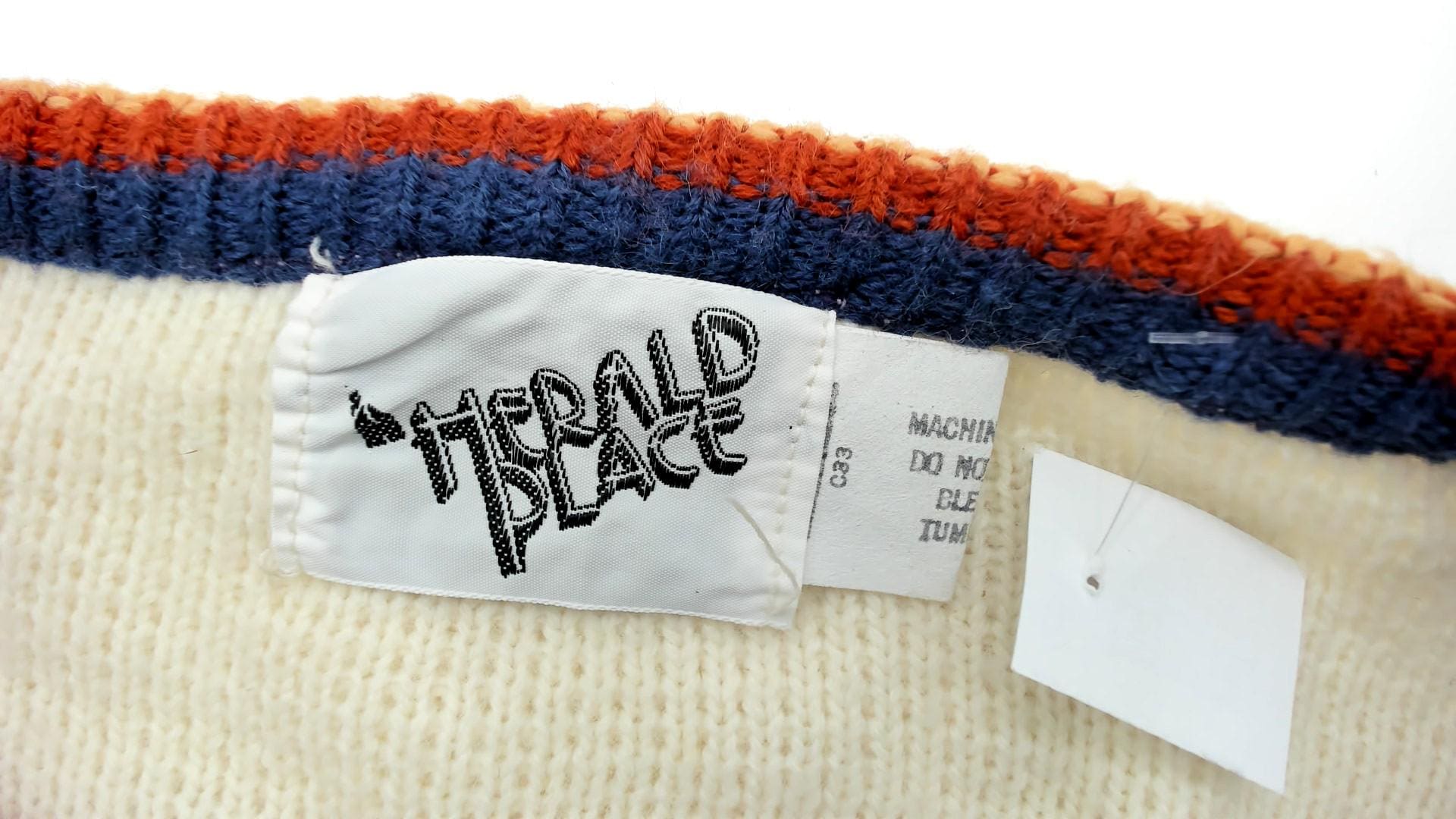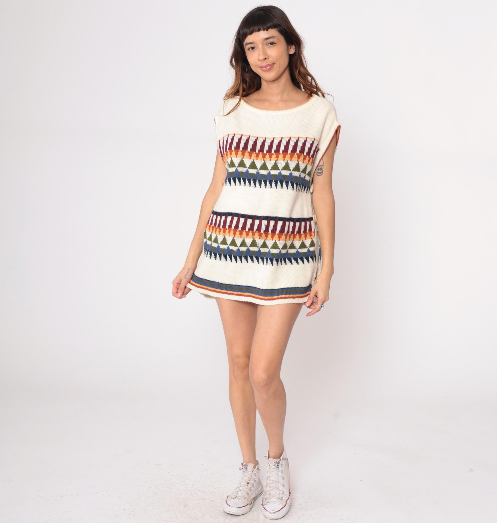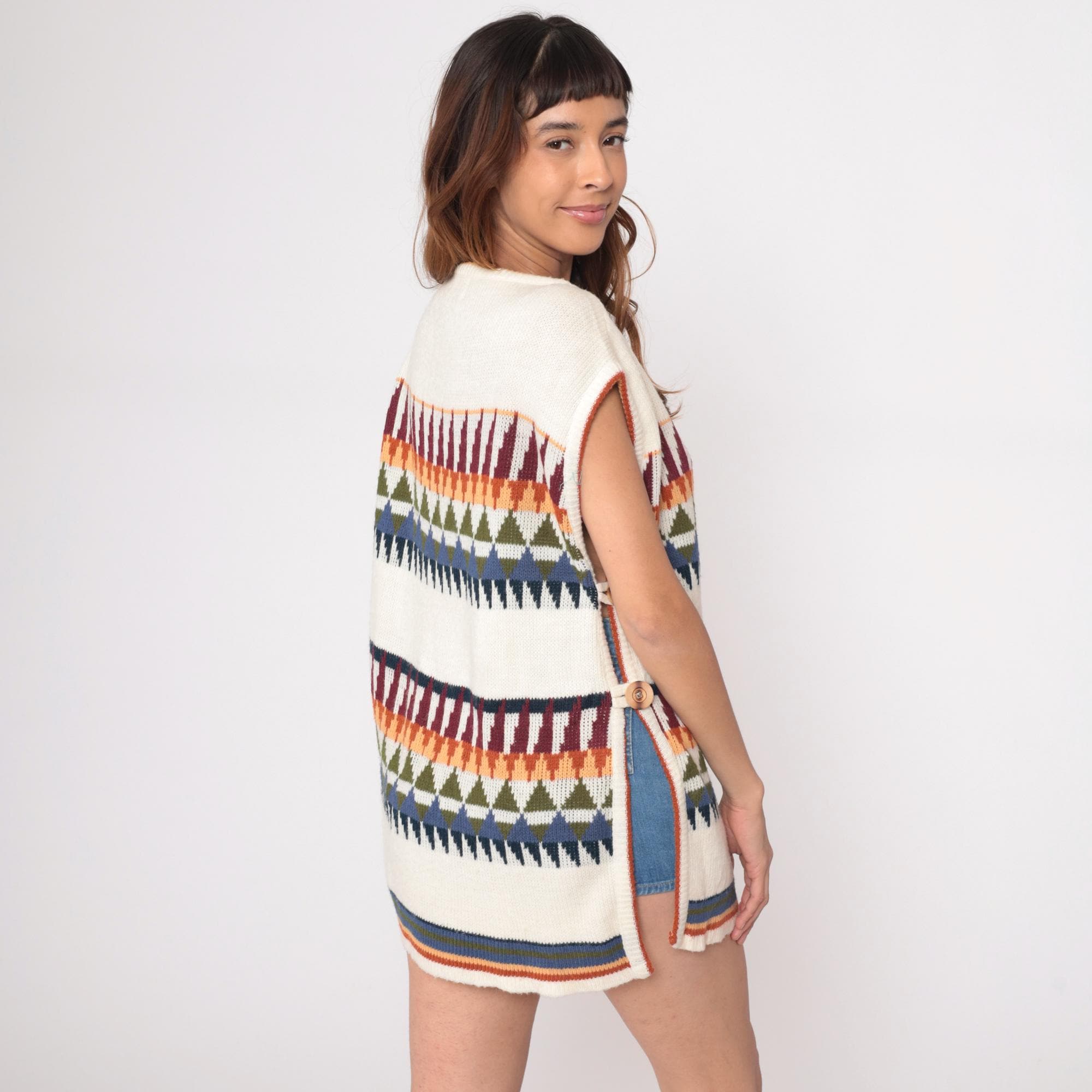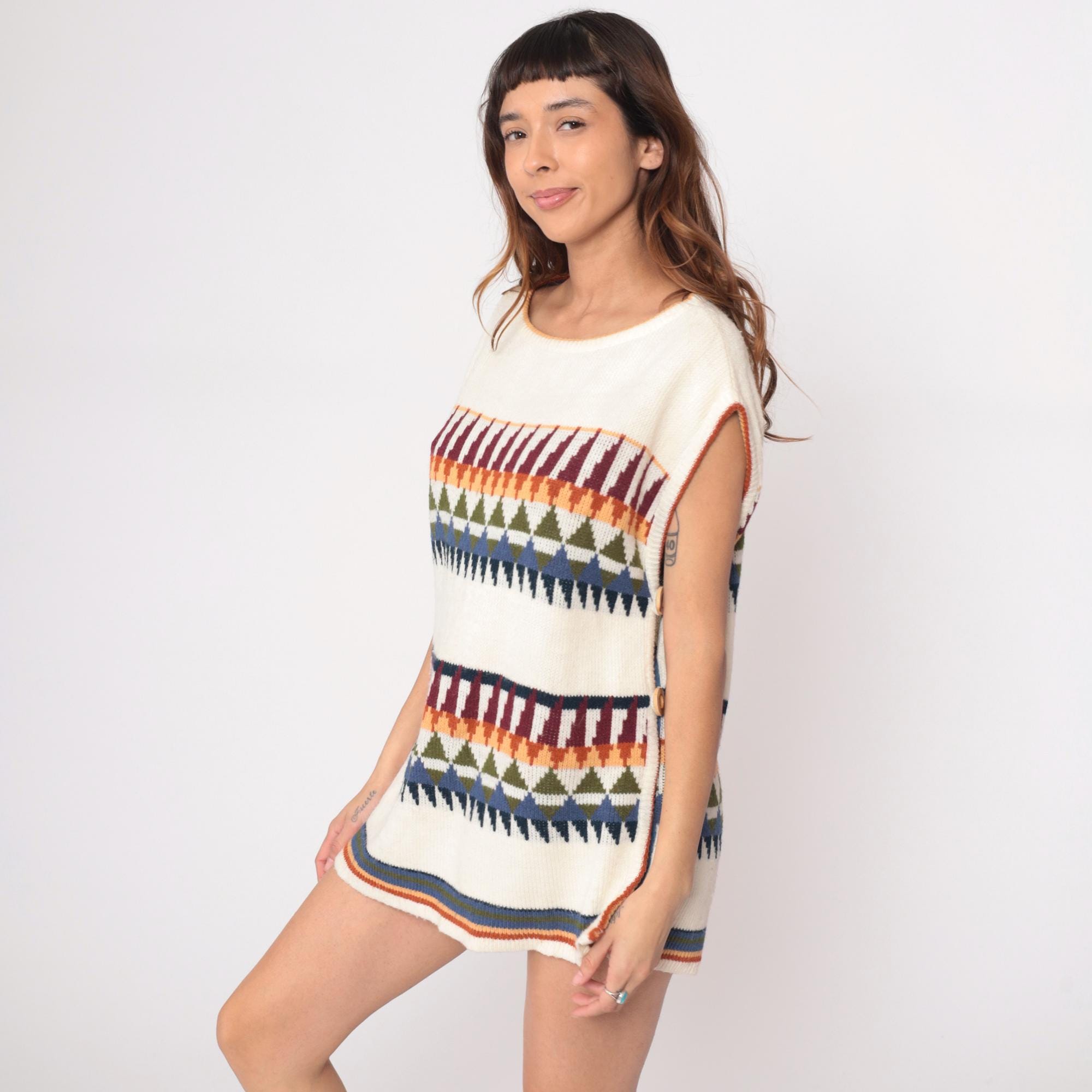 70s cream knit sleeveless tunic from Herald Place with geometric triangular pattern bands in burgundy, orange, olive green, blue, and navy. Two bands of the triangular pattern across the chest and lower body with solid cream areas between. Ribbed scoop neckline, armholes, and striped ribbed hem detail.