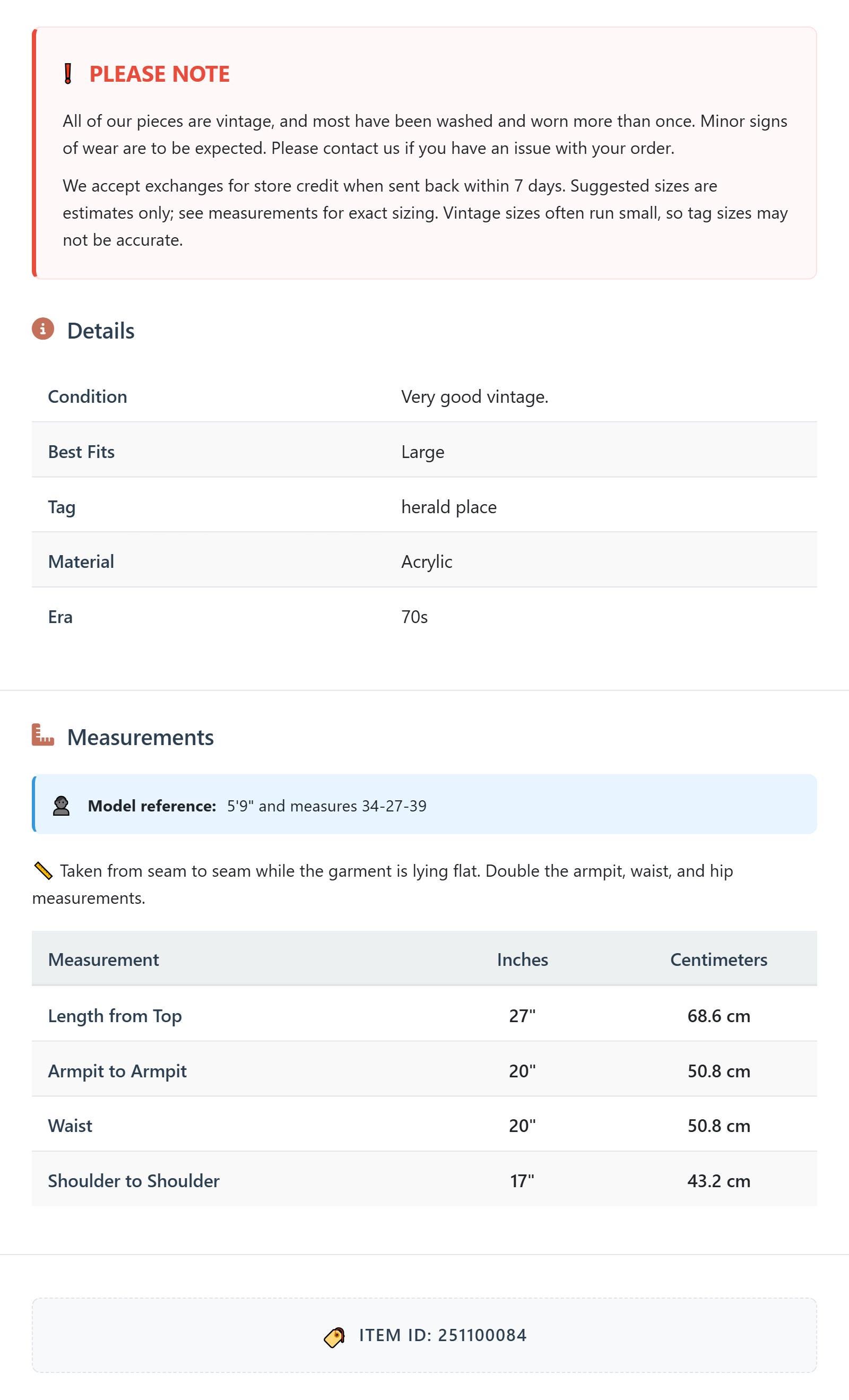 All of our pieces are vintage, and most have been washed and worn more than once. Minor signs of wear are to be expected. Please contact us if you have an issue with your order. We accept exchanges for store credit when sent back within 7 days.