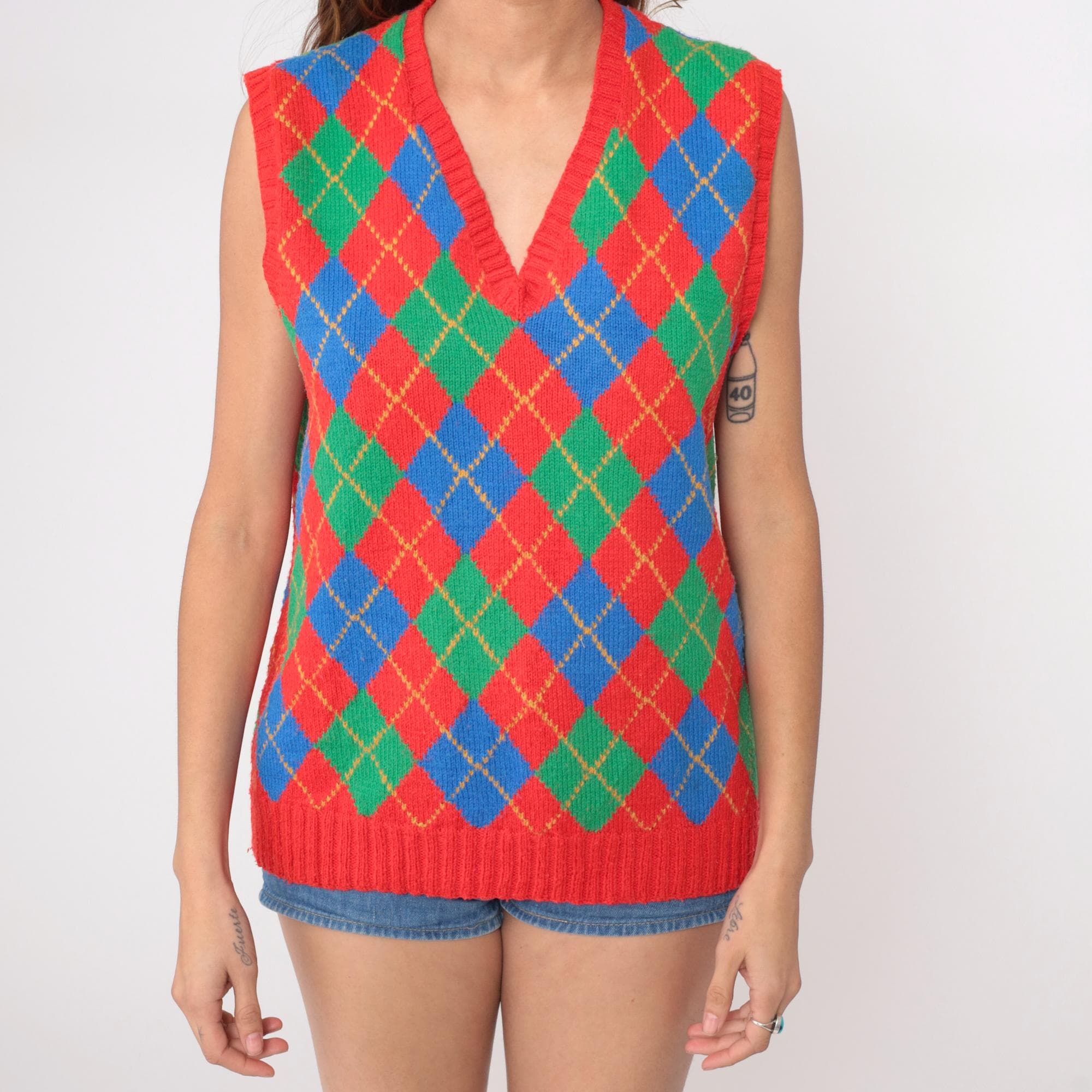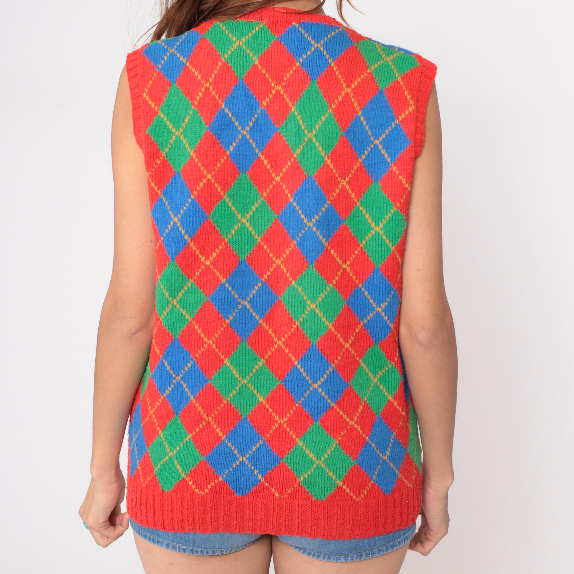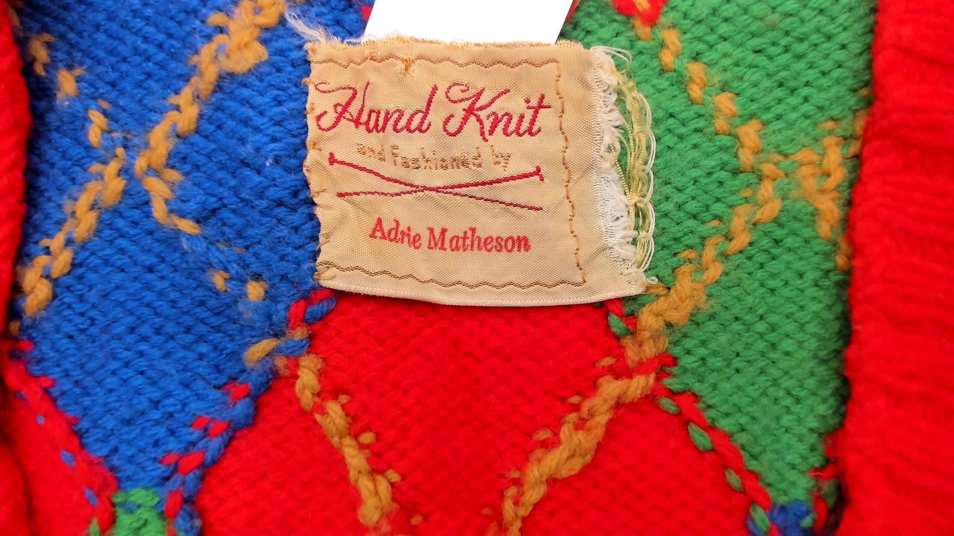 80s hand knit argyle sweater vest from Adrie Matheson with red, blue, green, and yellow diamond pattern across the front and back. V-neck with ribbed trim at neckline, armholes, and hem. Sleeveless pullover style. Acrylic.