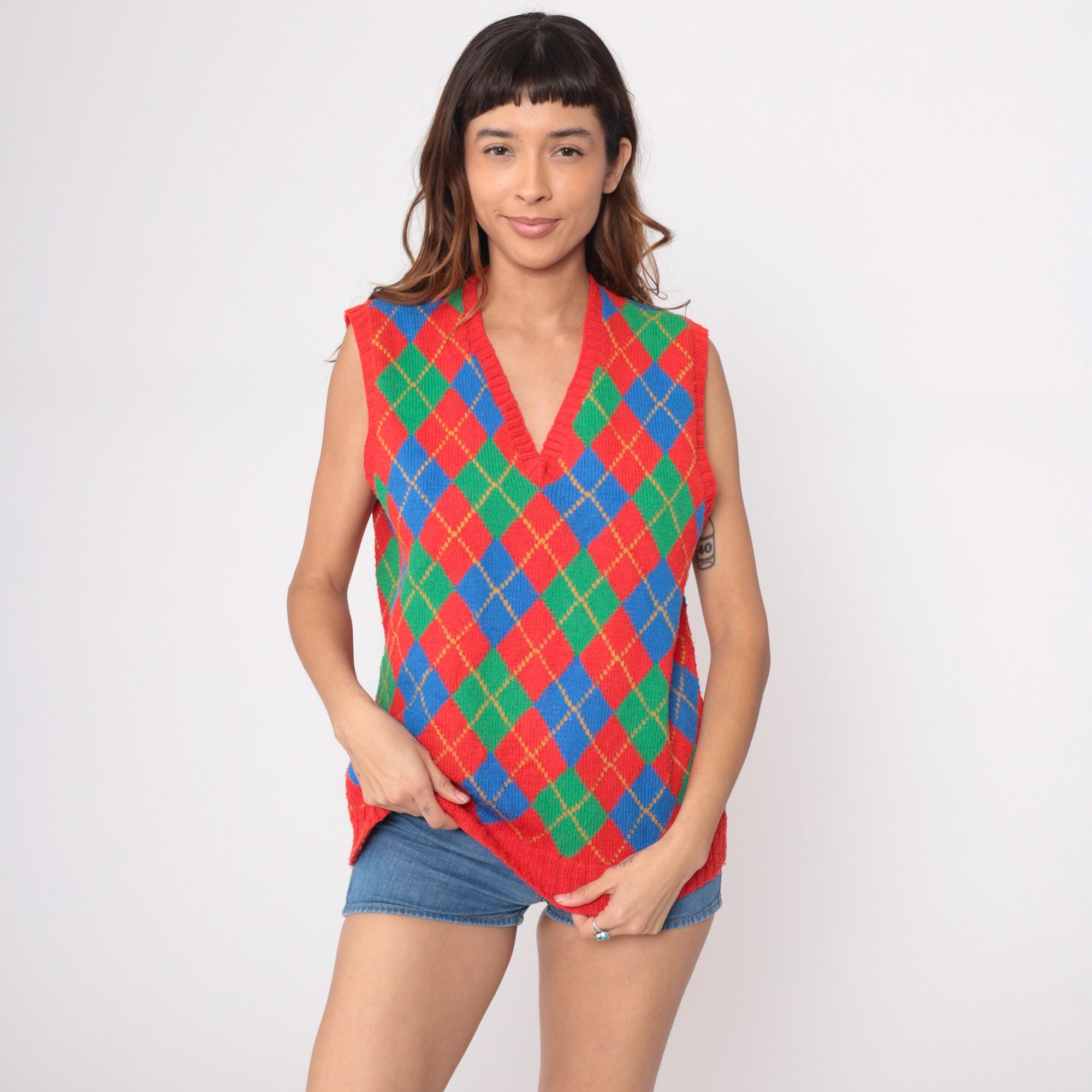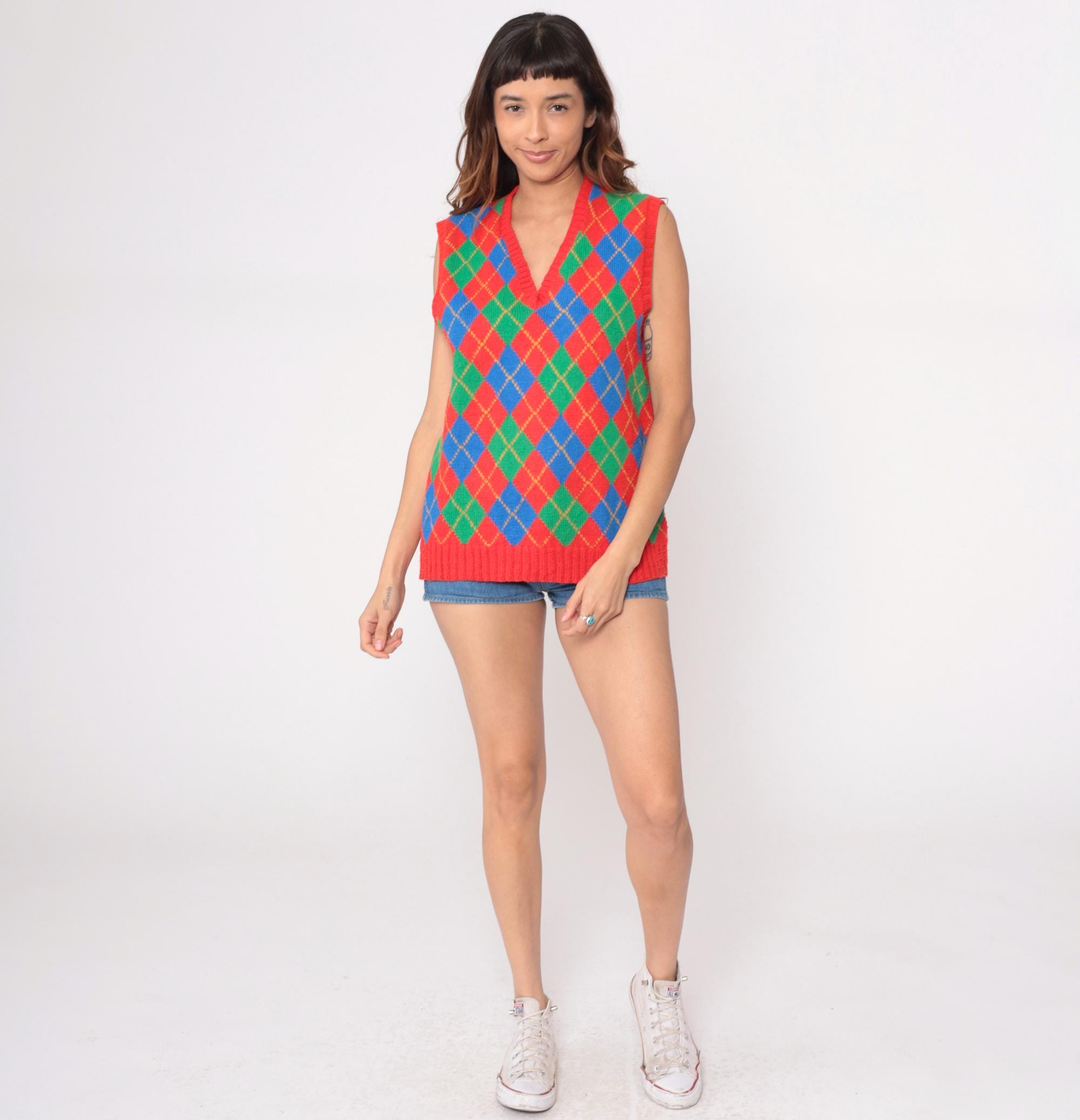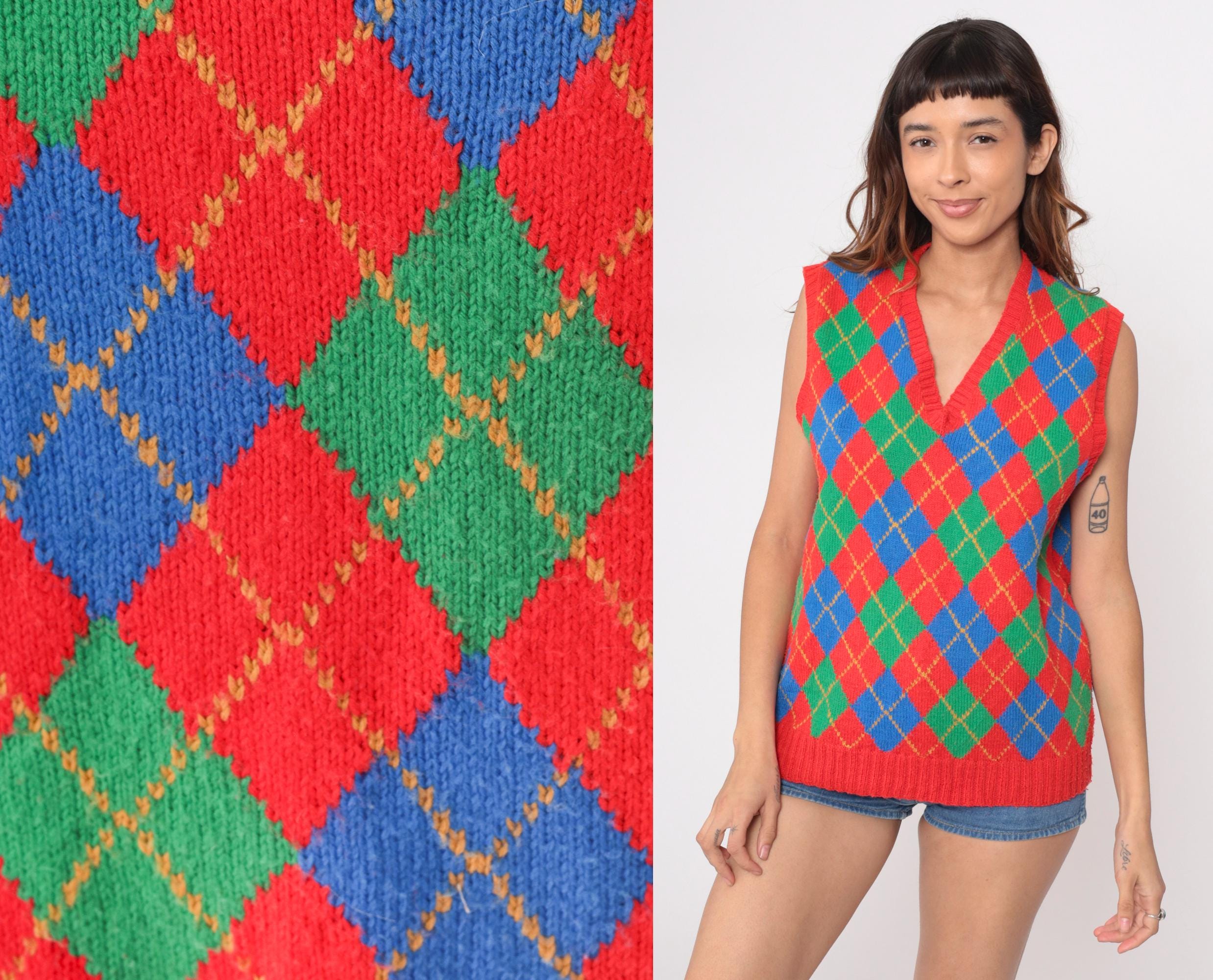 80s hand knit argyle sweater vest from Adrie Matheson with red, blue, green, and yellow diamond pattern across the front and back. V-neck with ribbed trim at neckline, armholes, and hem. Sleeveless pullover style. Acrylic.