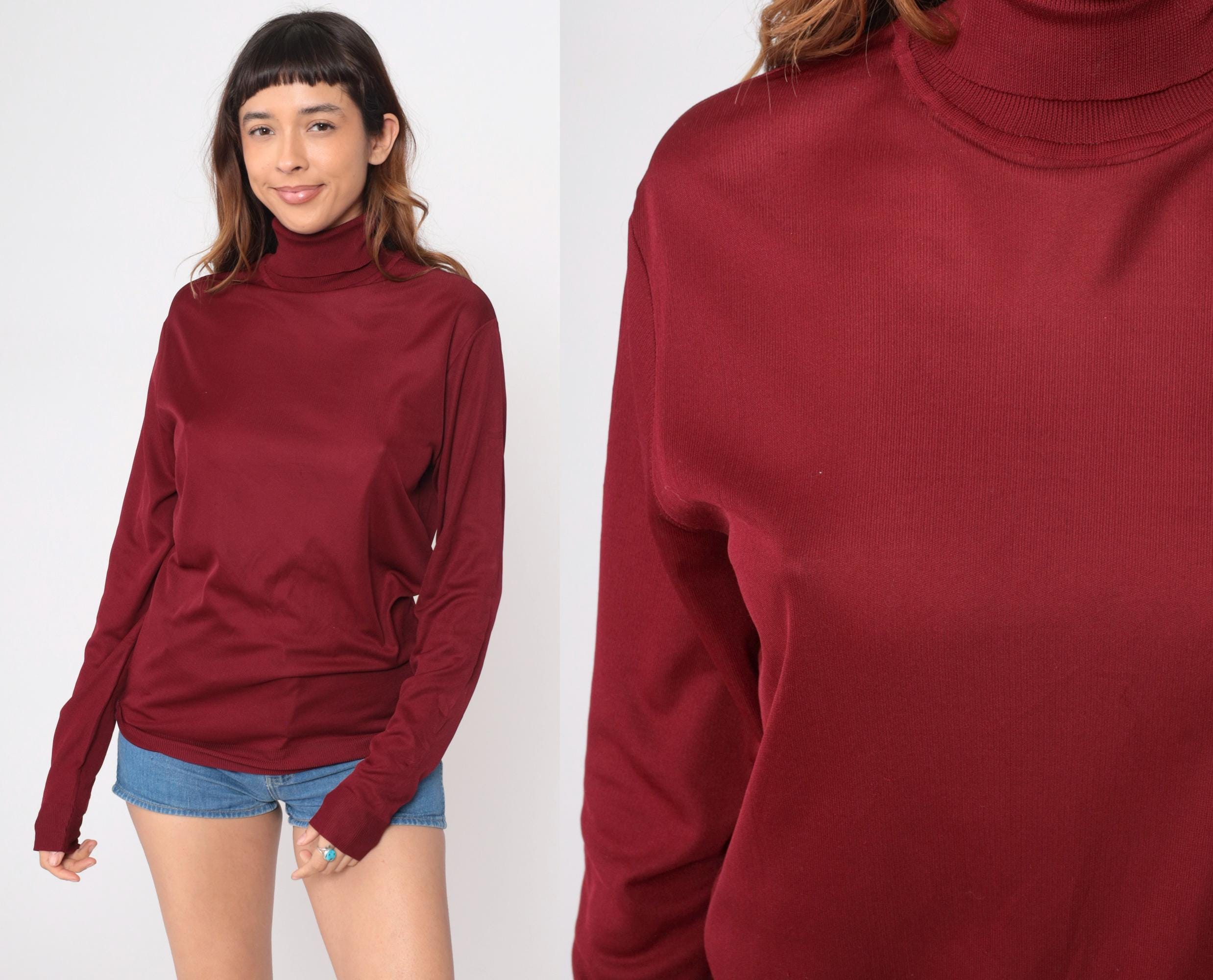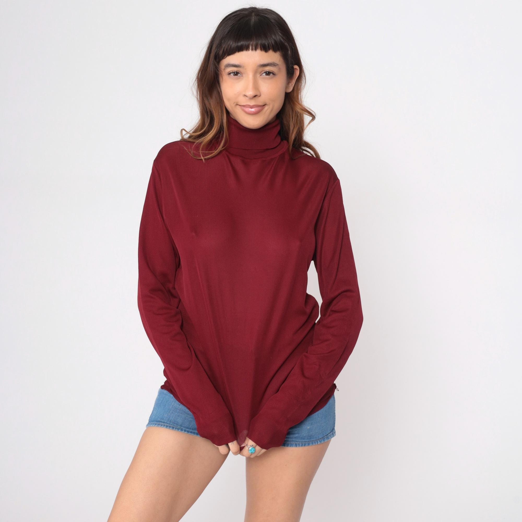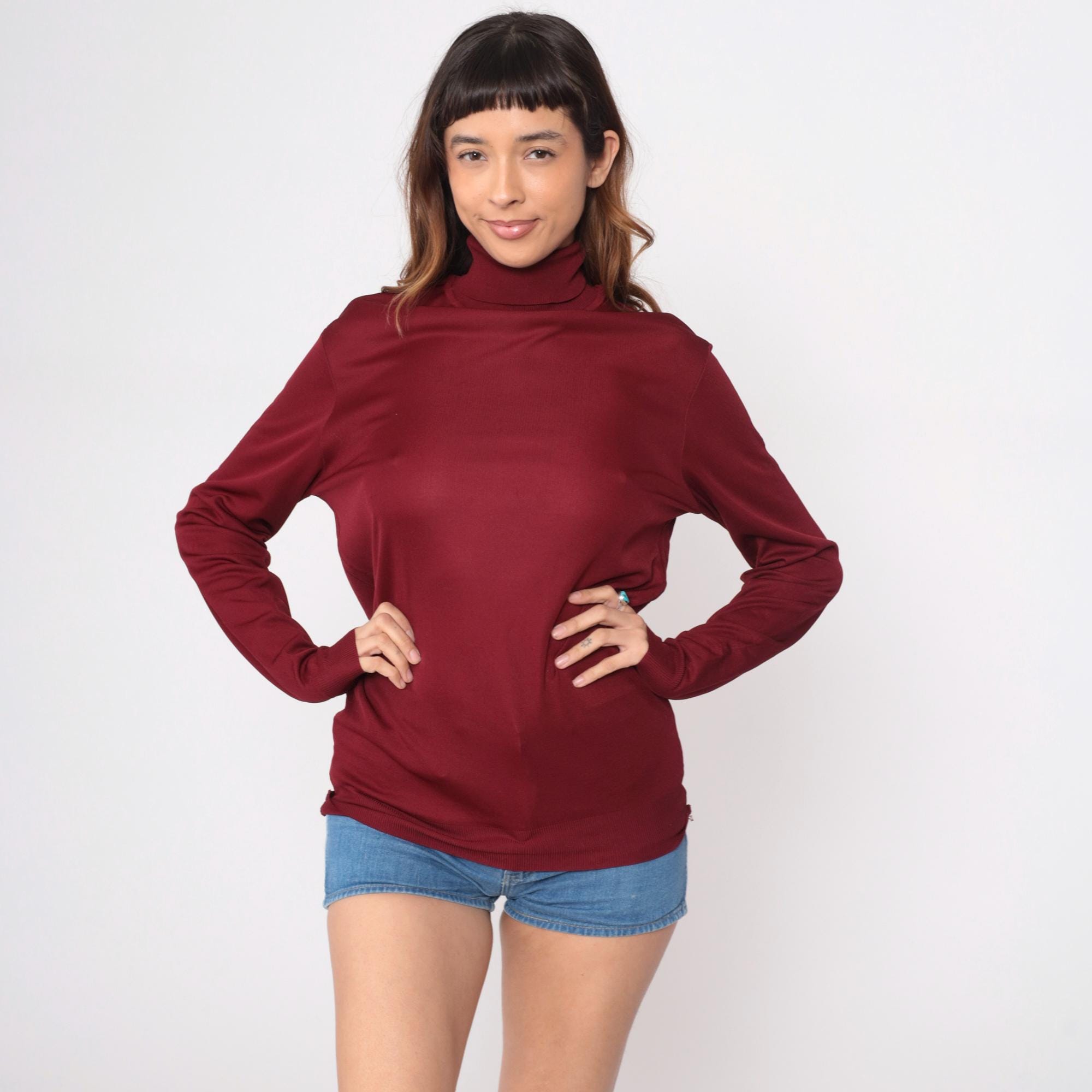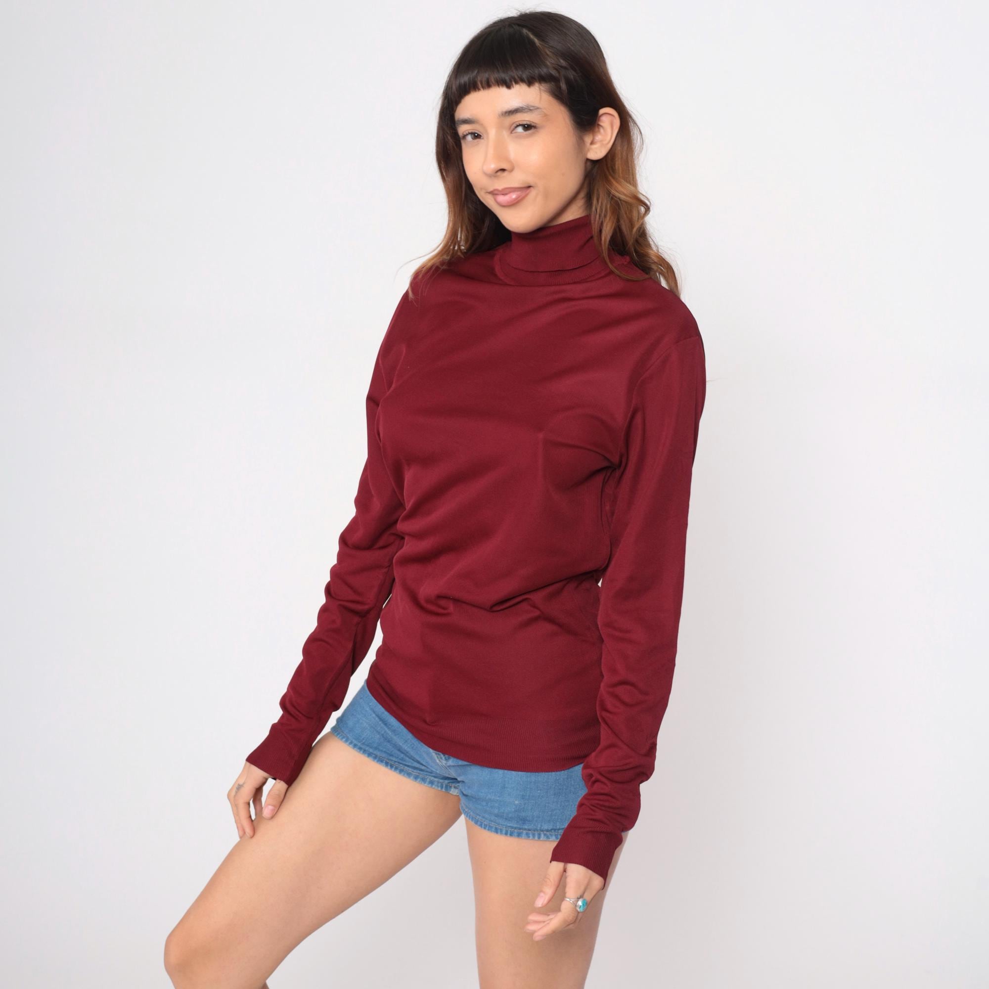 70s burgundy turtleneck shirt with long sleeves and ribbed knit detailing at cuffs, collar, and hem. Solid wine-colored fabric throughout. Cotton and polyester blend.