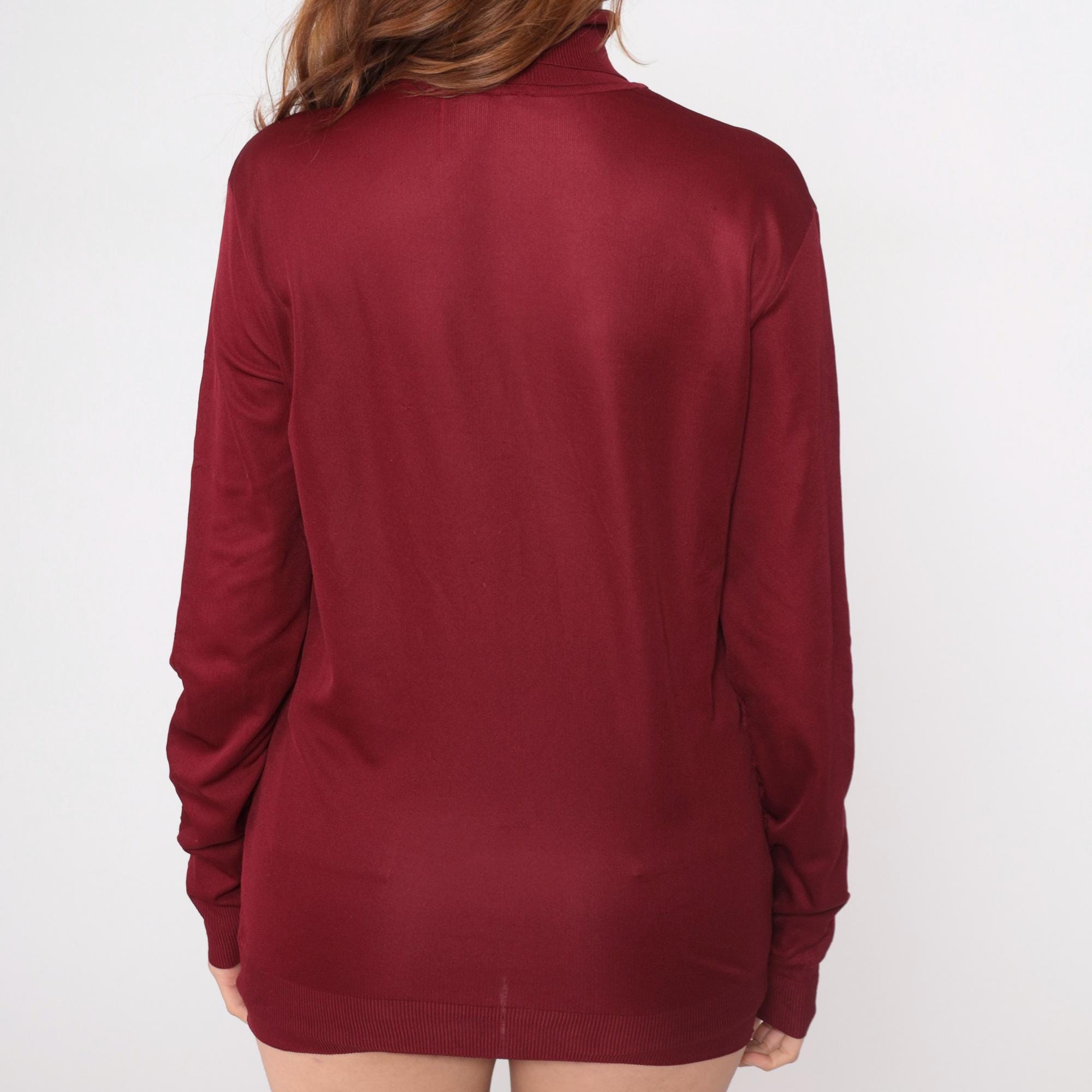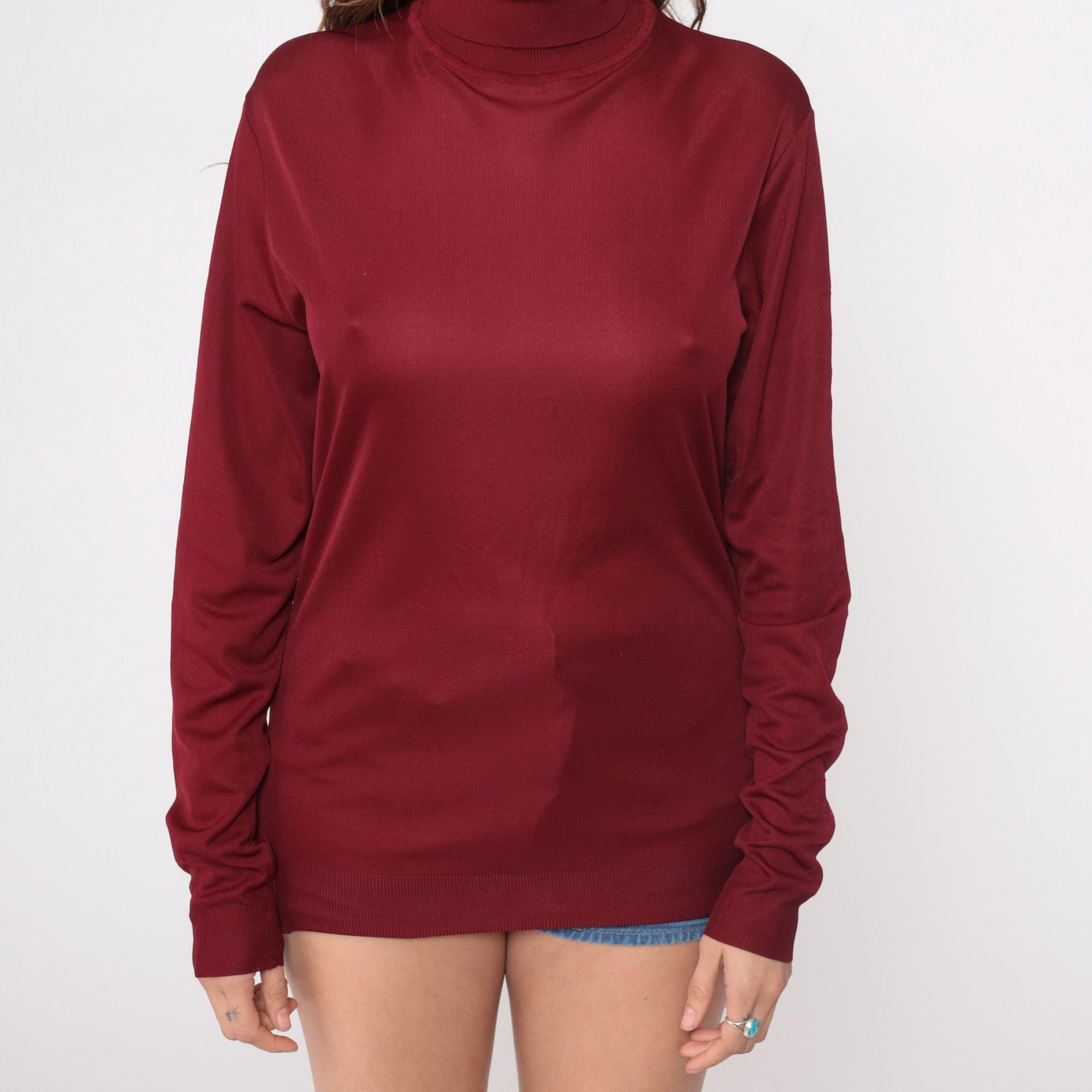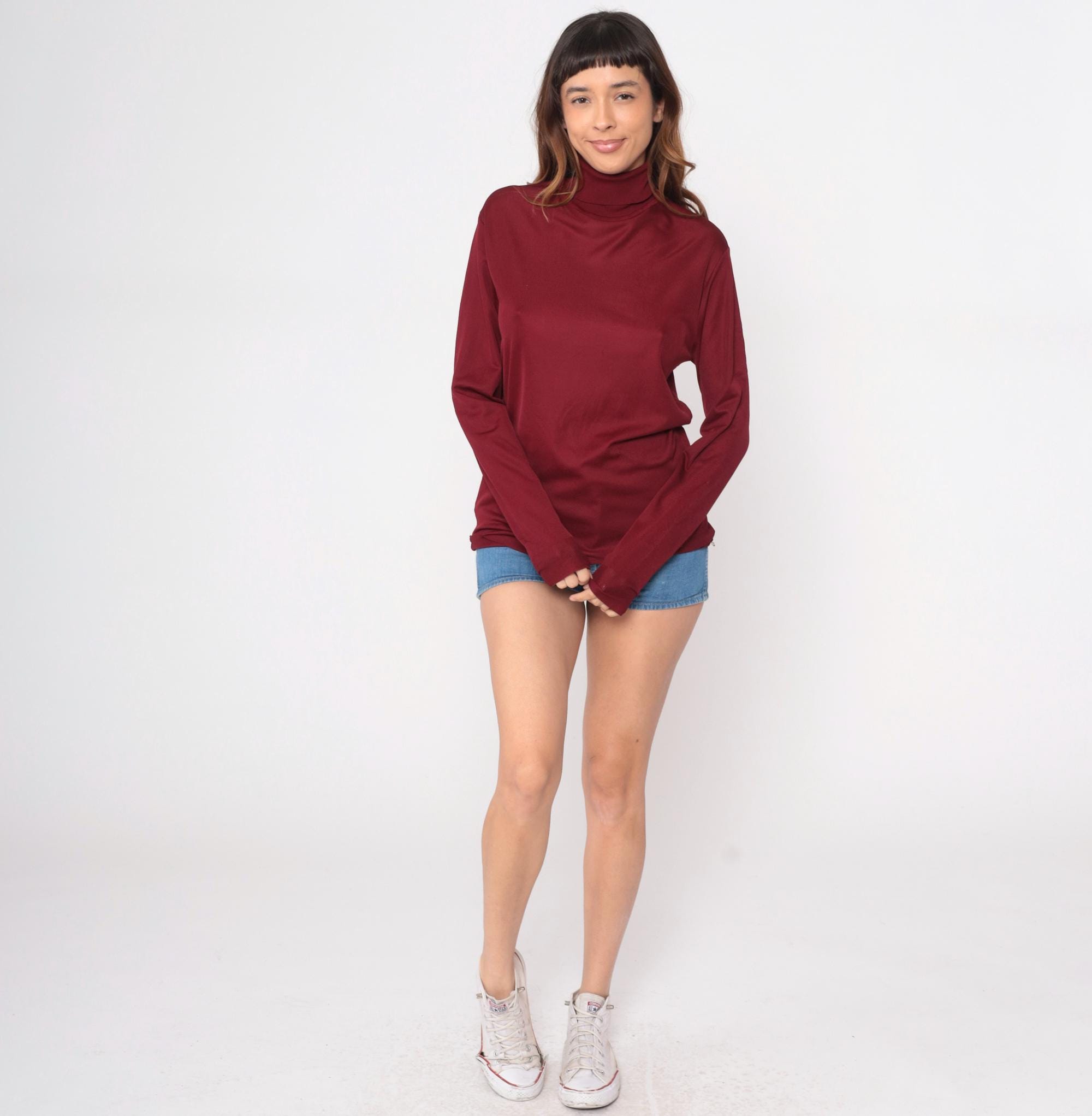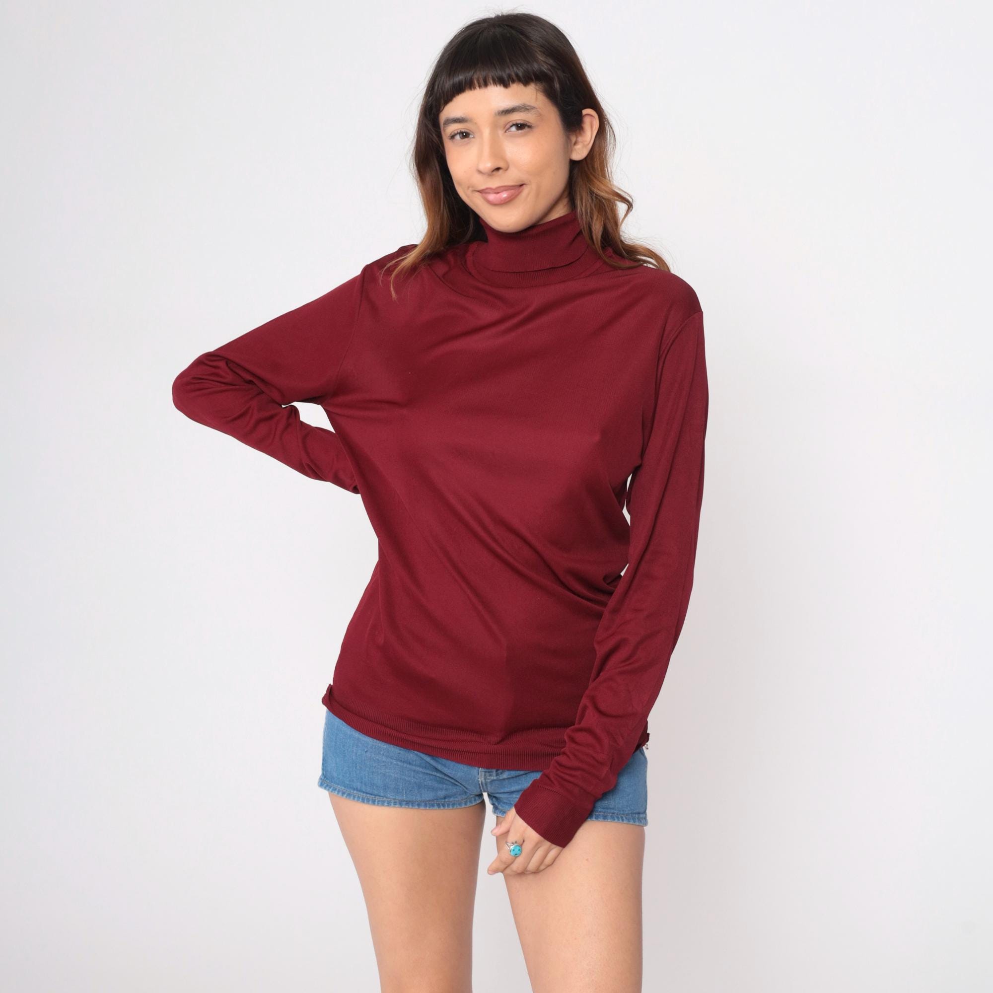 70s burgundy turtleneck shirt with long sleeves and ribbed knit detailing at cuffs, collar, and hem. Solid wine-colored fabric throughout. Cotton and polyester blend.