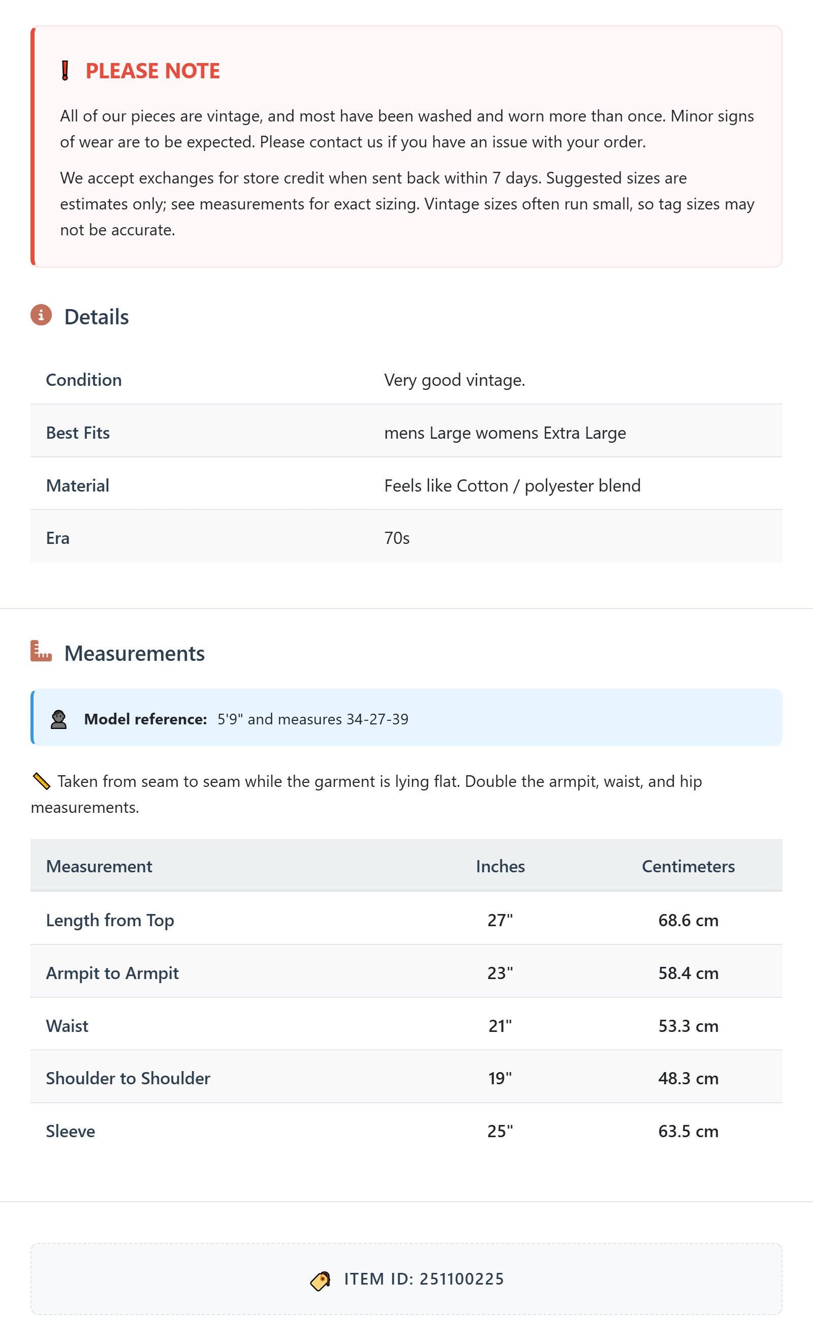 Suggested sizes are estimates only; see measurements for exact sizing. Vintage sizes often run small, so tag sizes may not be accurate.