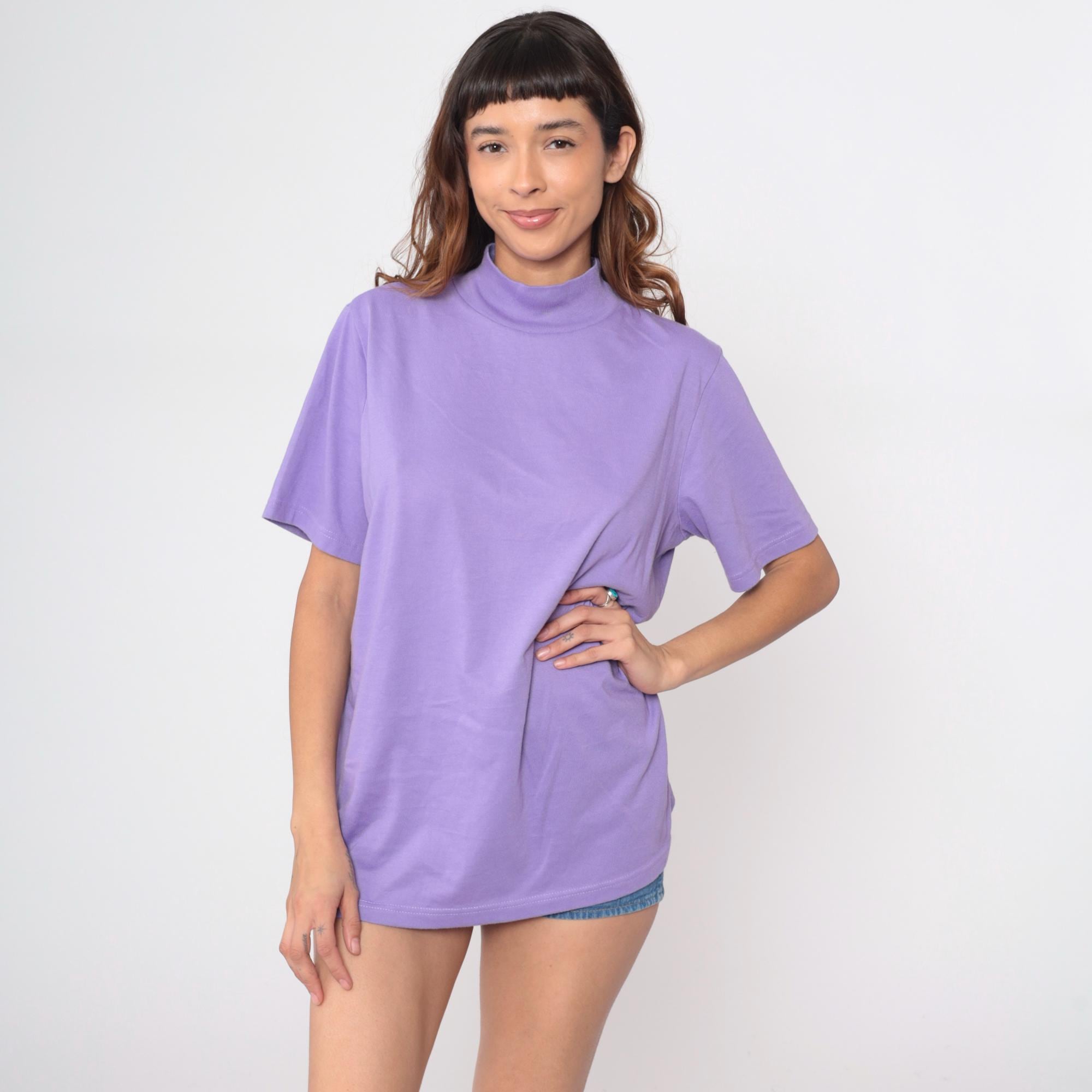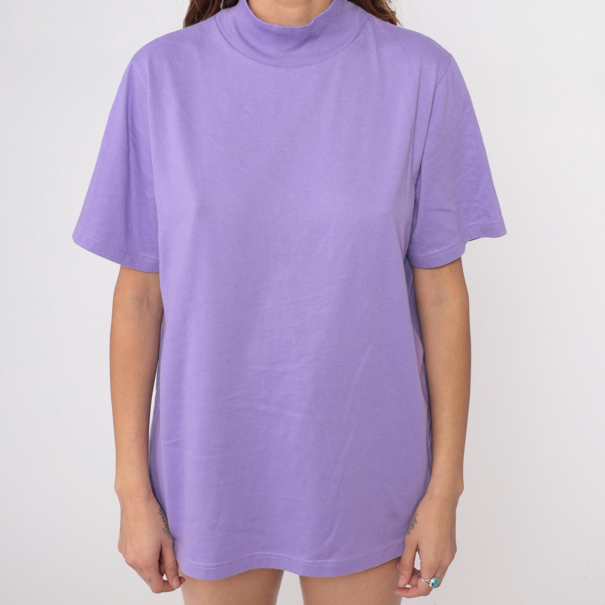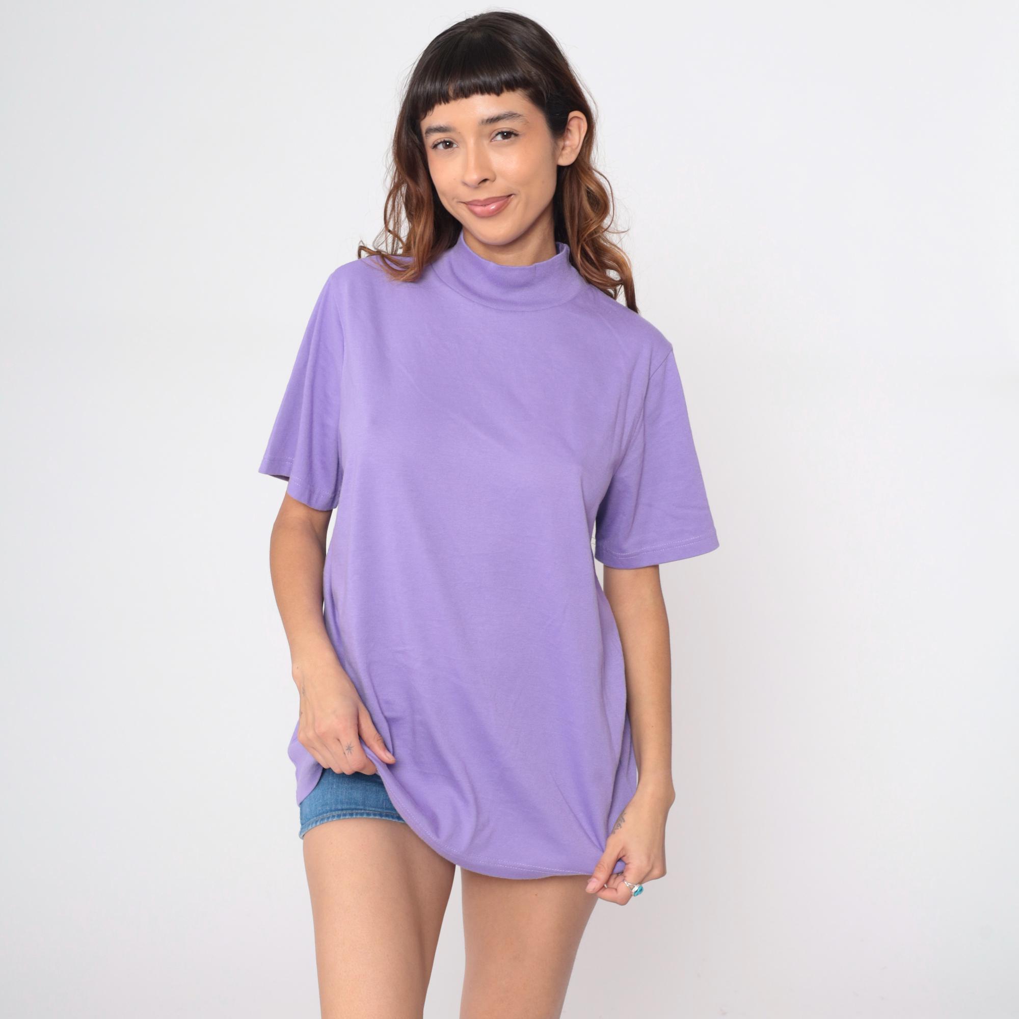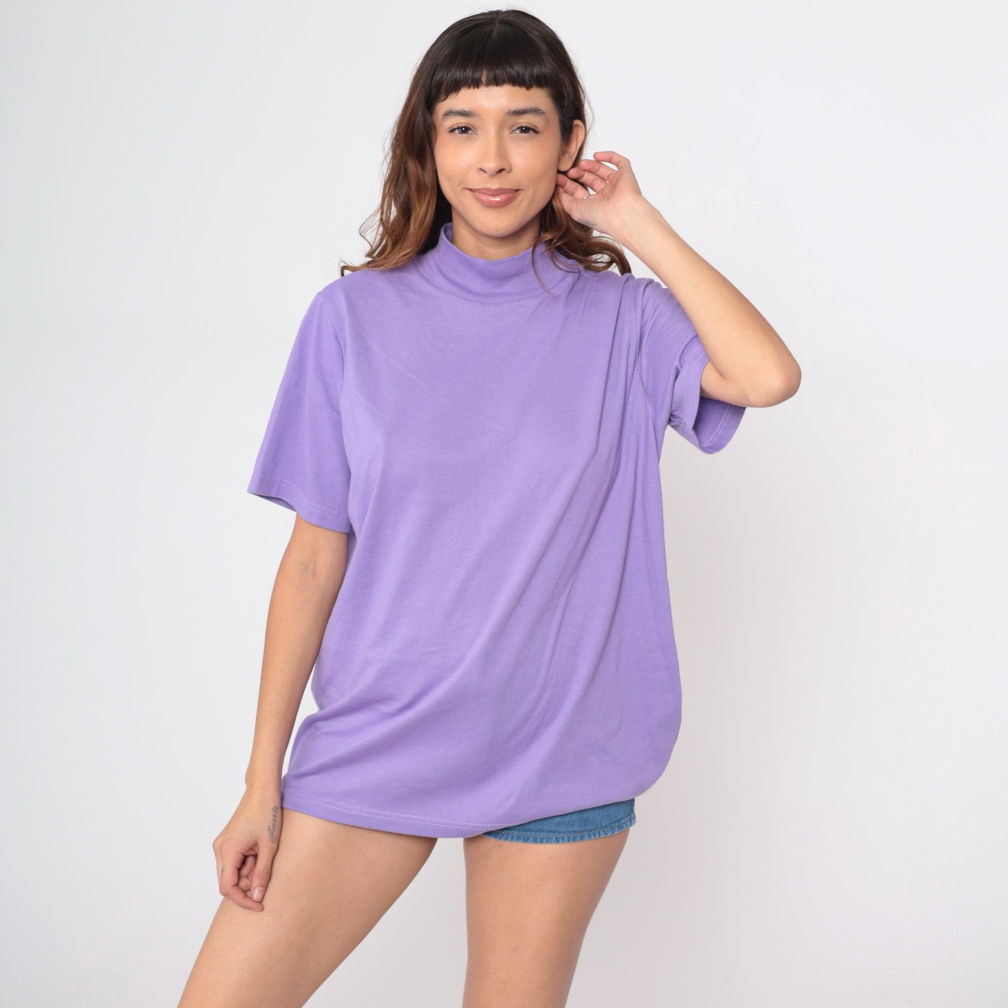 90s lavender mock neck tee from roamans in an oversized, boxy silhouette. Short sleeves and solid color throughout.