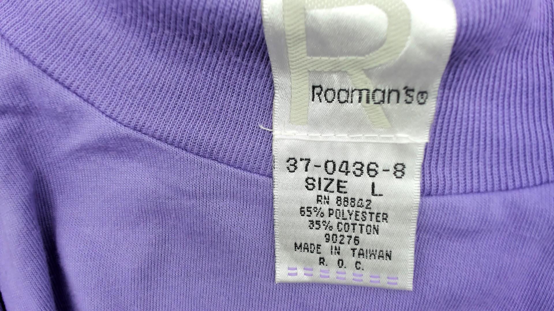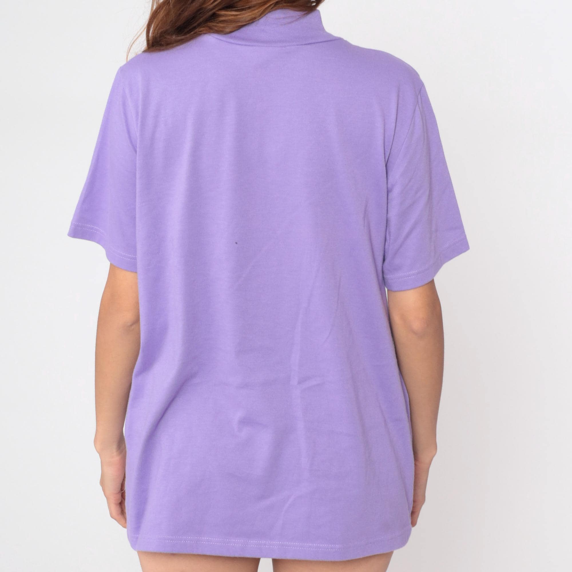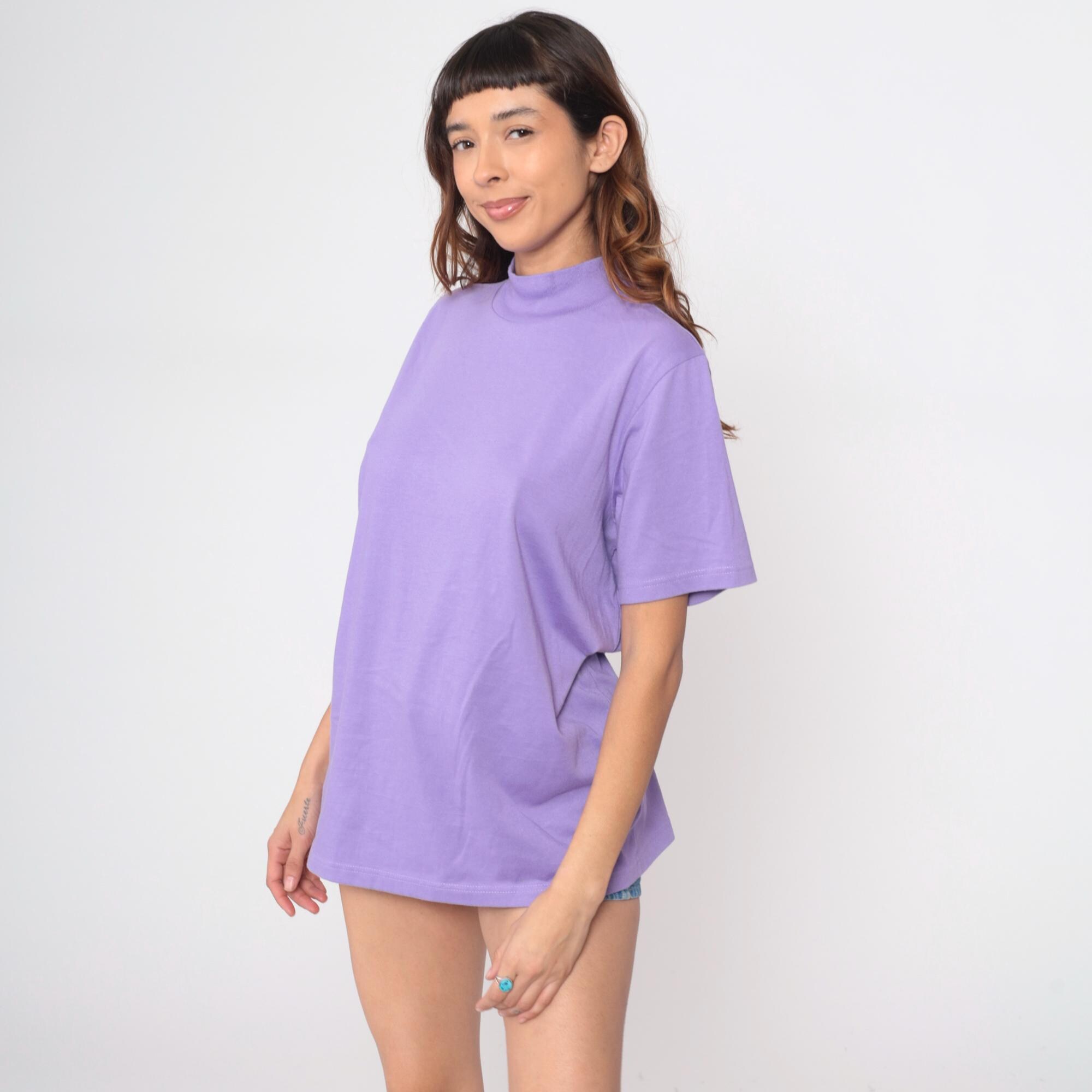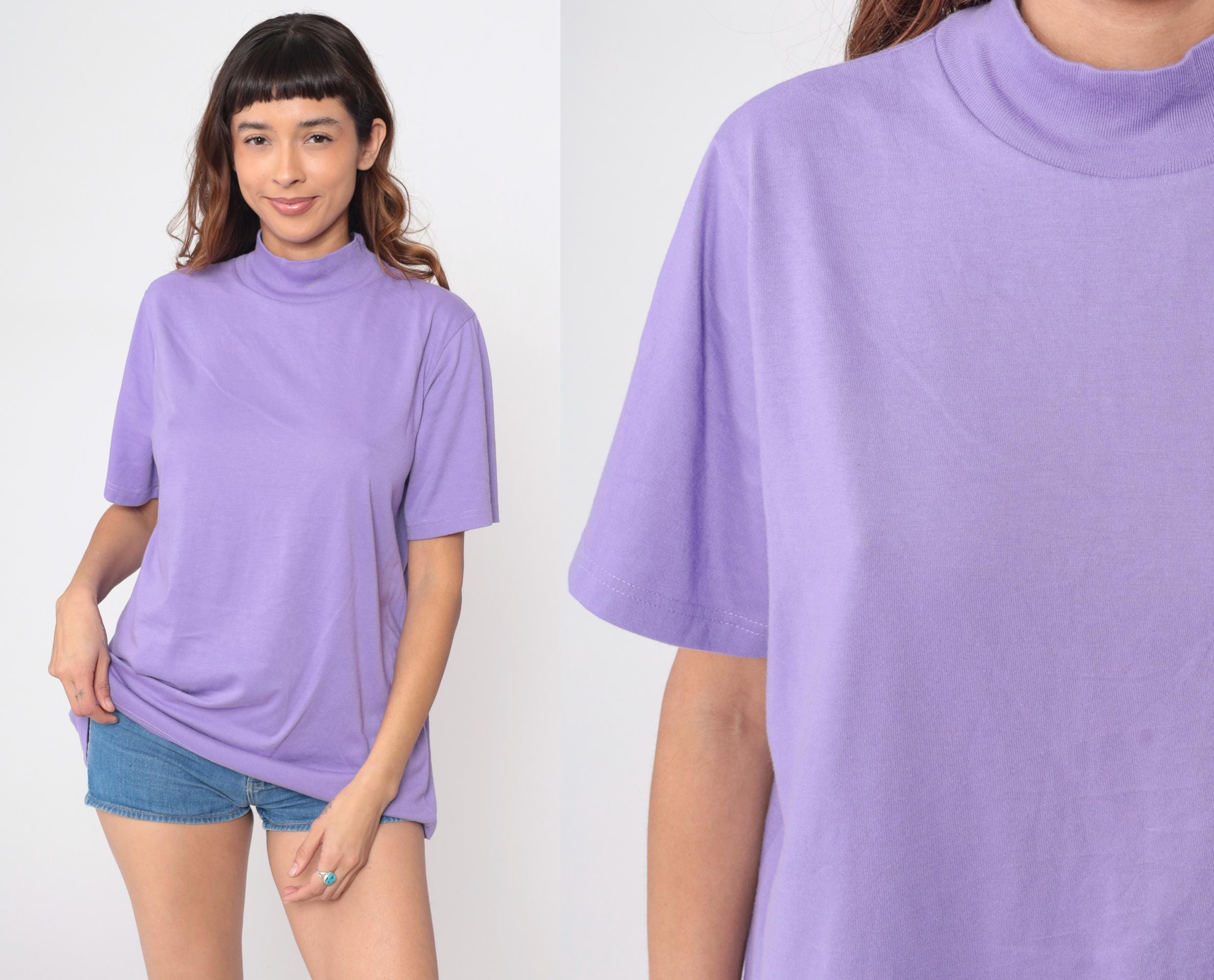 90s lavender mock neck tee from roamans in an oversized, boxy silhouette. Short sleeves and solid color throughout.