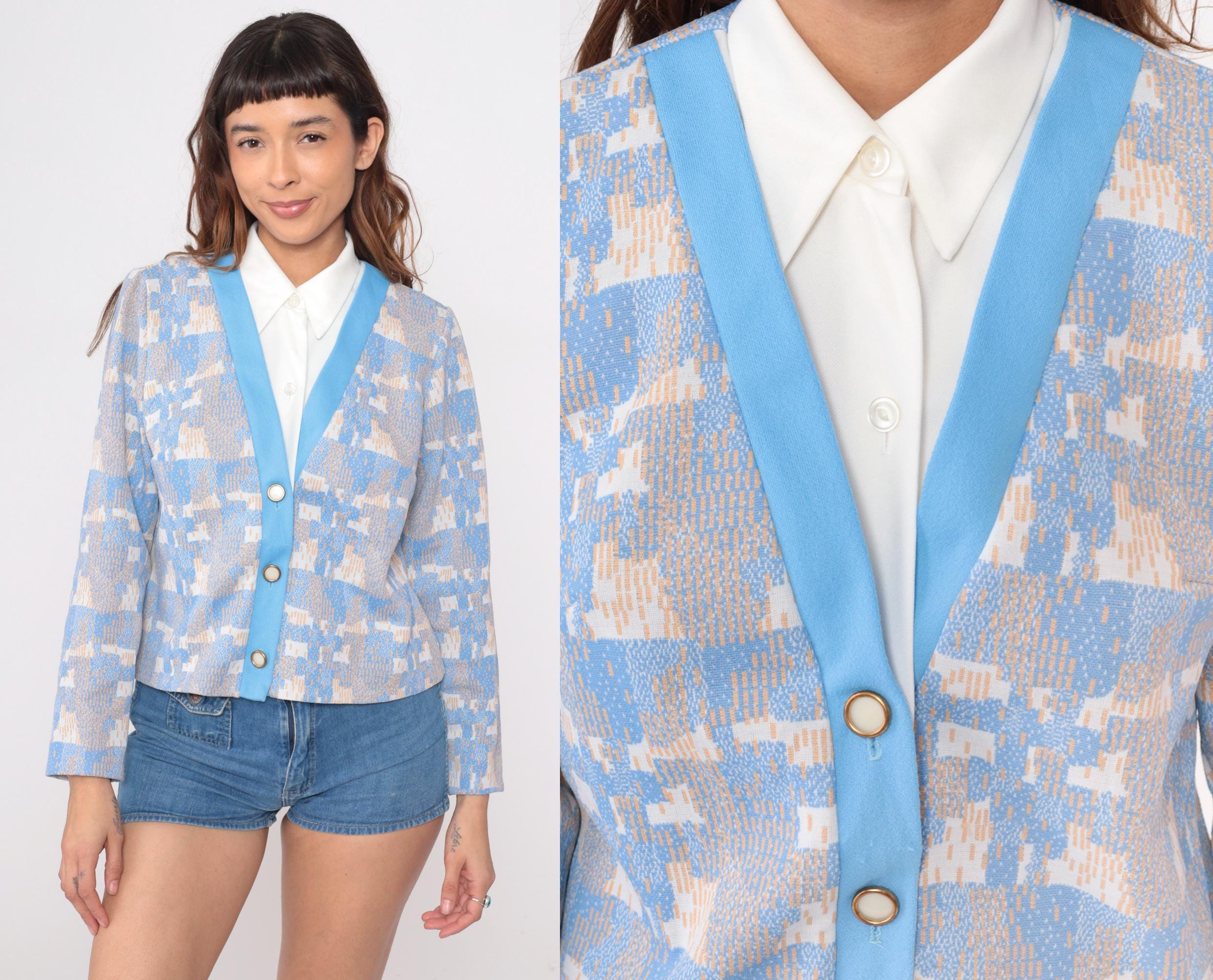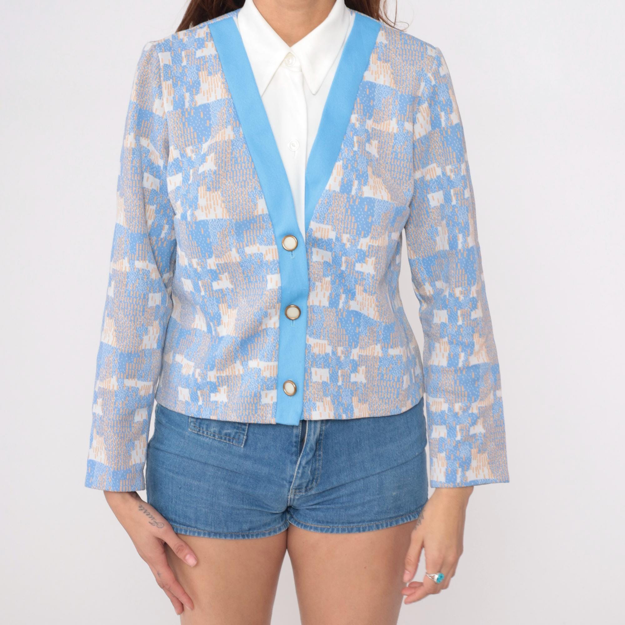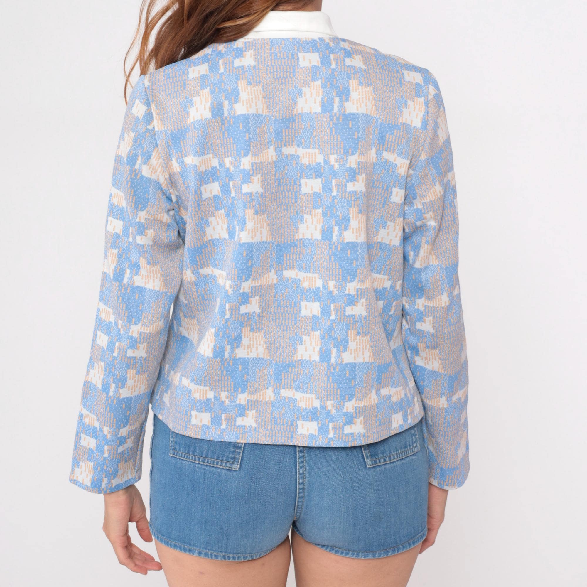70s blazer in polyester with geometric pixelated pattern in blue, cream, tan, and gray tones. Light blue trim on notched lapels, button band, and cuffs, three white buttons down front closure. Long sleeves with set-in shoulders.