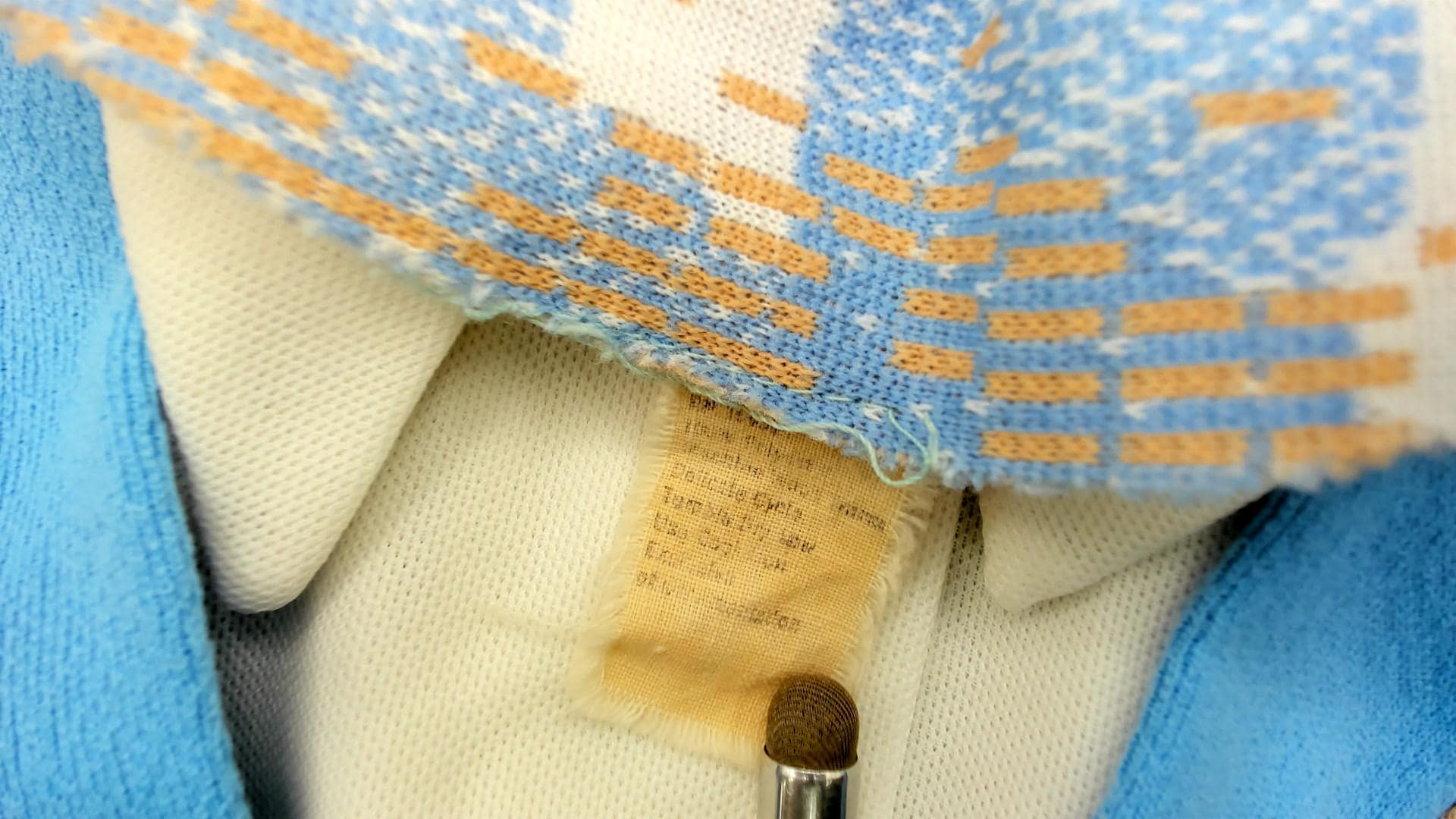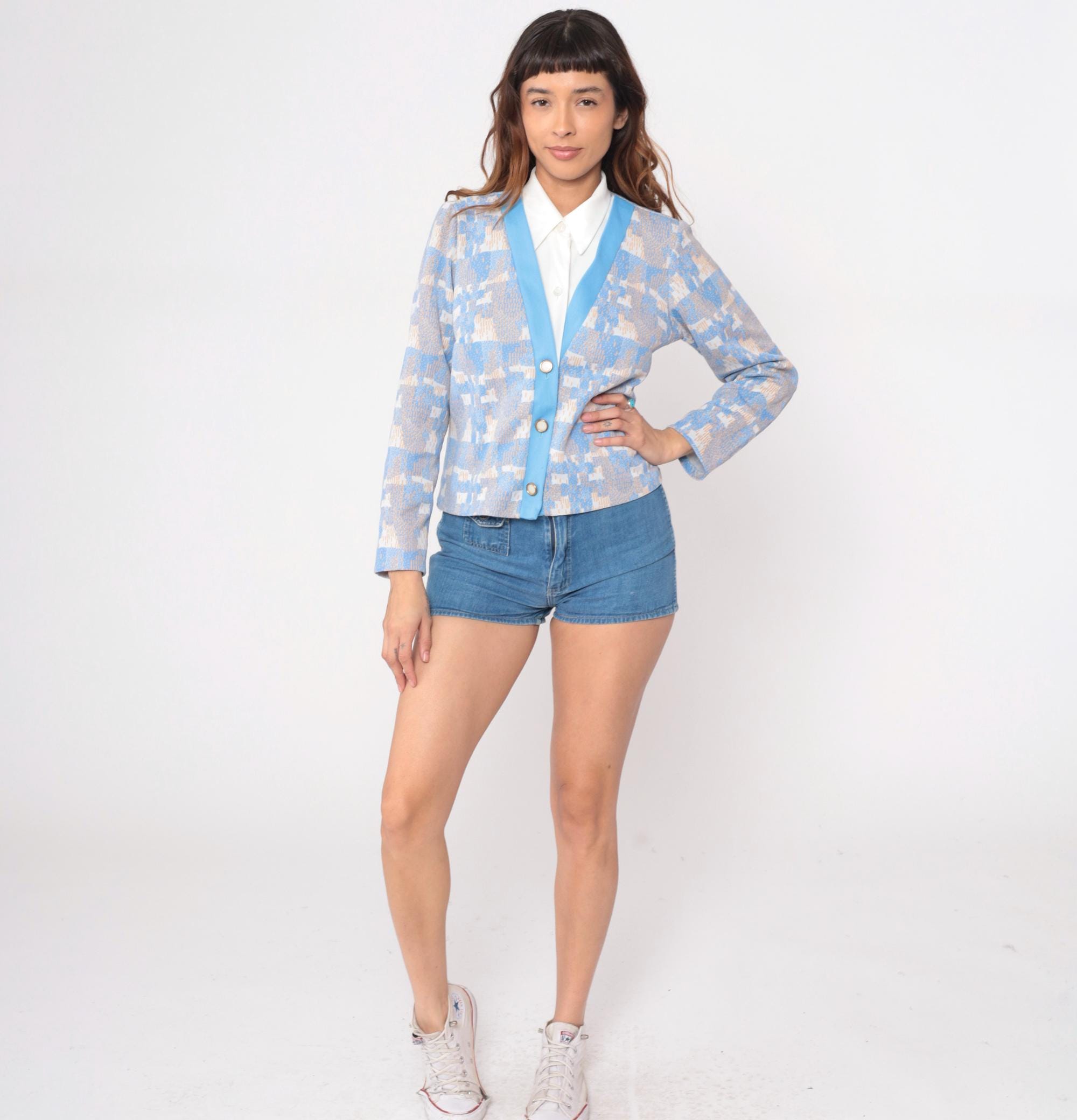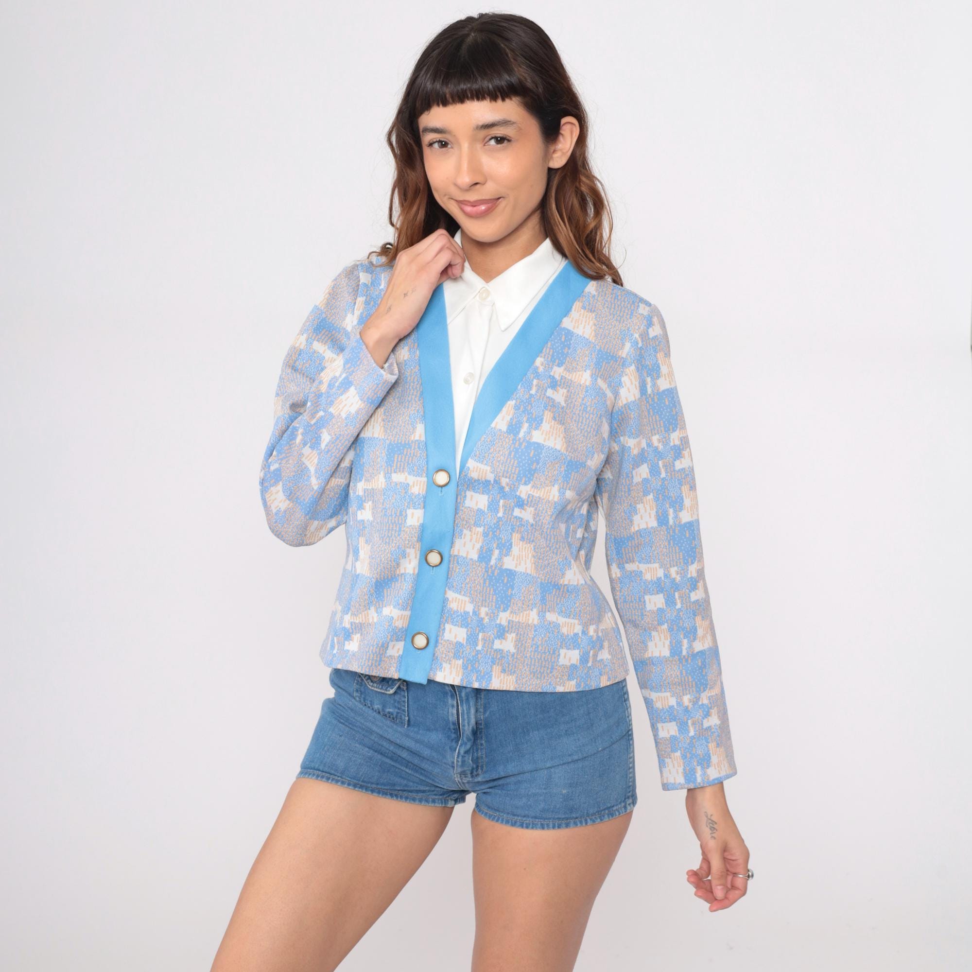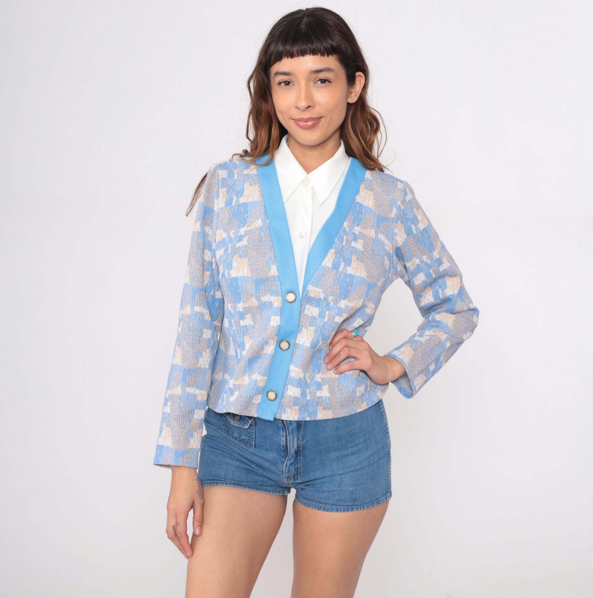 70s blazer in polyester with geometric pixelated pattern in blue, cream, tan, and gray tones. Light blue trim on notched lapels, button band, and cuffs, three white buttons down front closure. Long sleeves with set-in shoulders.