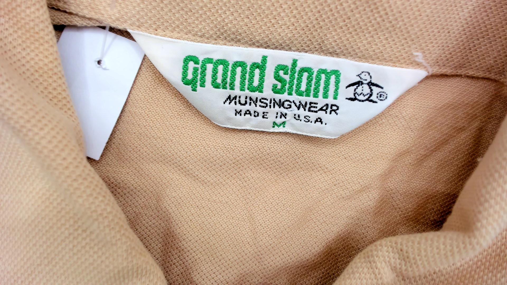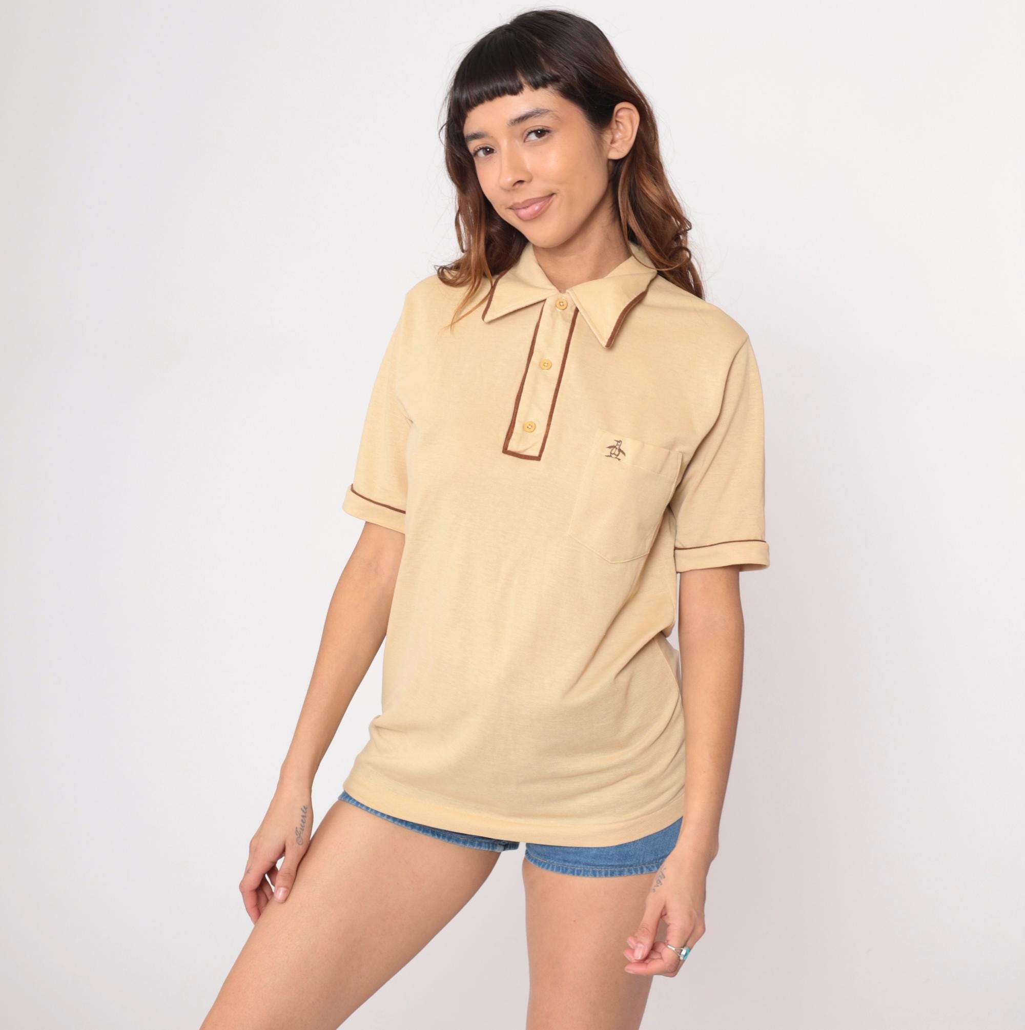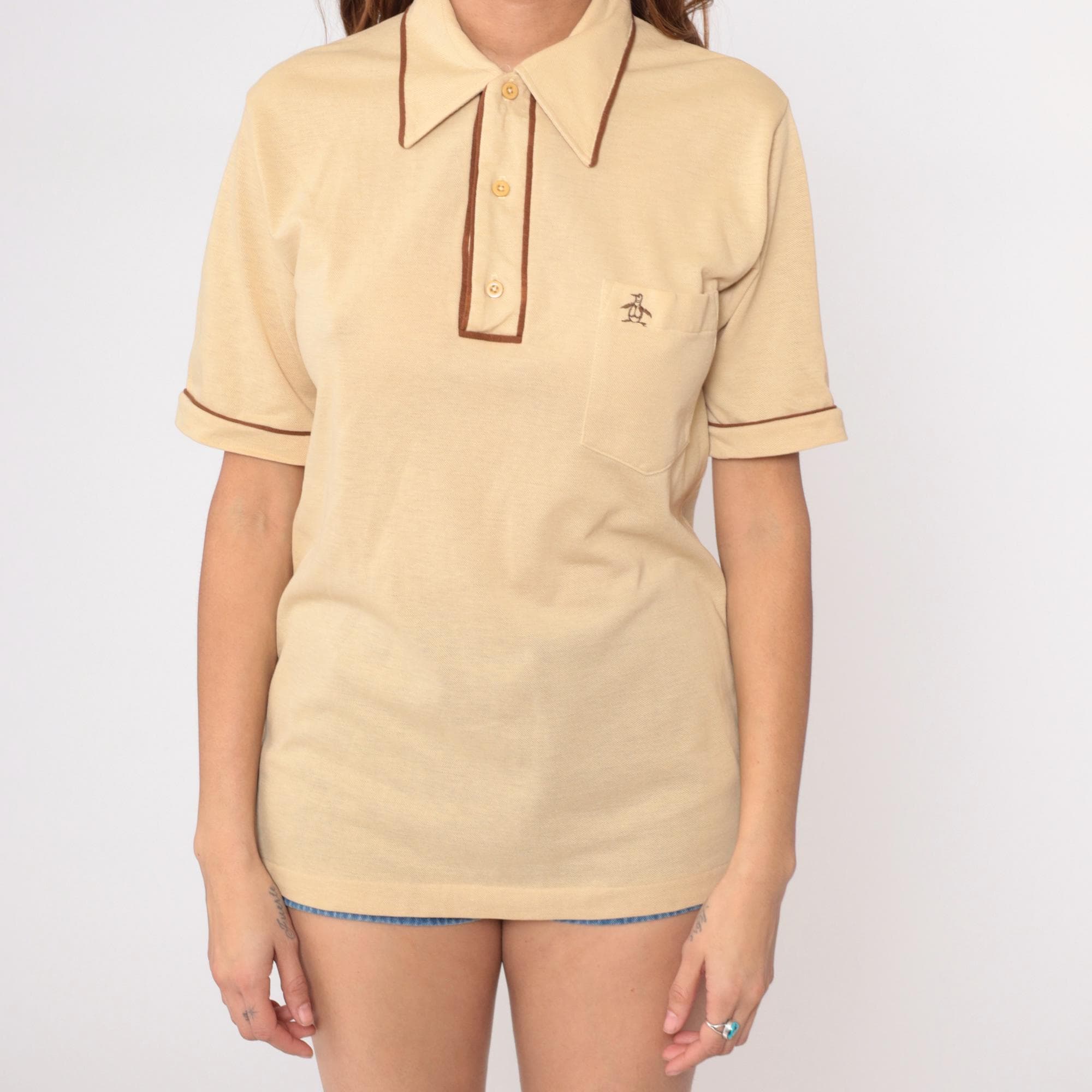 80s pale yellow polo shirt from Grand Slam Munsingwear with brown contrast piping trim along the collar, button placket, and sleeve cuffs. Short sleeves with rolled cuff detail, chest patch pocket, embroidered penguin logo on left chest.