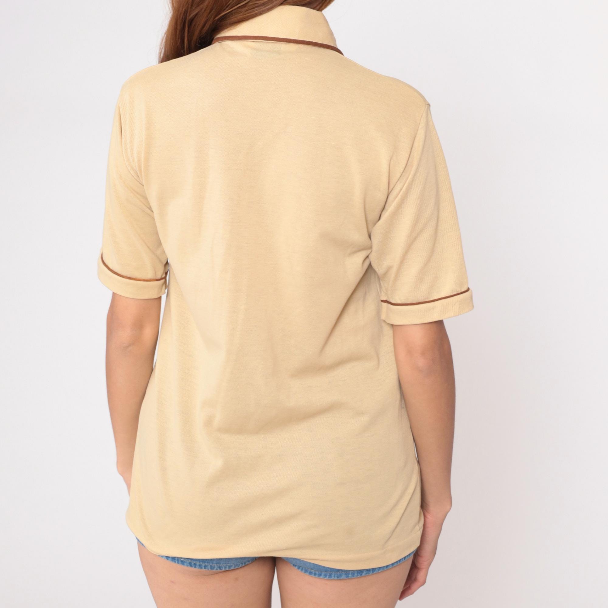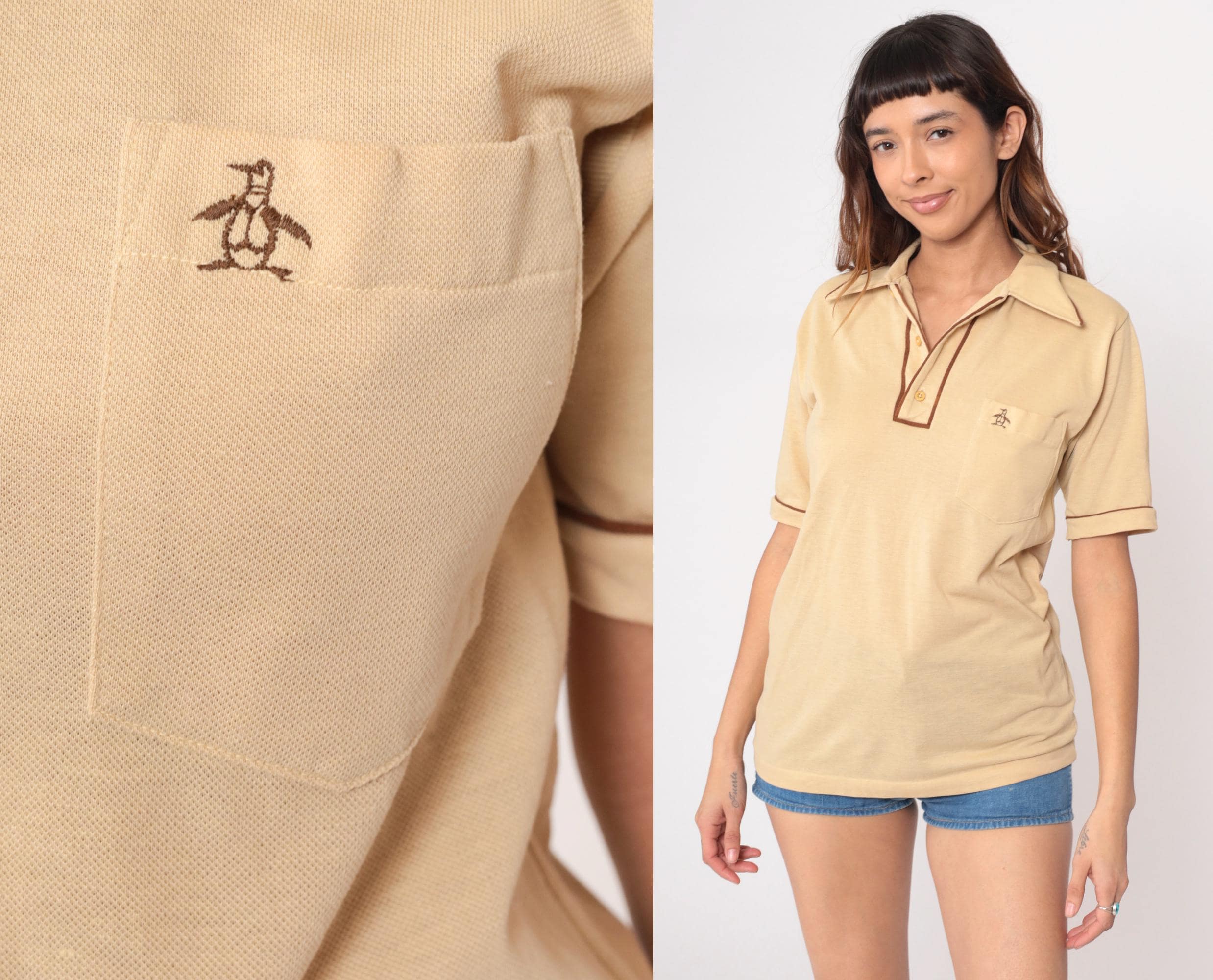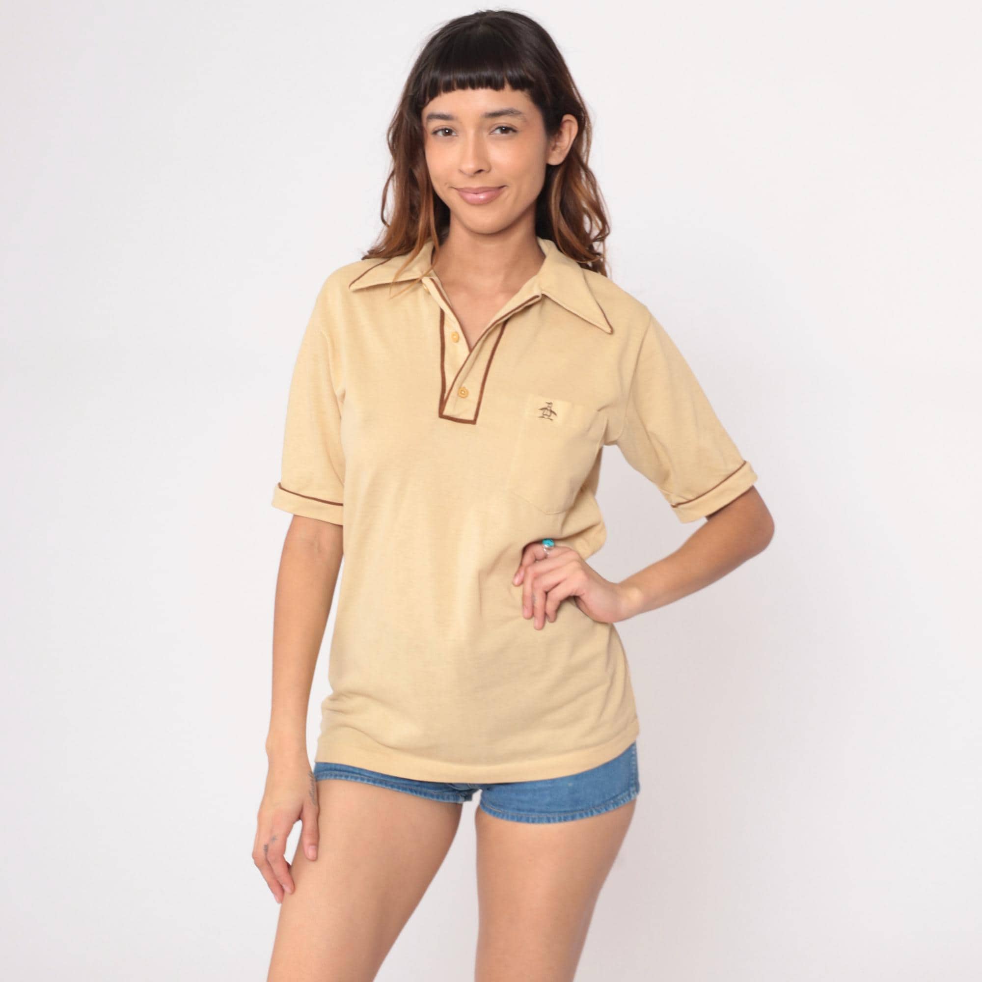 80s pale yellow polo shirt from Grand Slam Munsingwear with brown contrast piping trim along the collar, button placket, and sleeve cuffs. Short sleeves with rolled cuff detail, chest patch pocket, embroidered penguin logo on left chest.