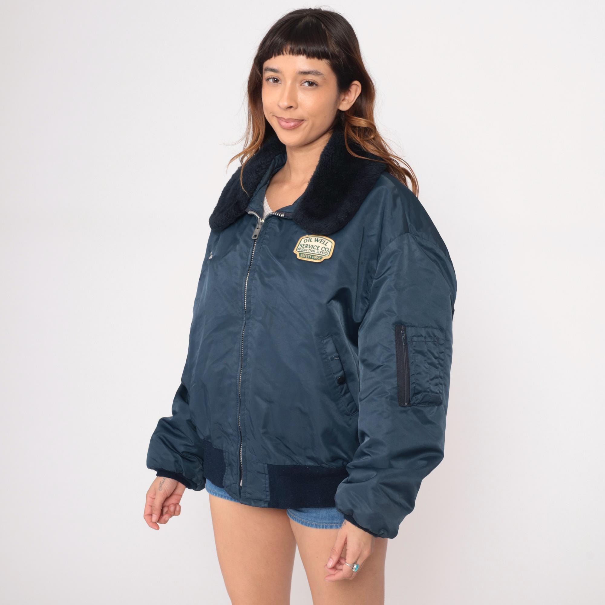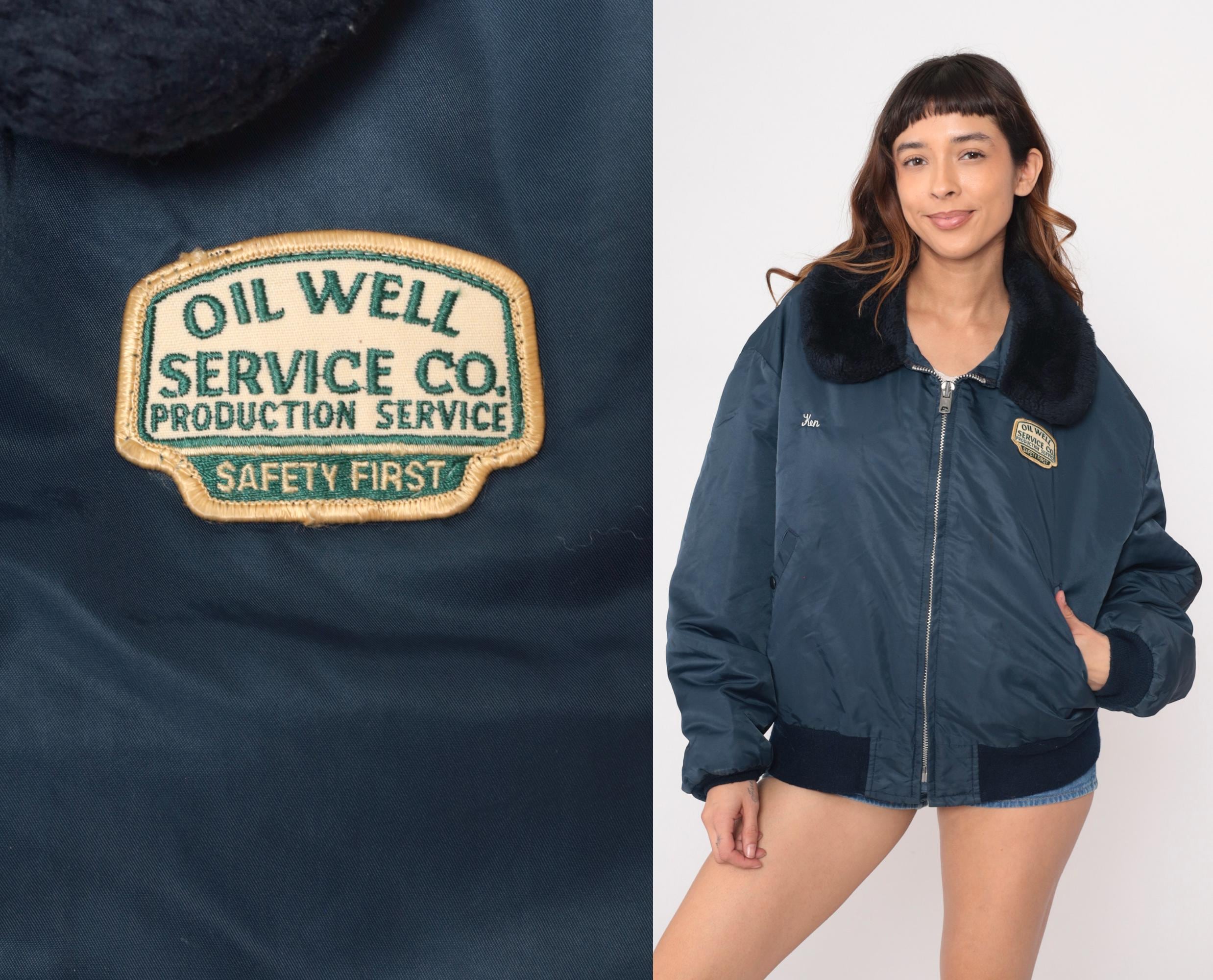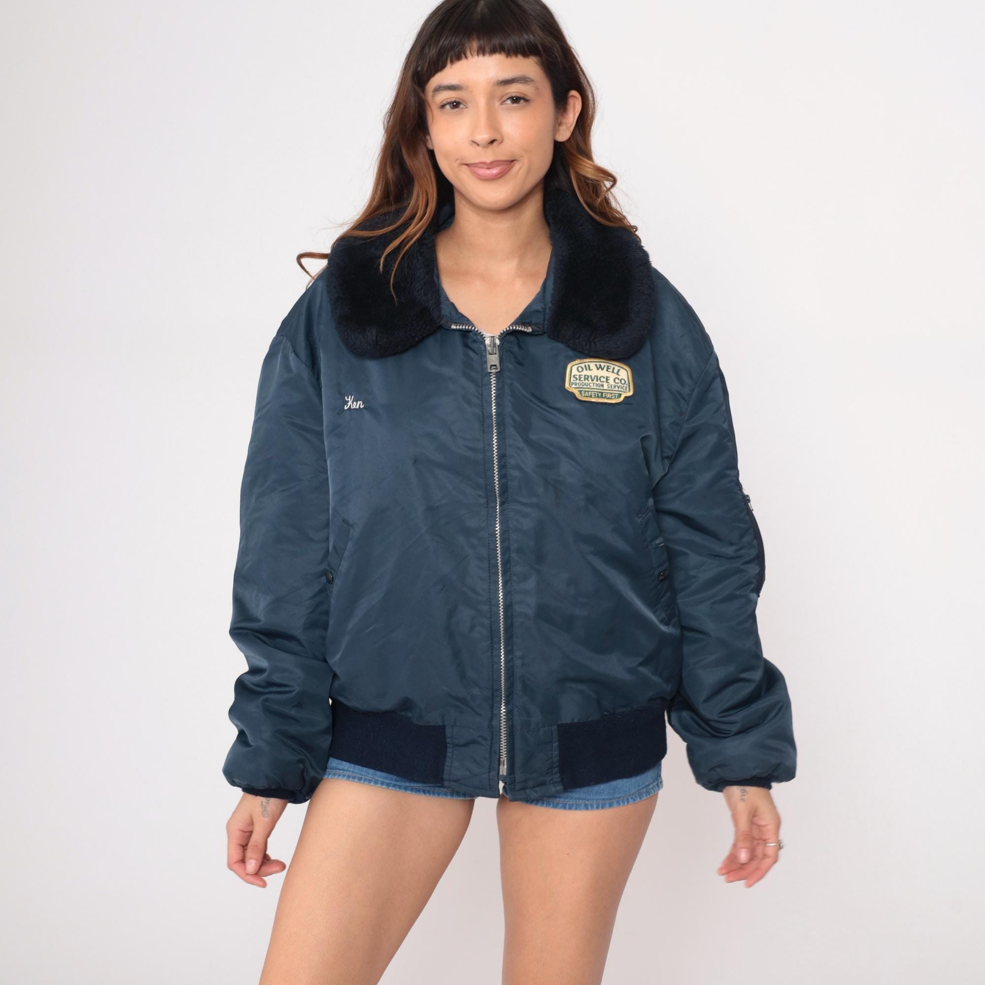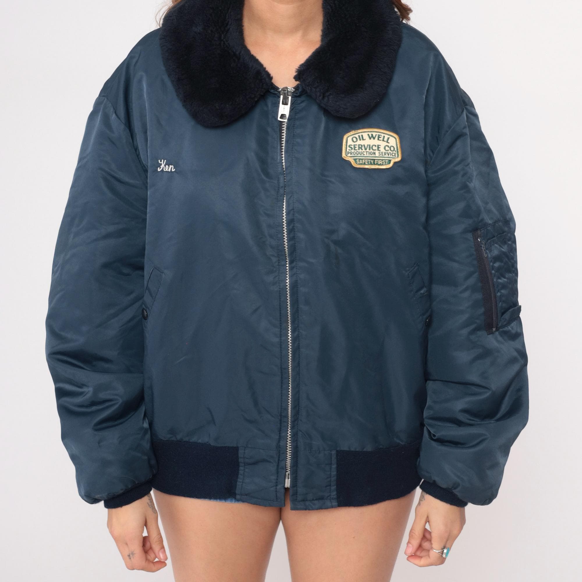 80s navy blue bomber jacket from golden fleece outerwear with black faux fur collar and embroidered patches. "Oil Well Service Co. Production Service Safety First" patch on right chest, "Ken" name embroidery on left chest. Full zip front, side pockets, sleeve zipper pocket, black ribbed knit cuffs and waistband.