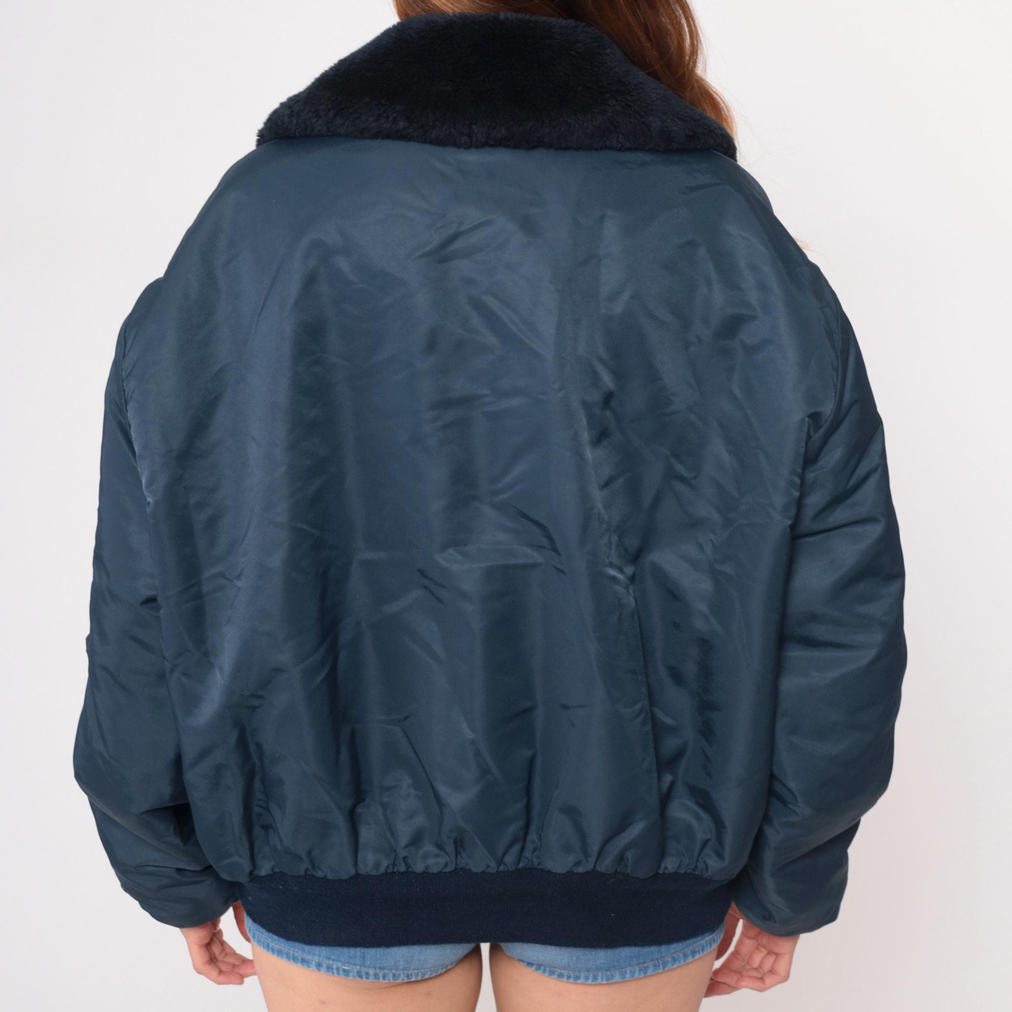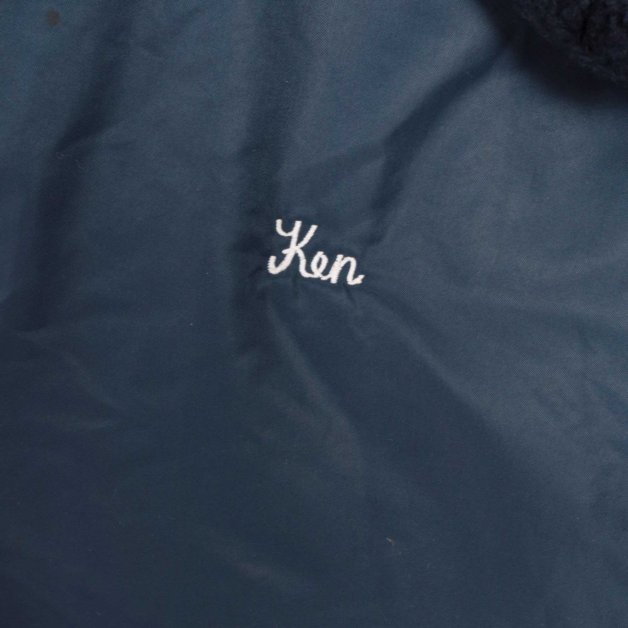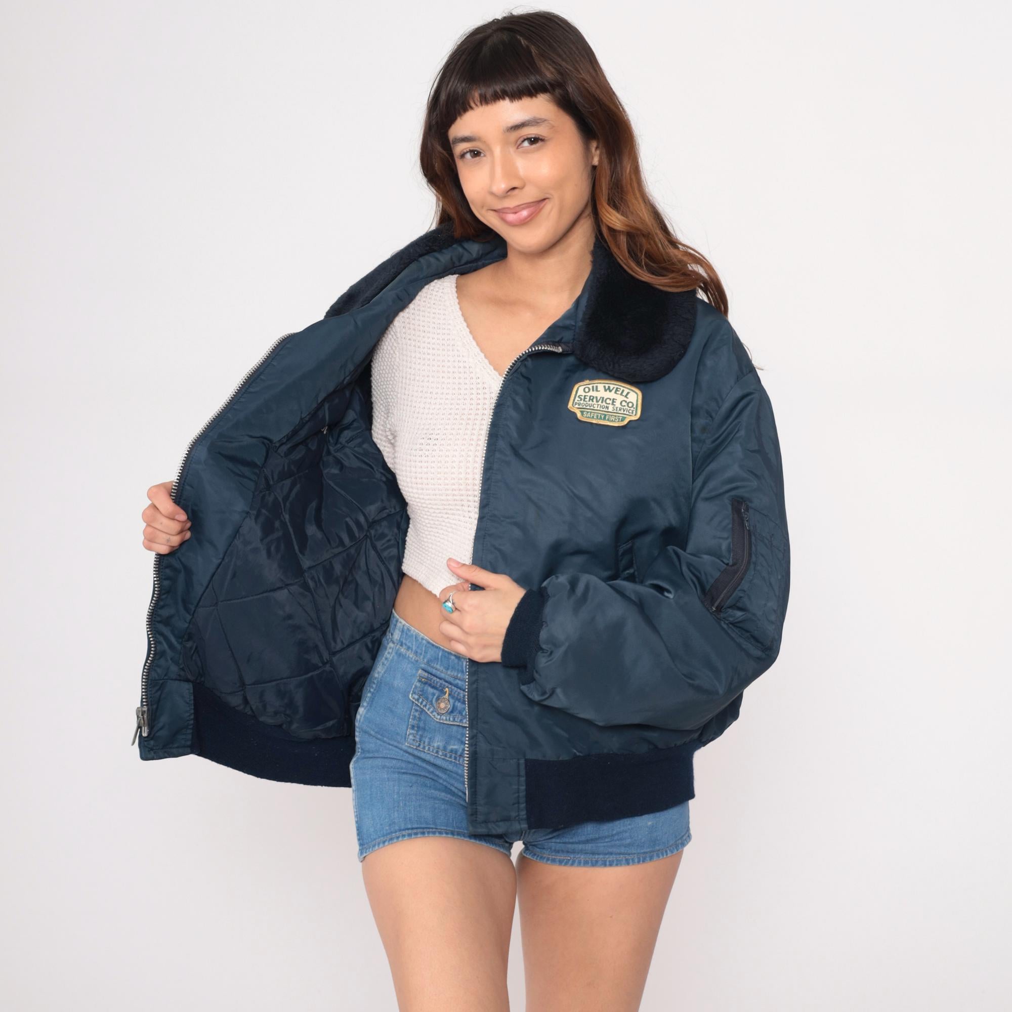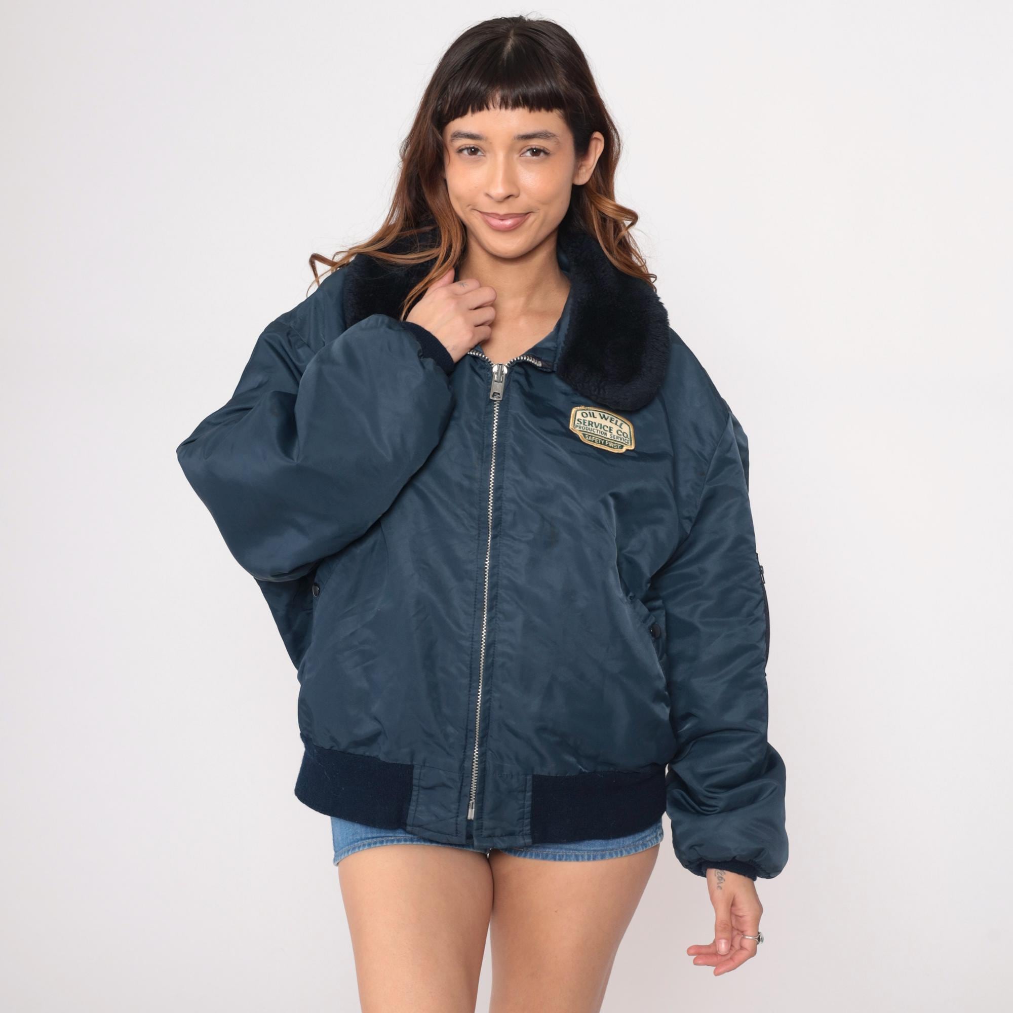 80s navy blue bomber jacket from golden fleece outerwear with black faux fur collar and embroidered patches. "Oil Well Service Co. Production Service Safety First" patch on right chest, "Ken" name embroidery on left chest. Full zip front, side pockets, sleeve zipper pocket, black ribbed knit cuffs and waistband.