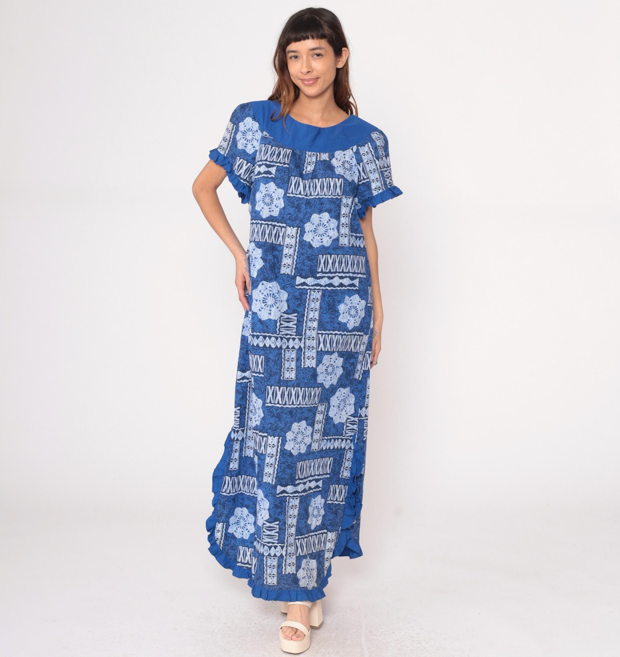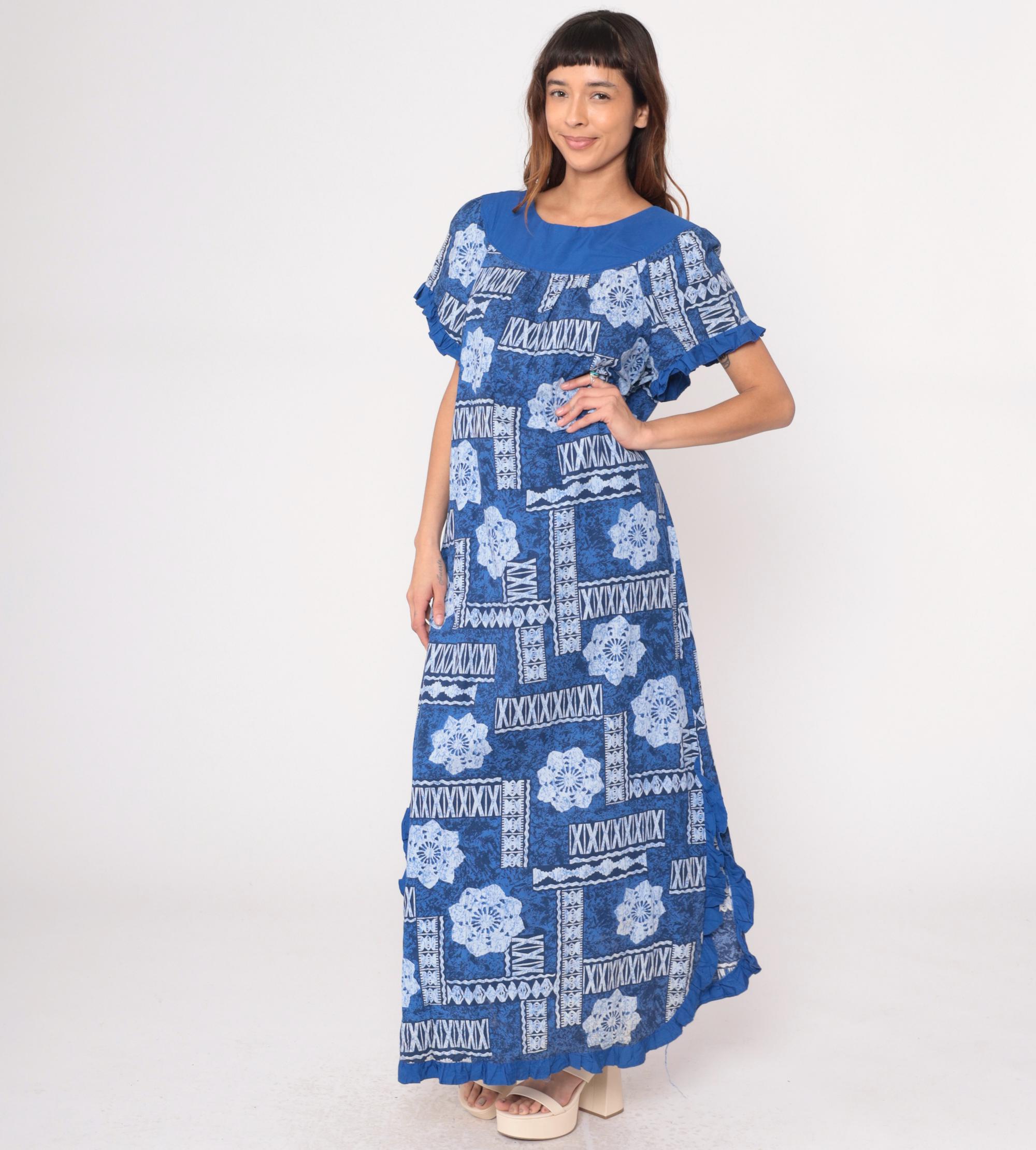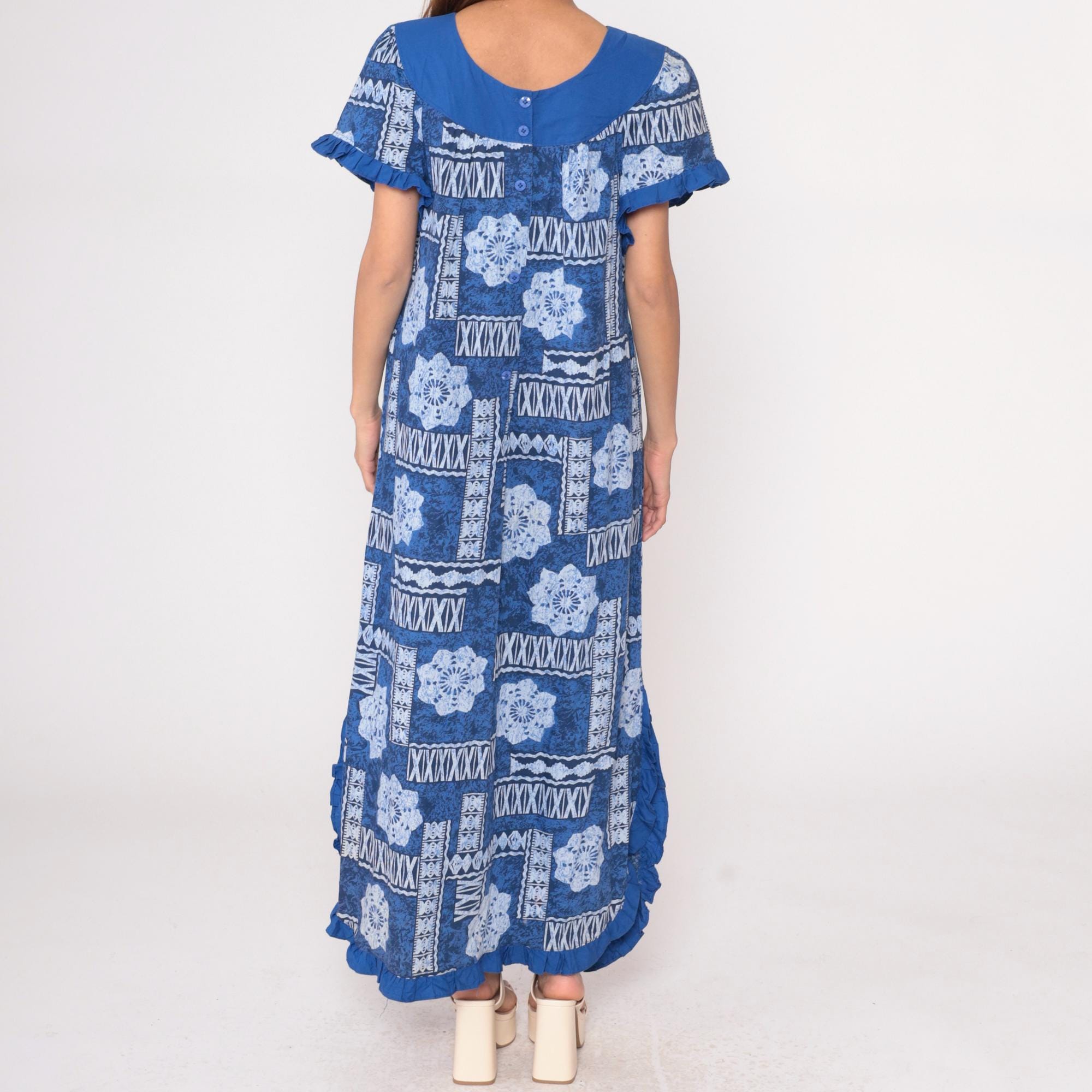 80s blue and white maxi dress with geometric tribal print throughout. All-over pattern with medallion motifs, zigzag borders, and diamond shapes. Short flutter sleeves, scoop neckline with button back closure, ruffled scalloped hem.