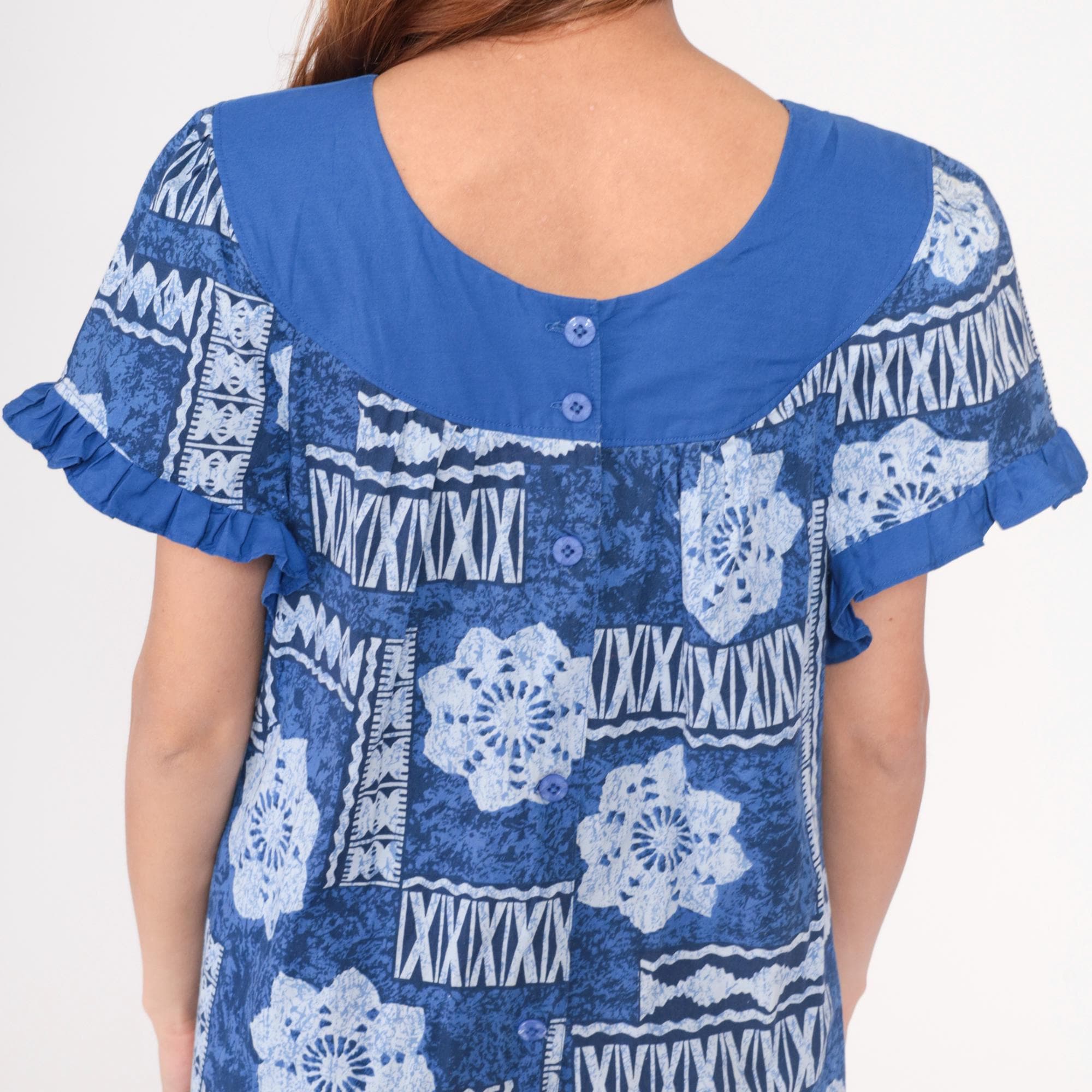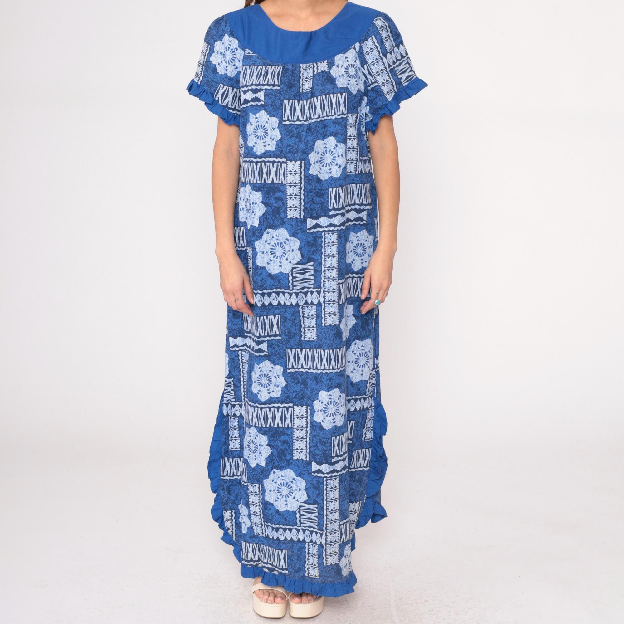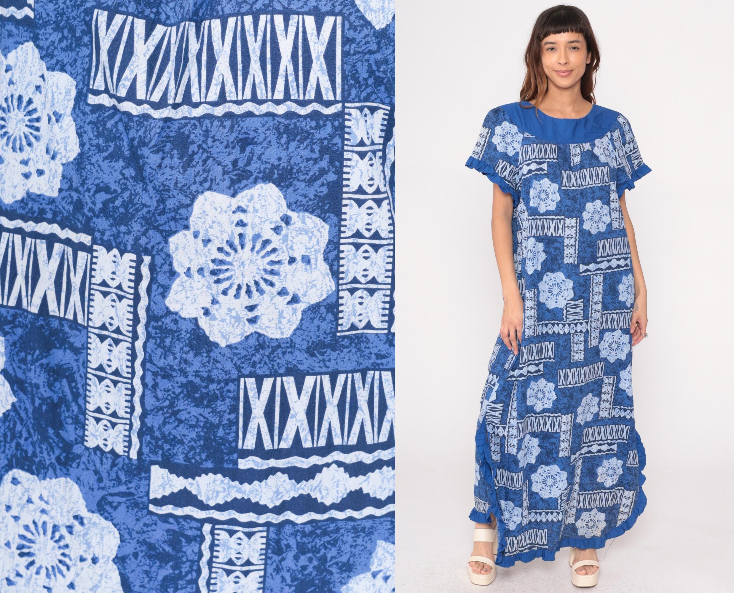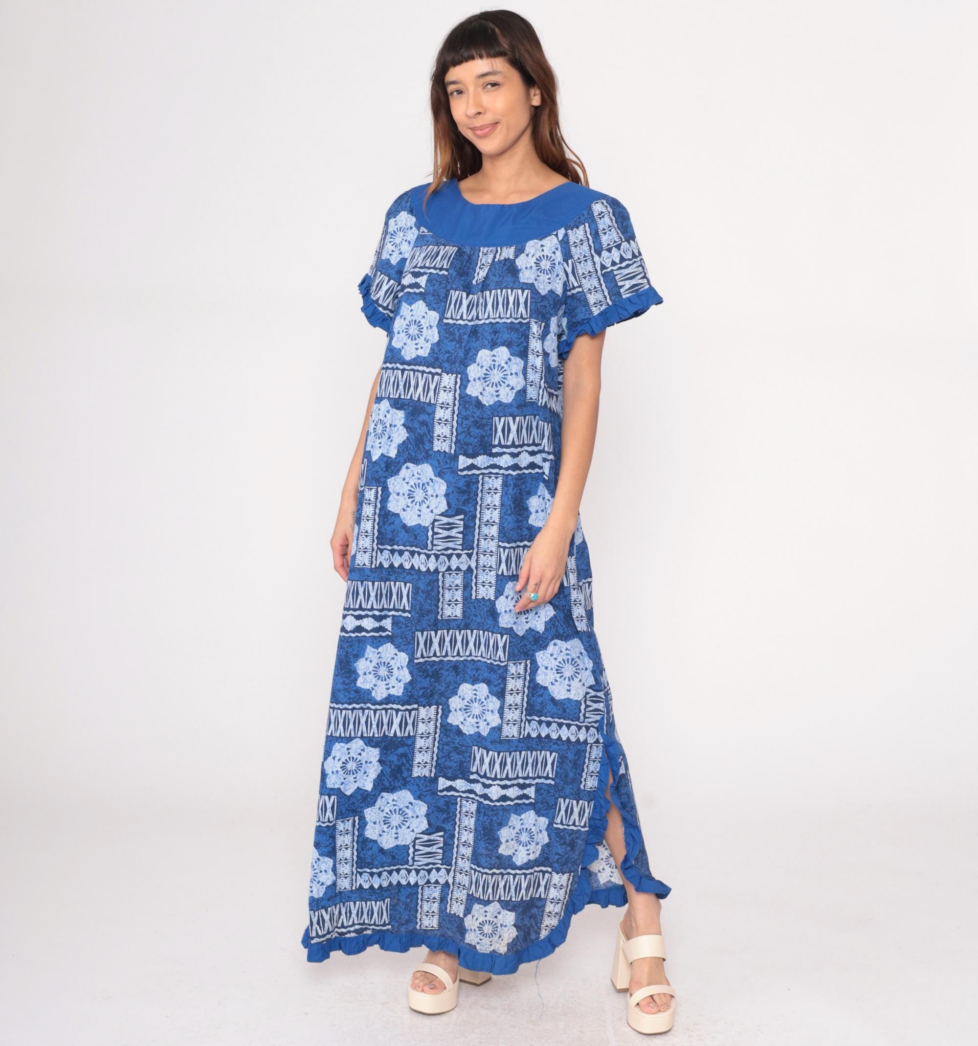 80s blue and white maxi dress with geometric tribal print throughout. All-over pattern with medallion motifs, zigzag borders, and diamond shapes. Short flutter sleeves, scoop neckline with button back closure, ruffled scalloped hem.