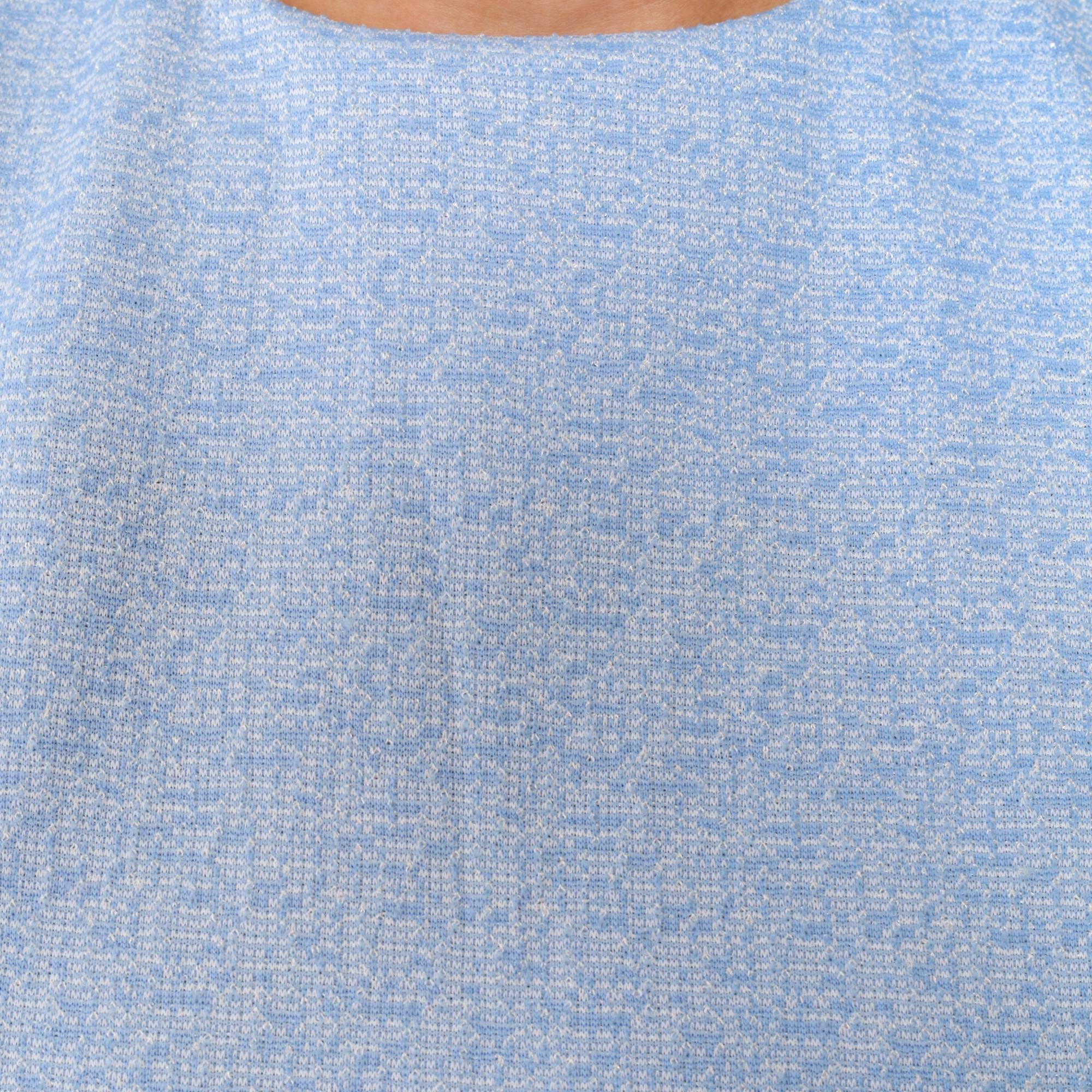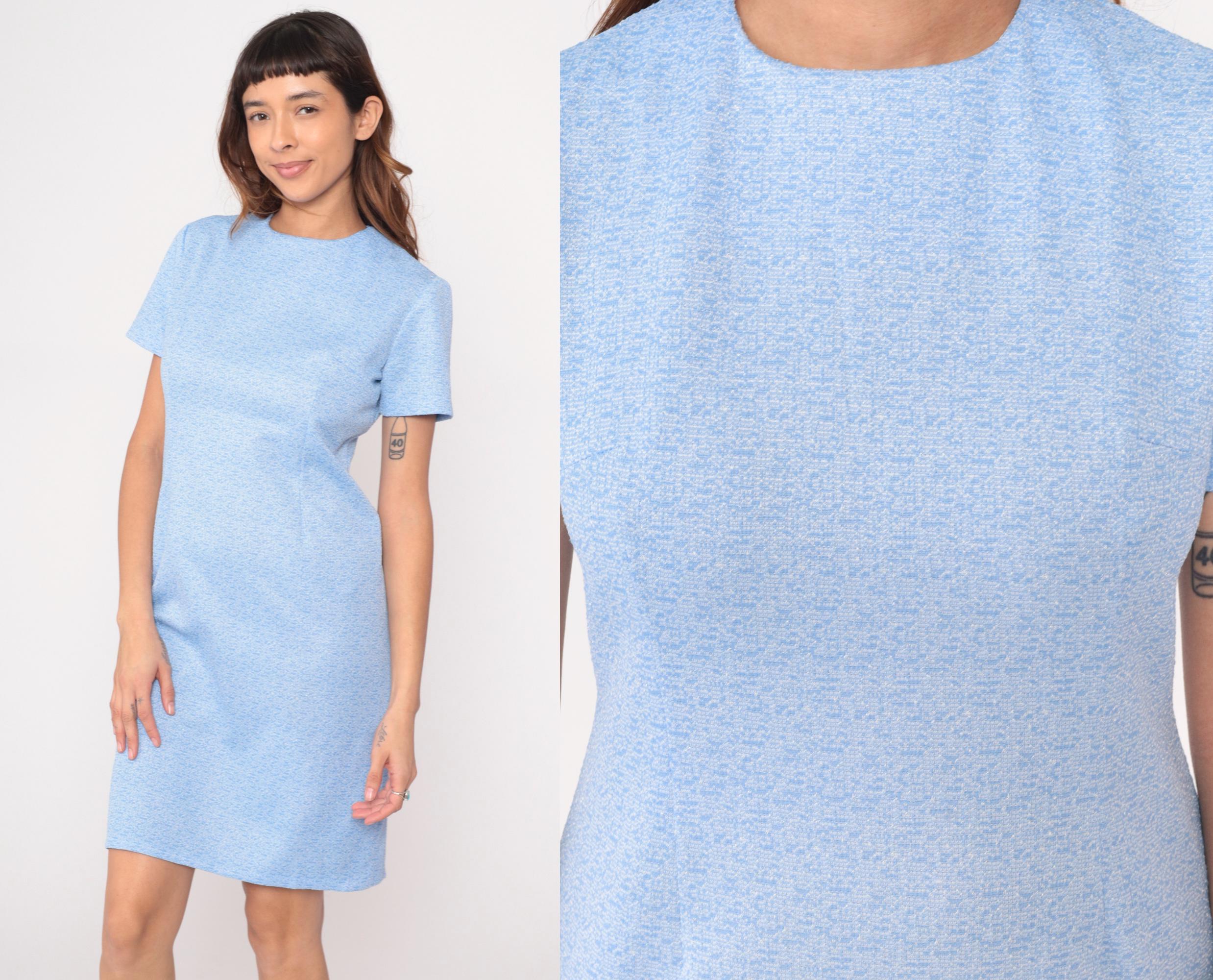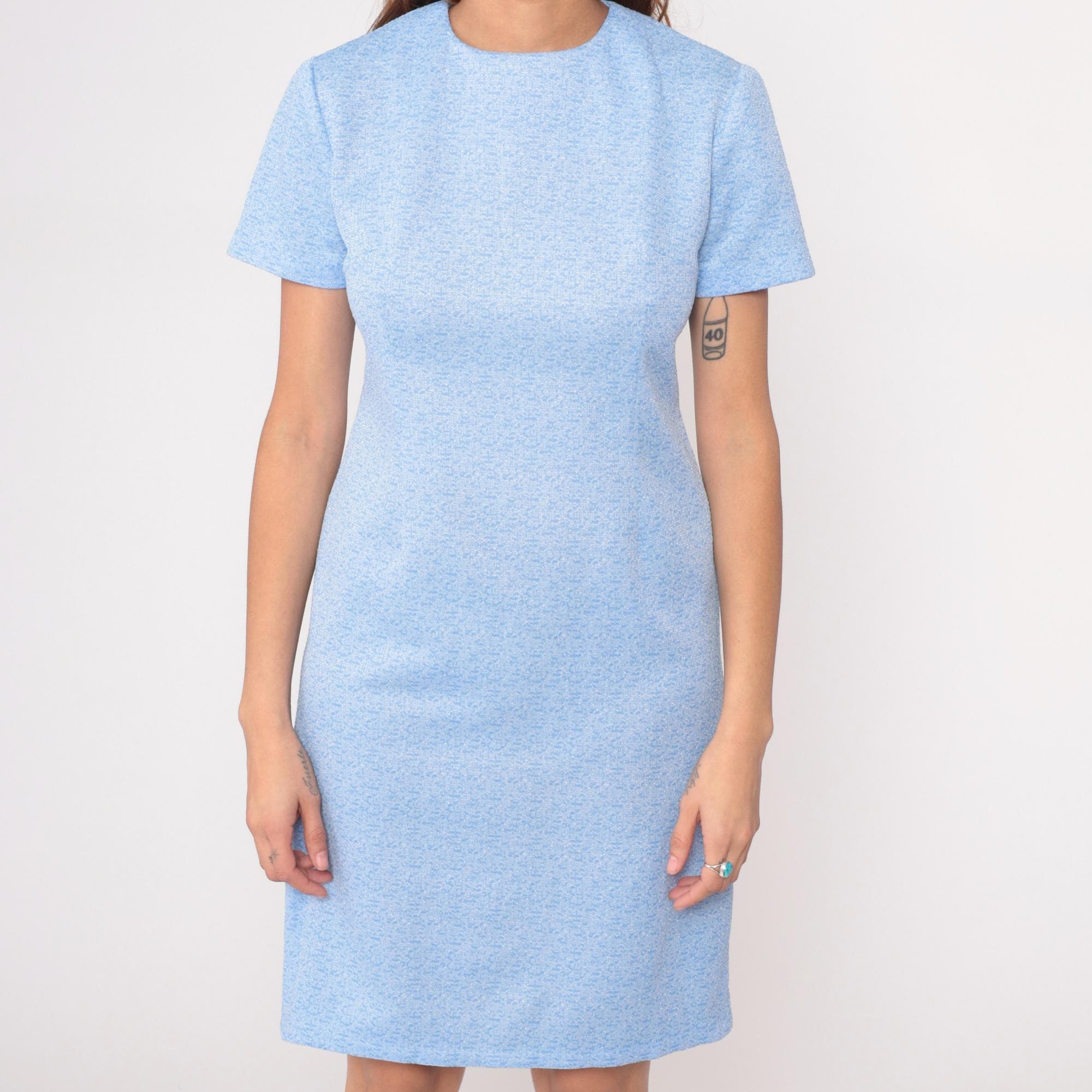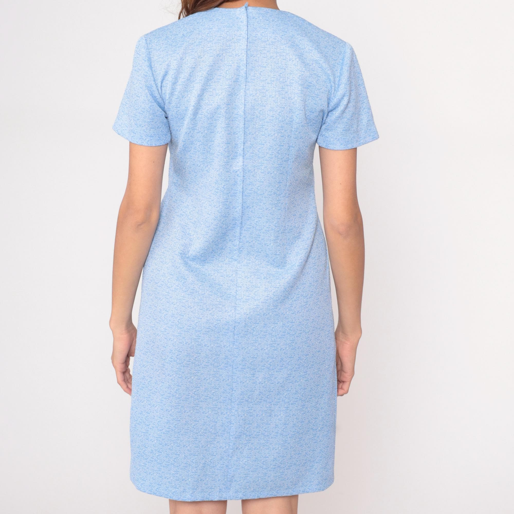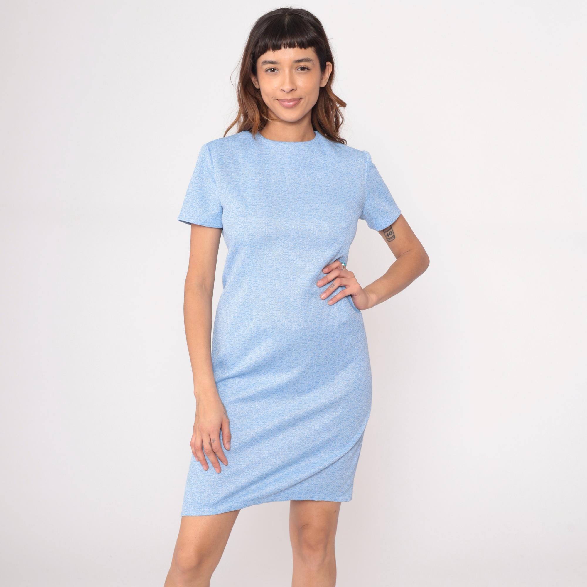 Light blue heathered t-shirt dress from the 70s with crew neckline and short sleeves. Straight shift silhouette in a relaxed fit with knee-length hem.