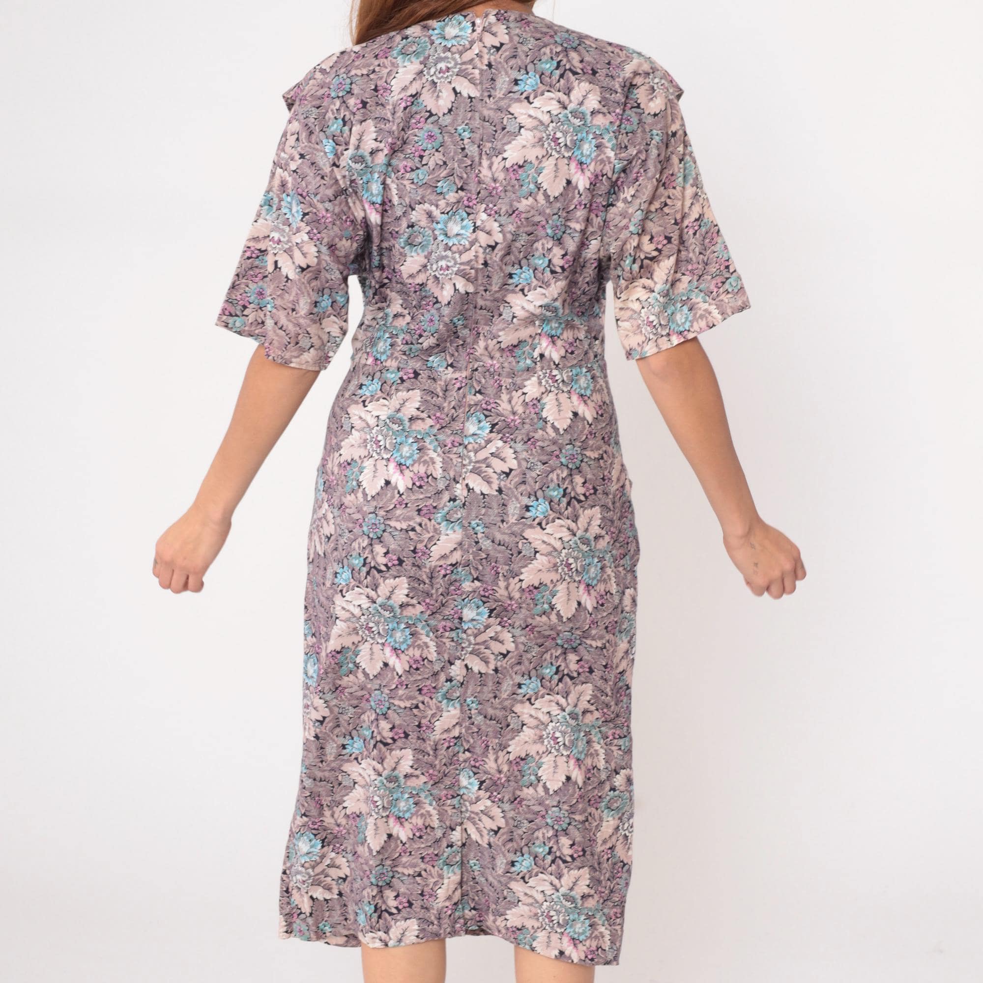 90s floral knee length dress from pea patch with V-neckline and short sleeves. Gray base with pink, blue, cream, and purple flowers across the fabric. Shoulder details with gathered or pleated elements.