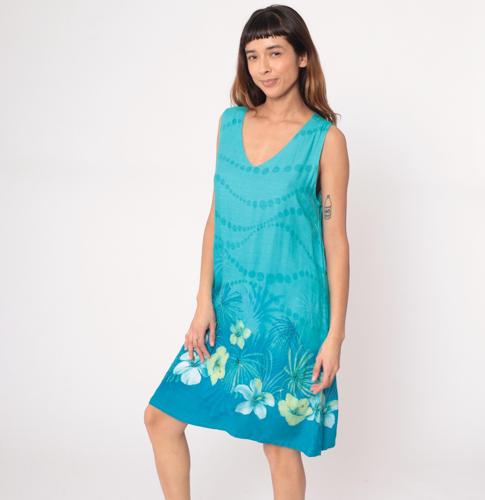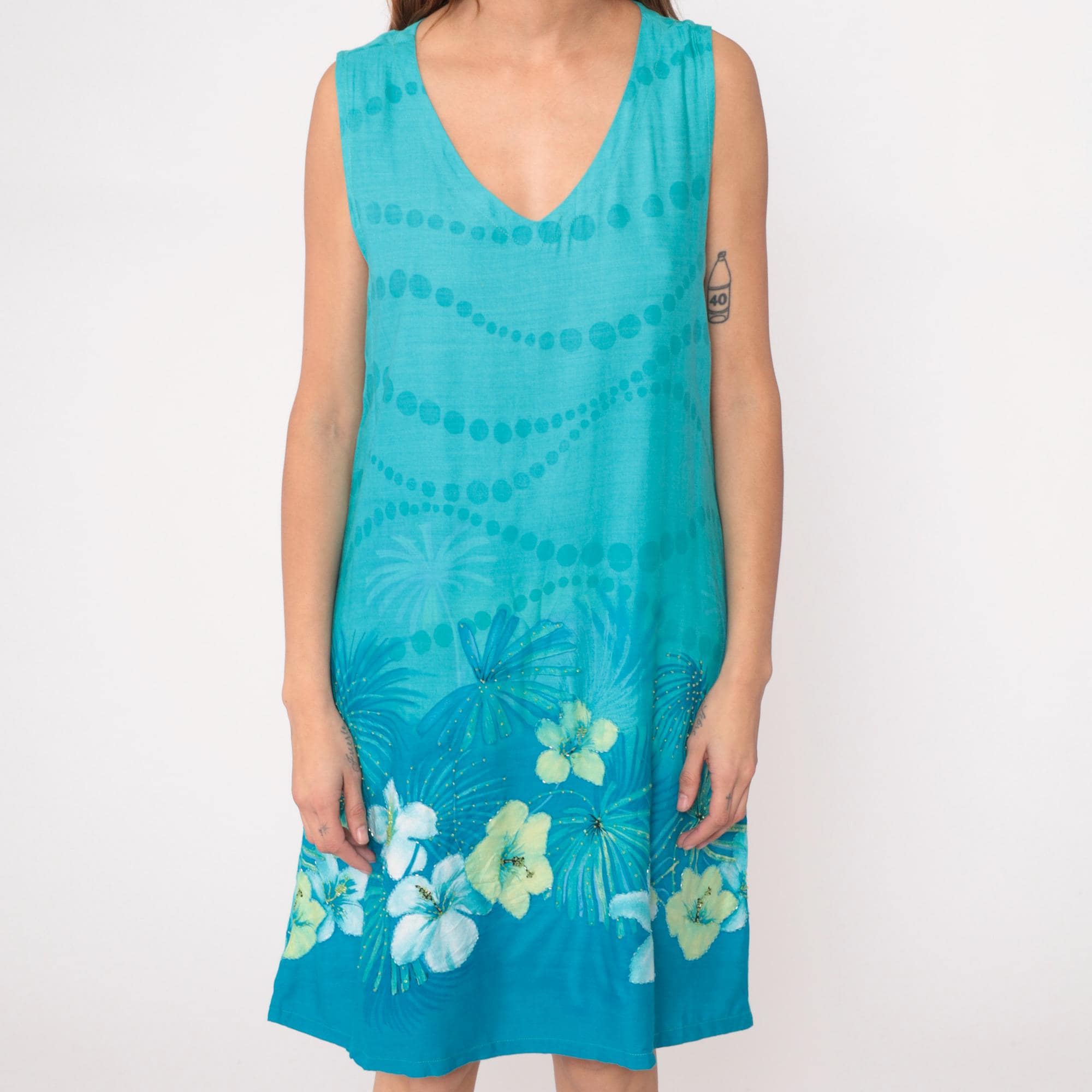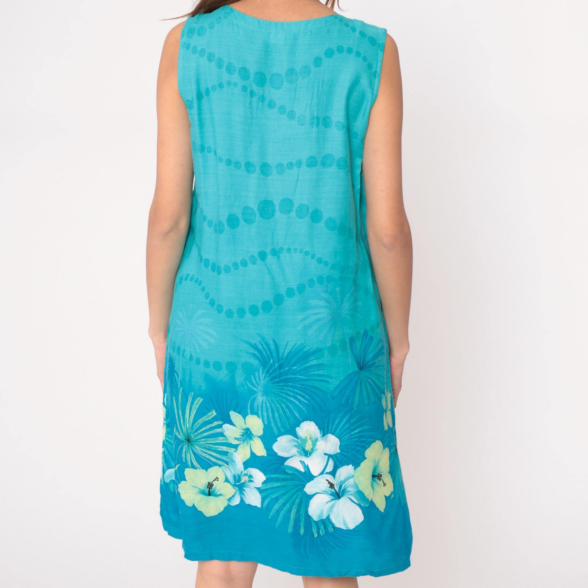 Y2K turquoise shift dress from hi lites with tropical print featuring white and yellow hibiscus flowers and blue palm fronds across the fabric. Aqua blue at top transitioning to deeper teal blue at hem, with beaded accents on floral and leaf details throughout. Sleeveless with V-neckline and straight silhouette.