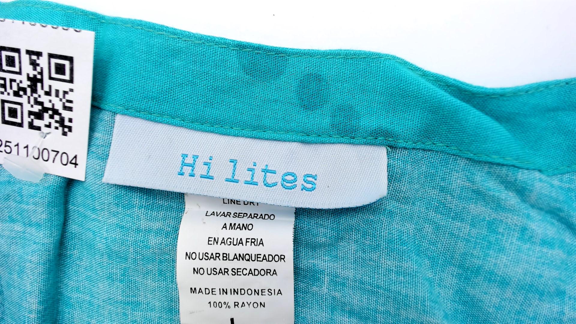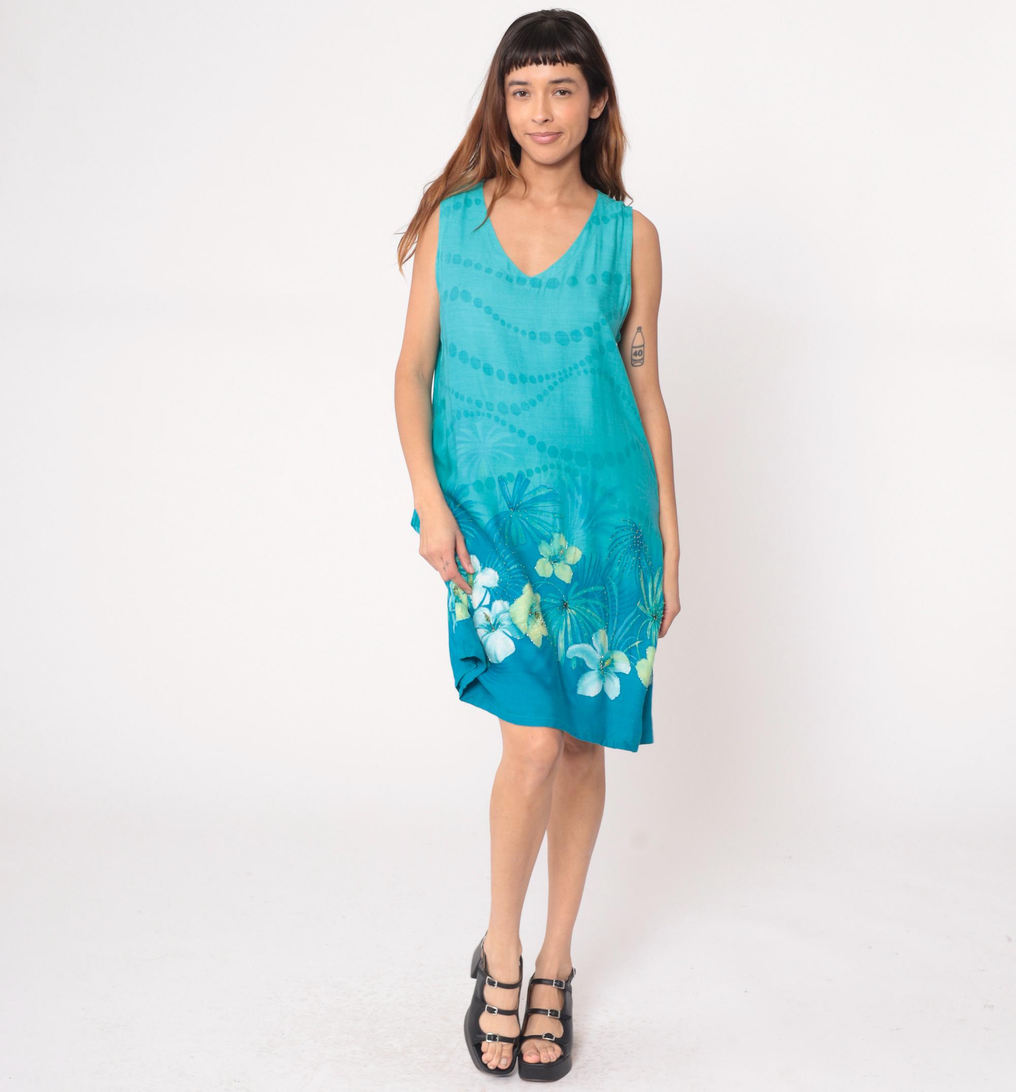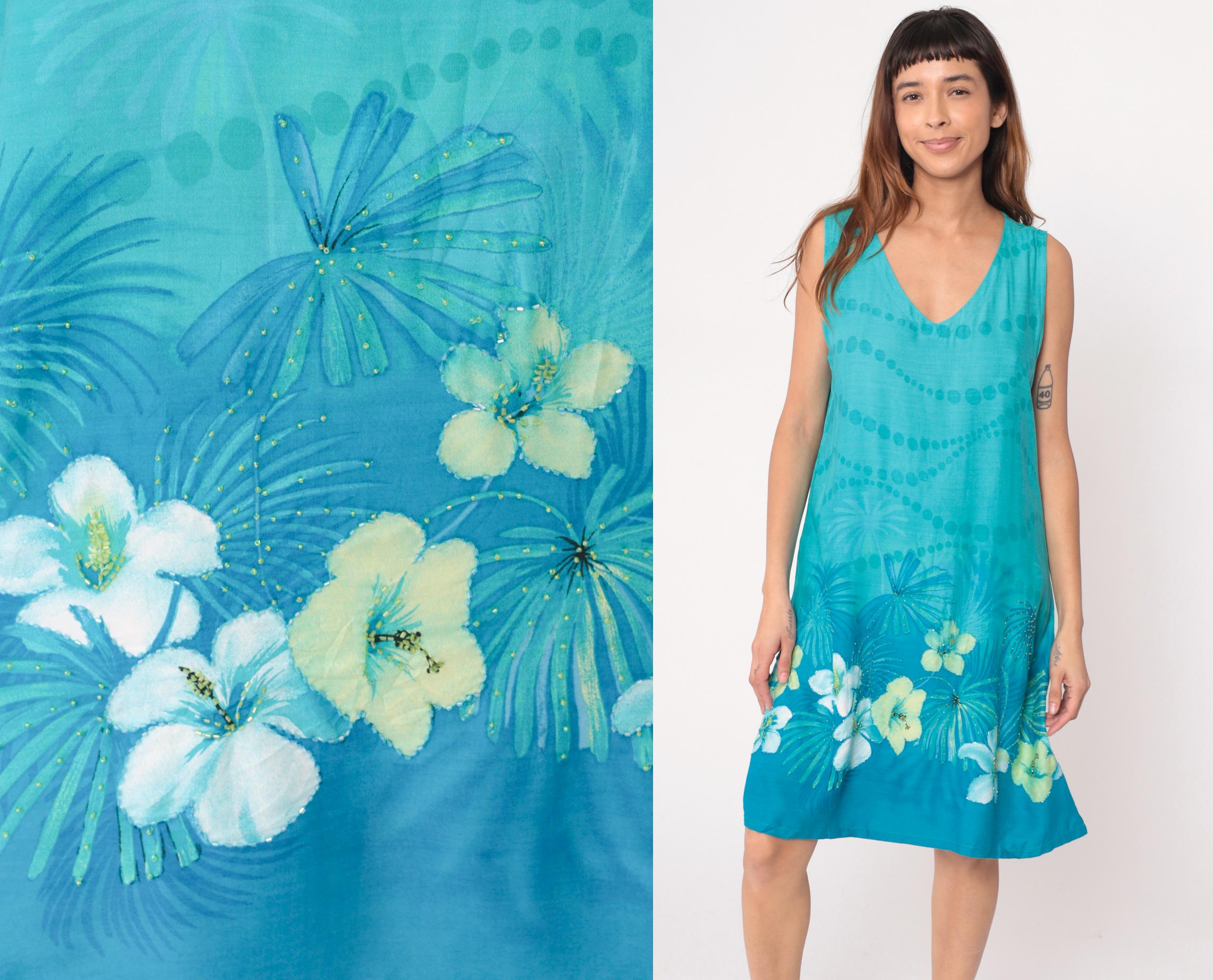 Y2K turquoise shift dress from hi lites with tropical print featuring white and yellow hibiscus flowers and blue palm fronds across the fabric. Aqua blue at top transitioning to deeper teal blue at hem, with beaded accents on floral and leaf details throughout. Sleeveless with V-neckline and straight silhouette.
