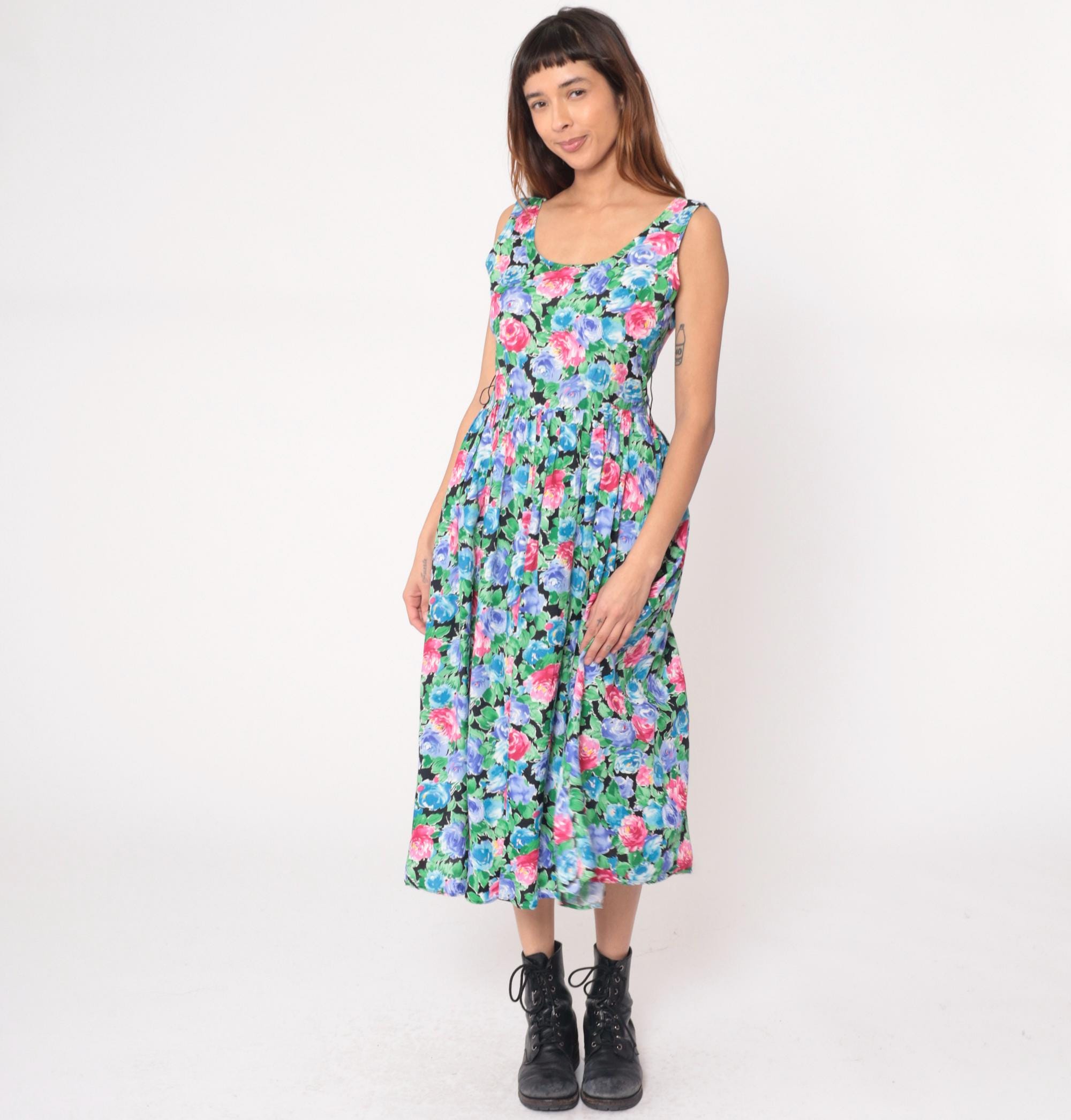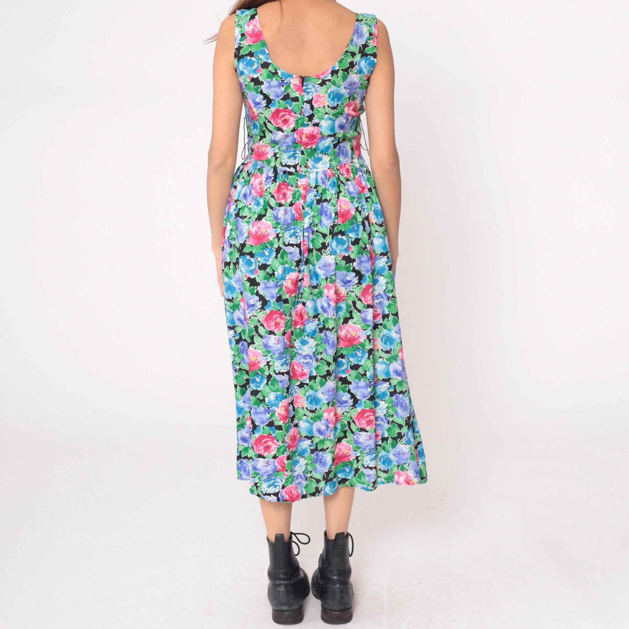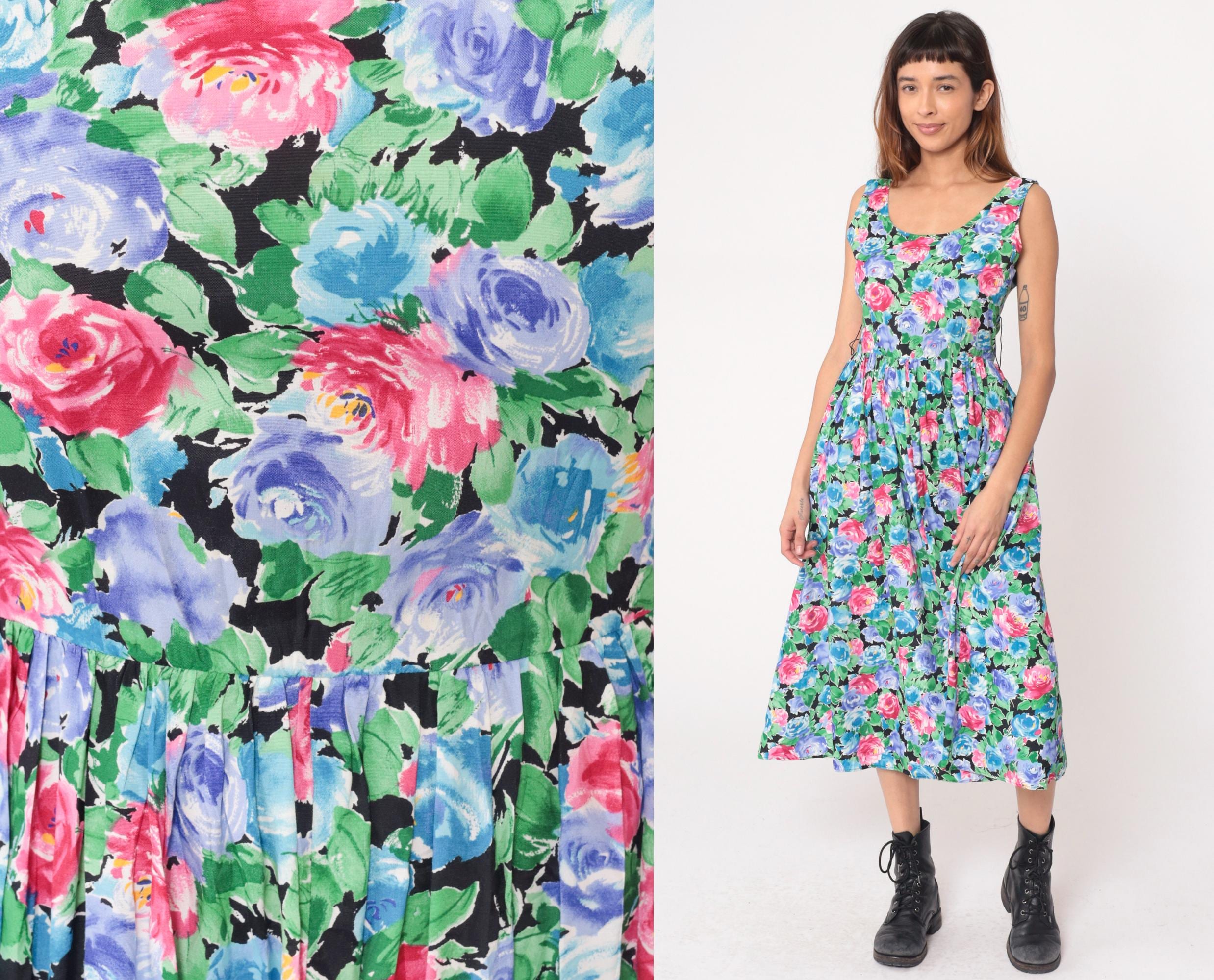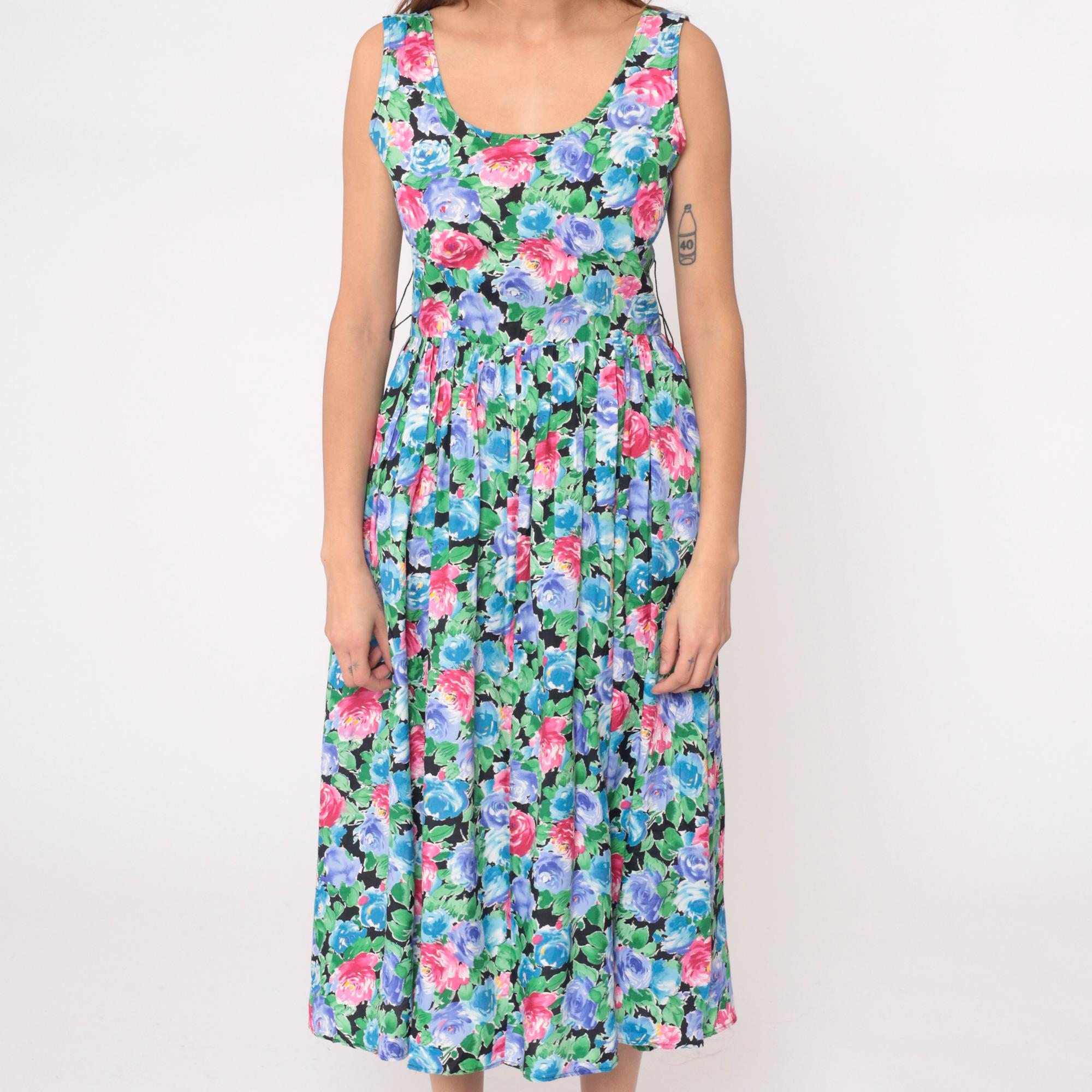 90s floral maxi dress from warren z with watercolor-style roses in pink, hot pink, blue, and periwinkle with green leaves on black background. Sleeveless with scoop neckline, fitted bodice, gathered waist, and full A-line skirt.