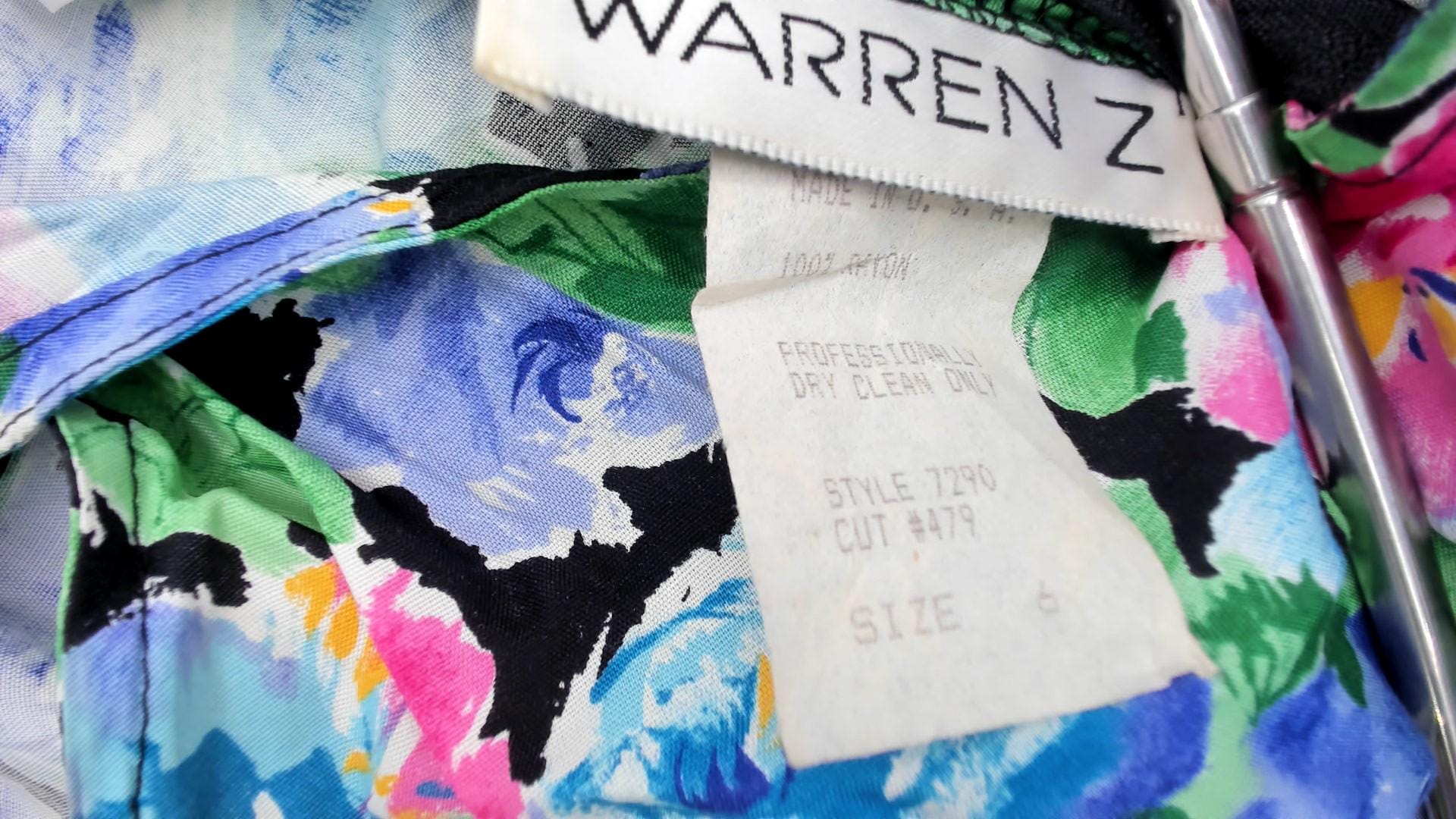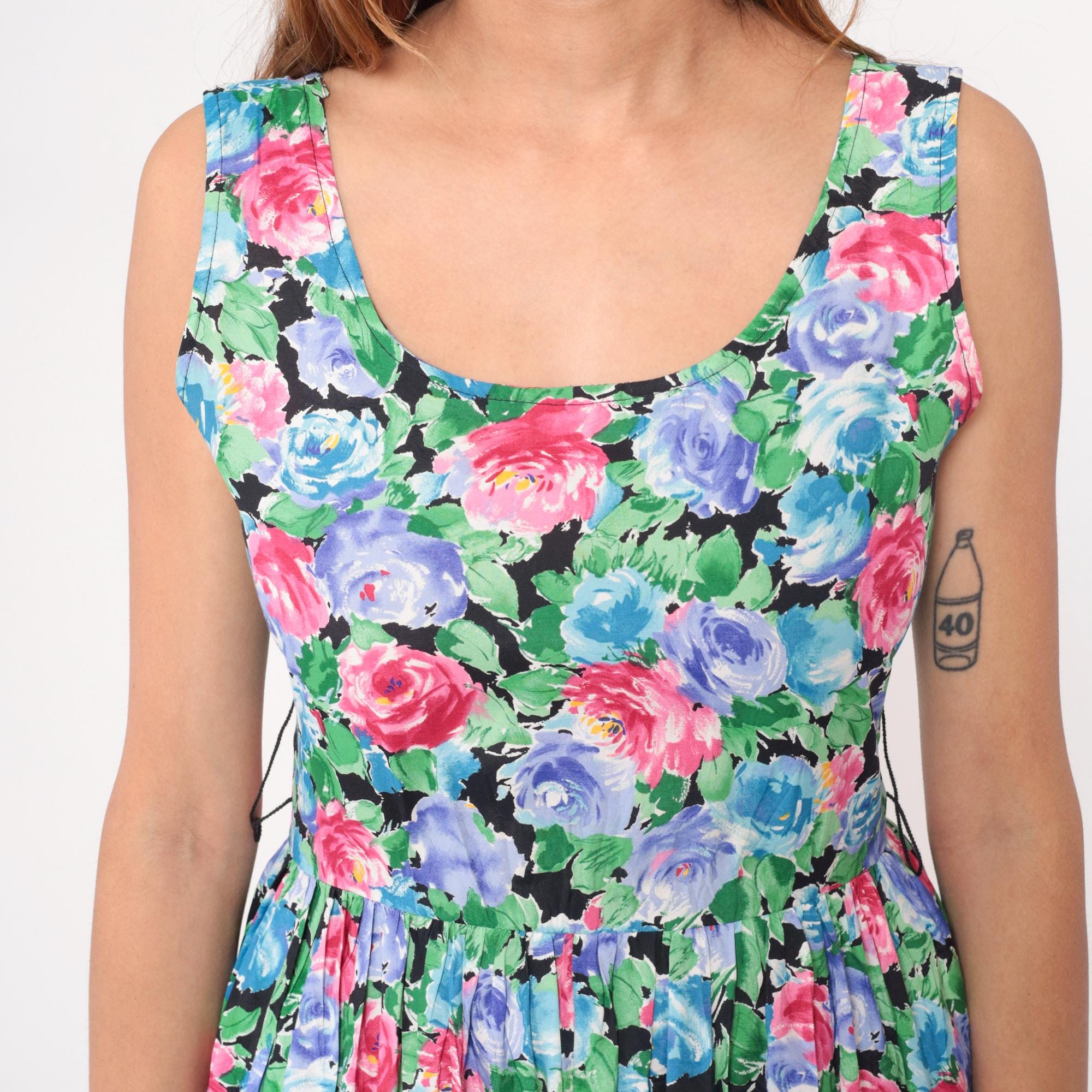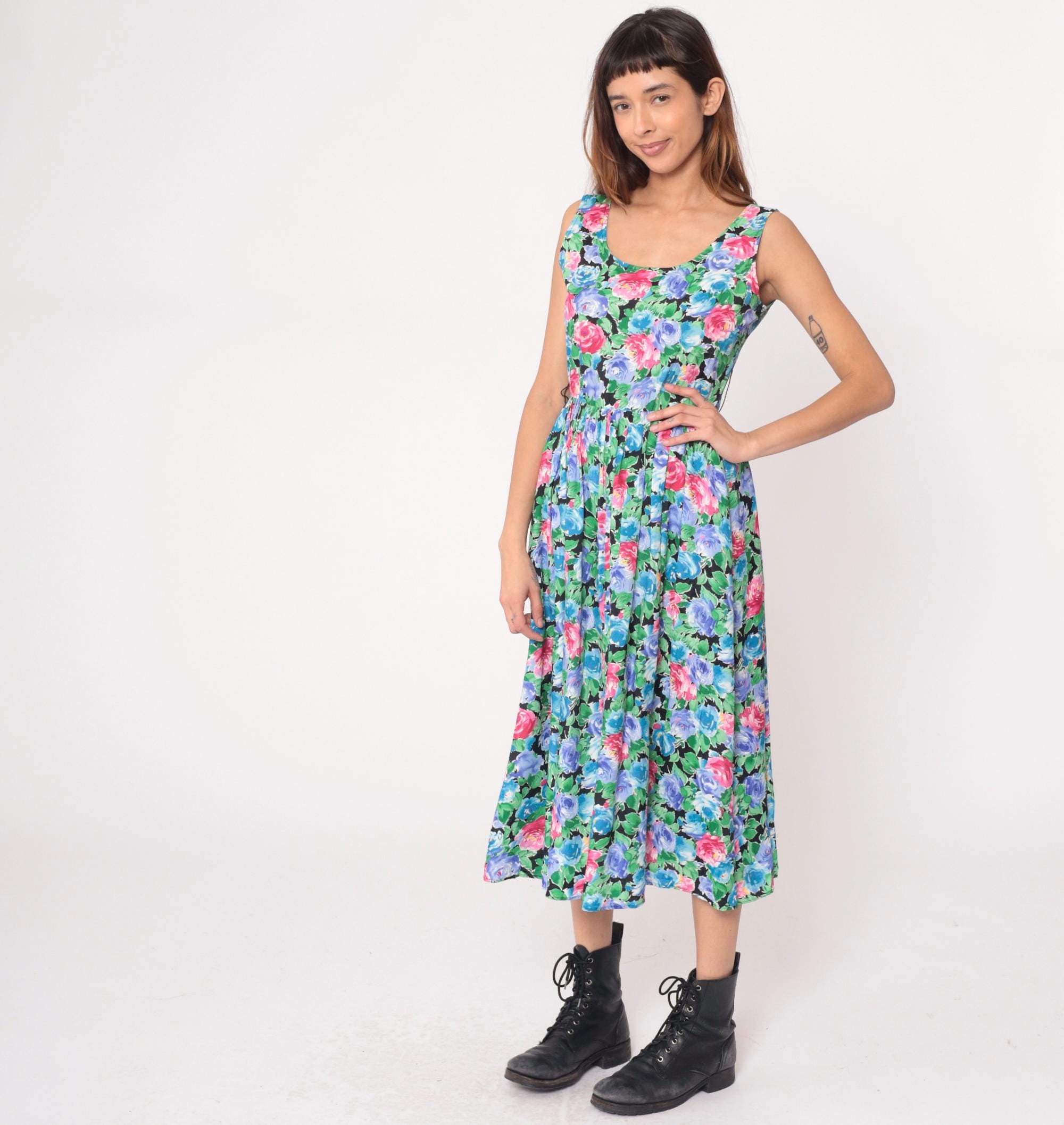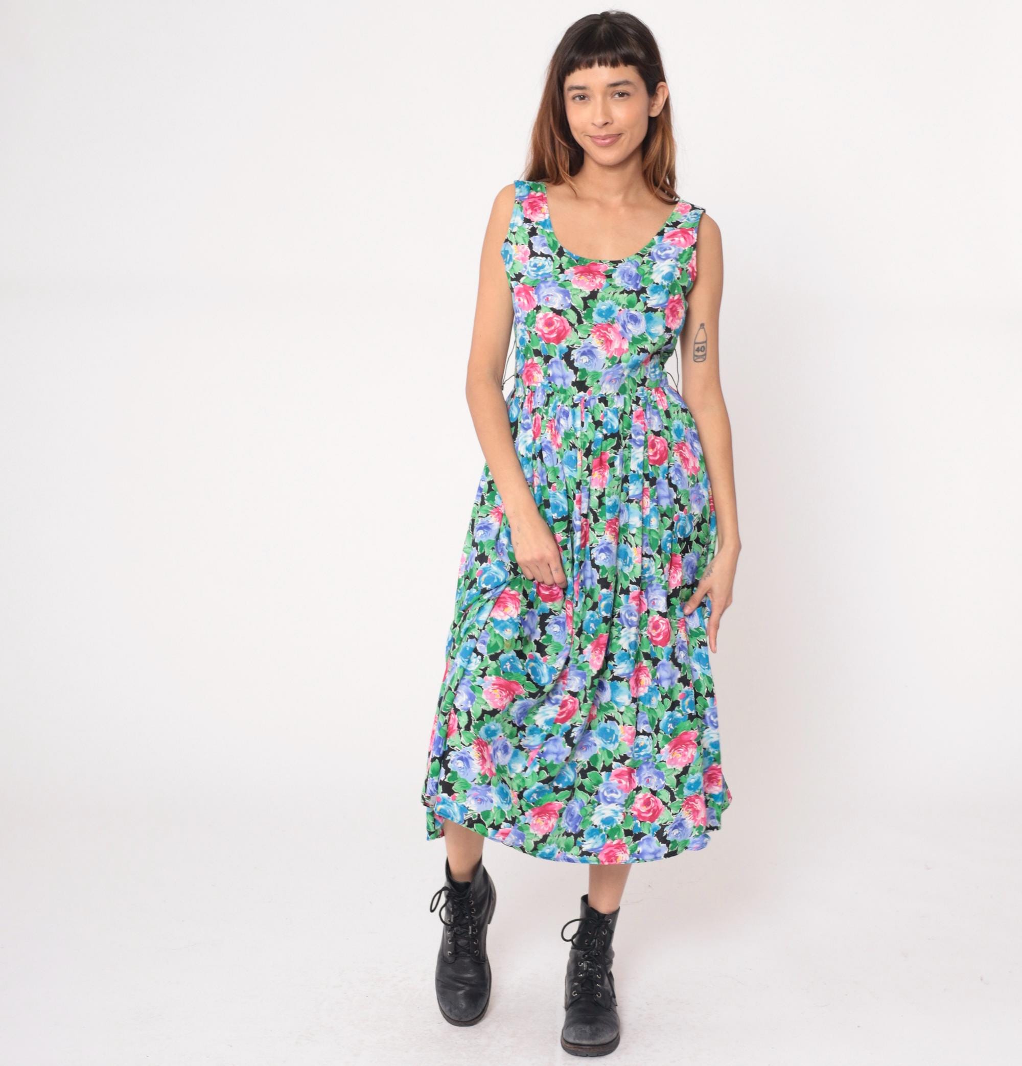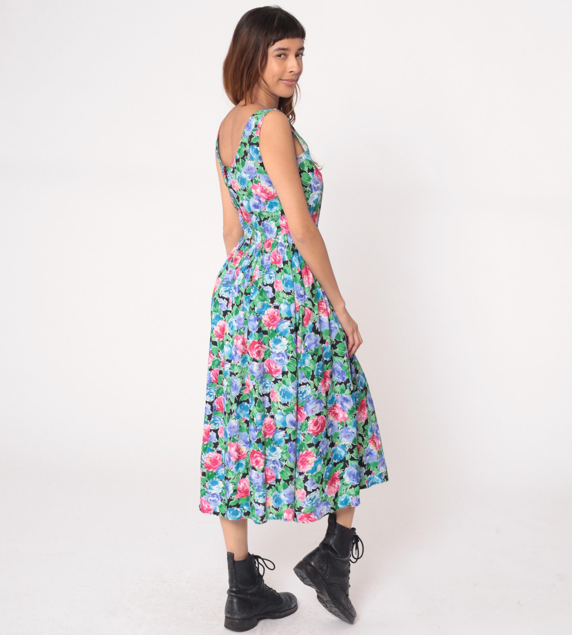 90s floral maxi dress from warren z with watercolor-style roses in pink, hot pink, blue, and periwinkle with green leaves on black background. Sleeveless with scoop neckline, fitted bodice, gathered waist, and full A-line skirt.