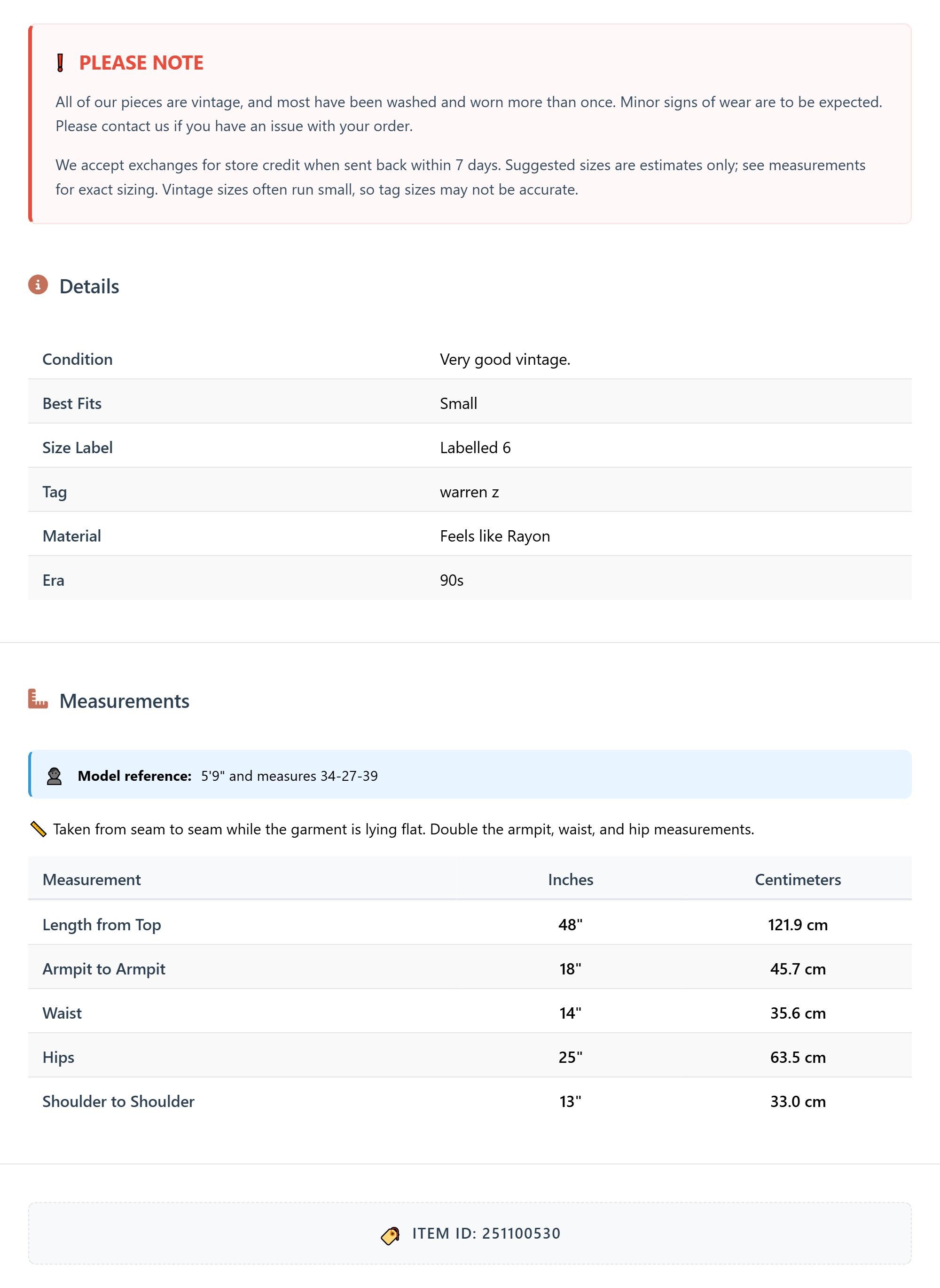 All of our pieces are vintage, and most have been washed and worn more than once. Minor signs of wear are to be expected. Please contact us if you have an issue with your order. We accept exchanges for store credit when sent back within 7 days.