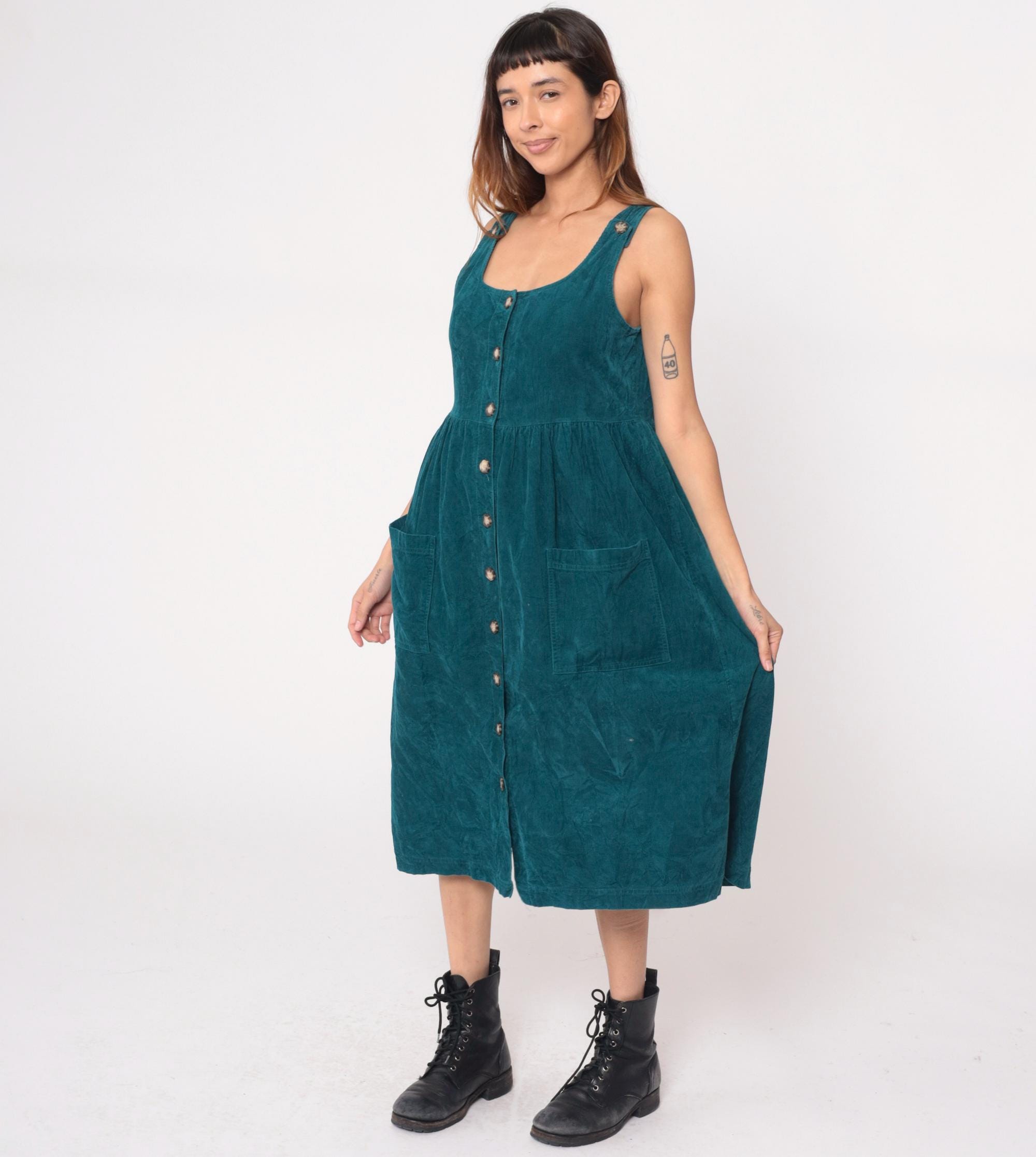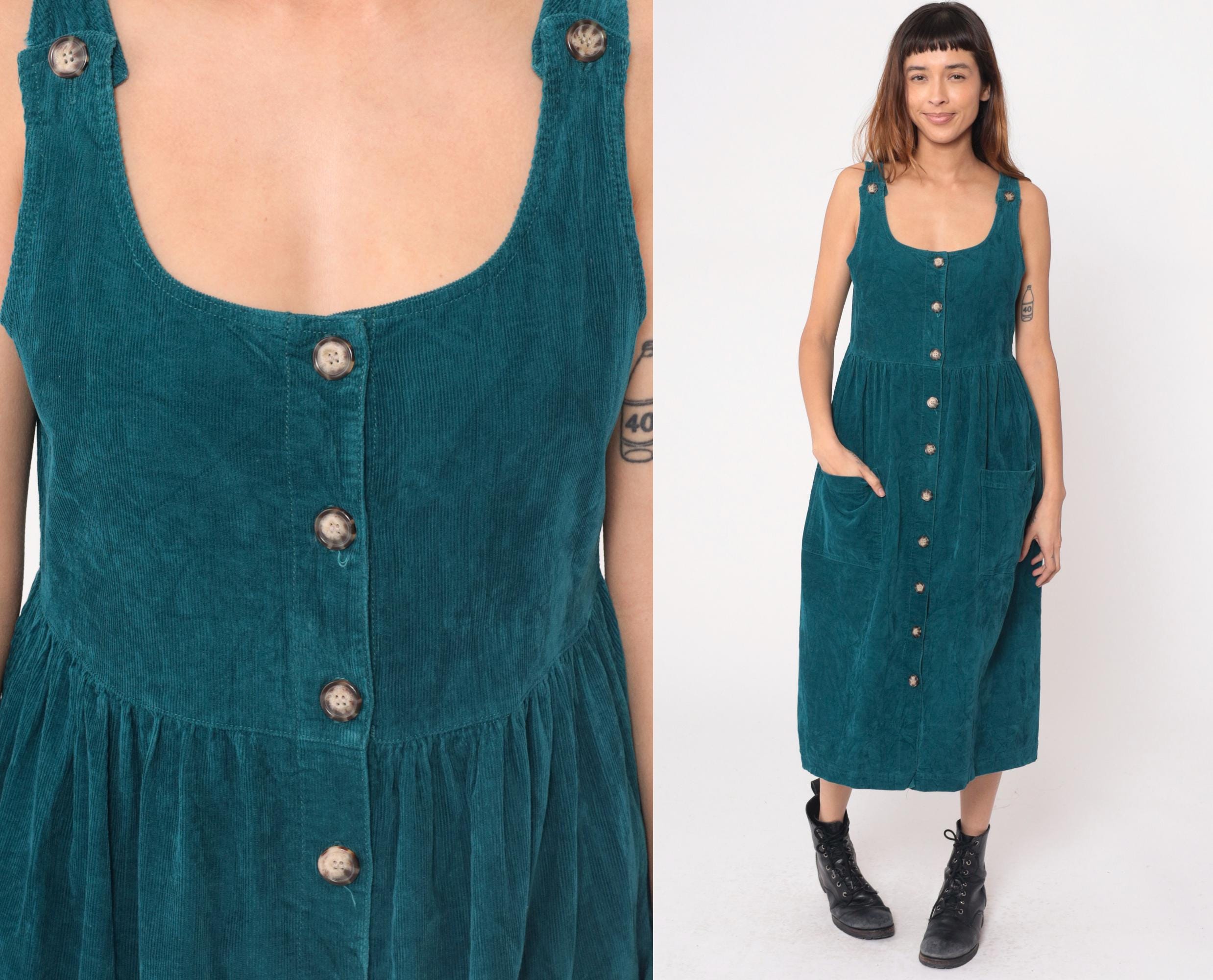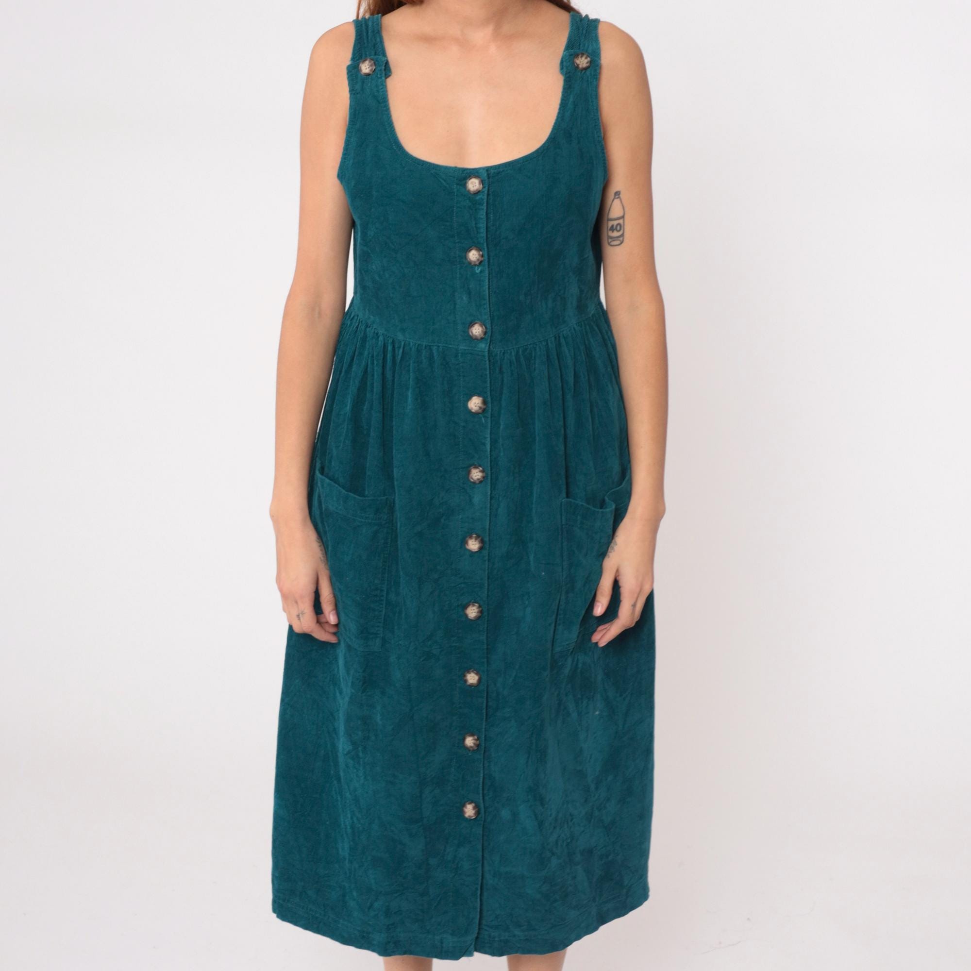 90s teal corduroy dress from JG Hook with button front closure and adjustable button straps at shoulders. Scoop neckline, sleeveless style, fitted bodice with gathered waist. Two front patch pockets, below-knee length.