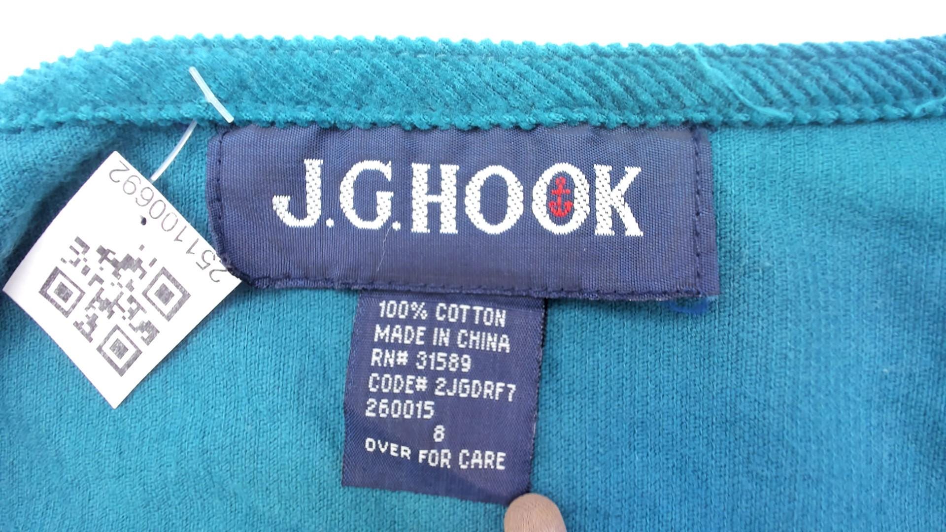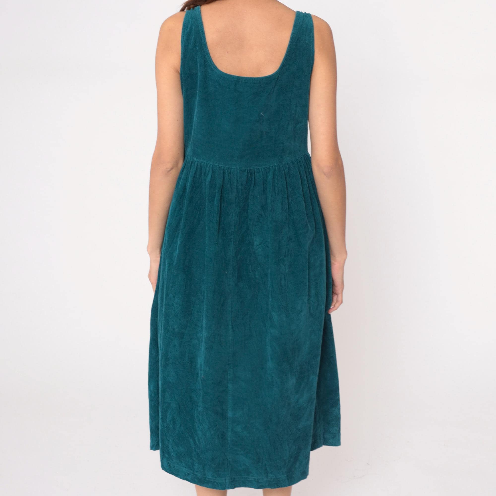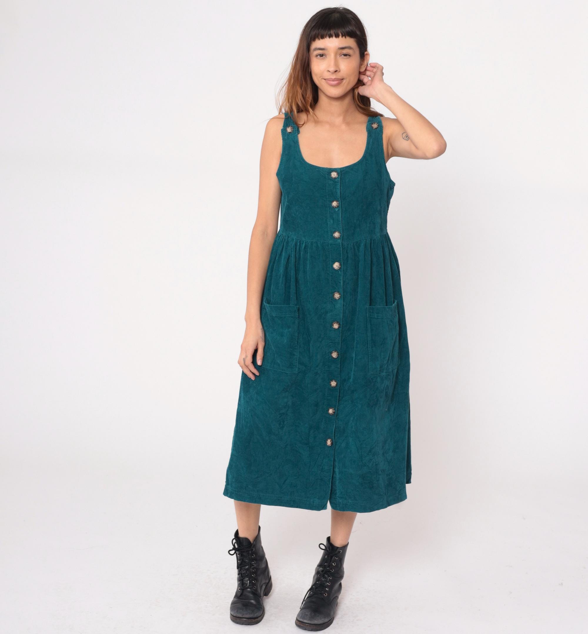 90s teal corduroy dress from JG Hook with button front closure and adjustable button straps at shoulders. Scoop neckline, sleeveless style, fitted bodice with gathered waist. Two front patch pockets, below-knee length.