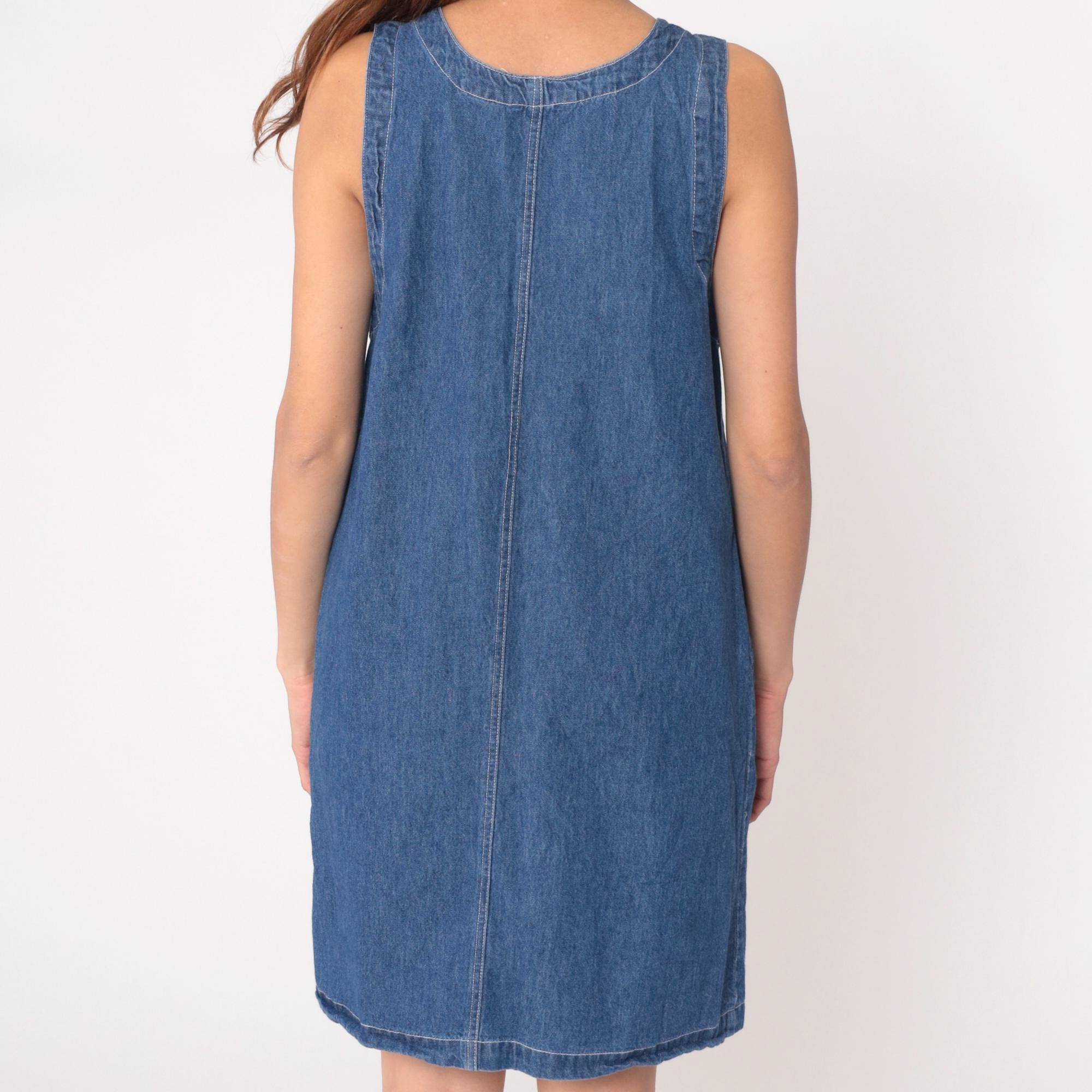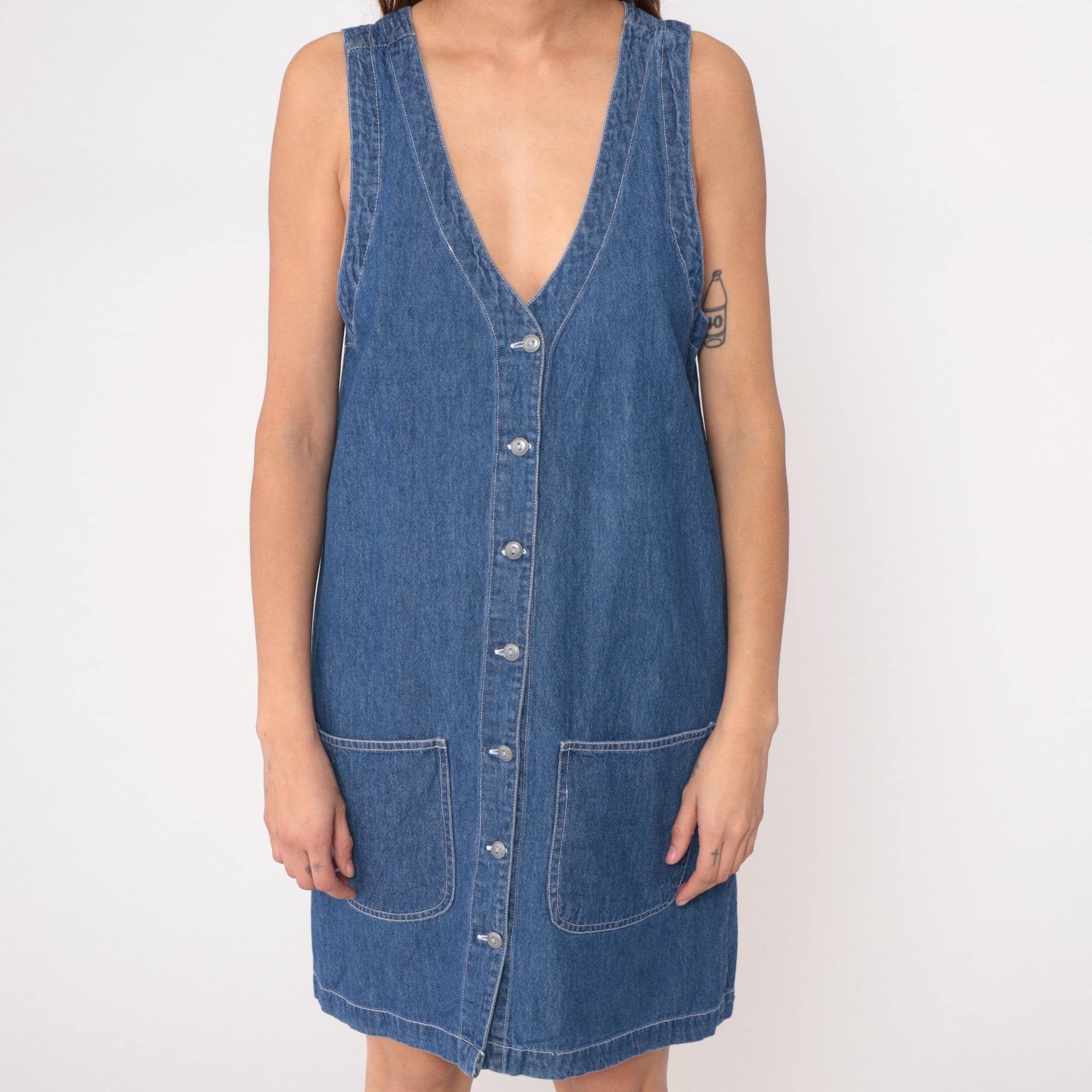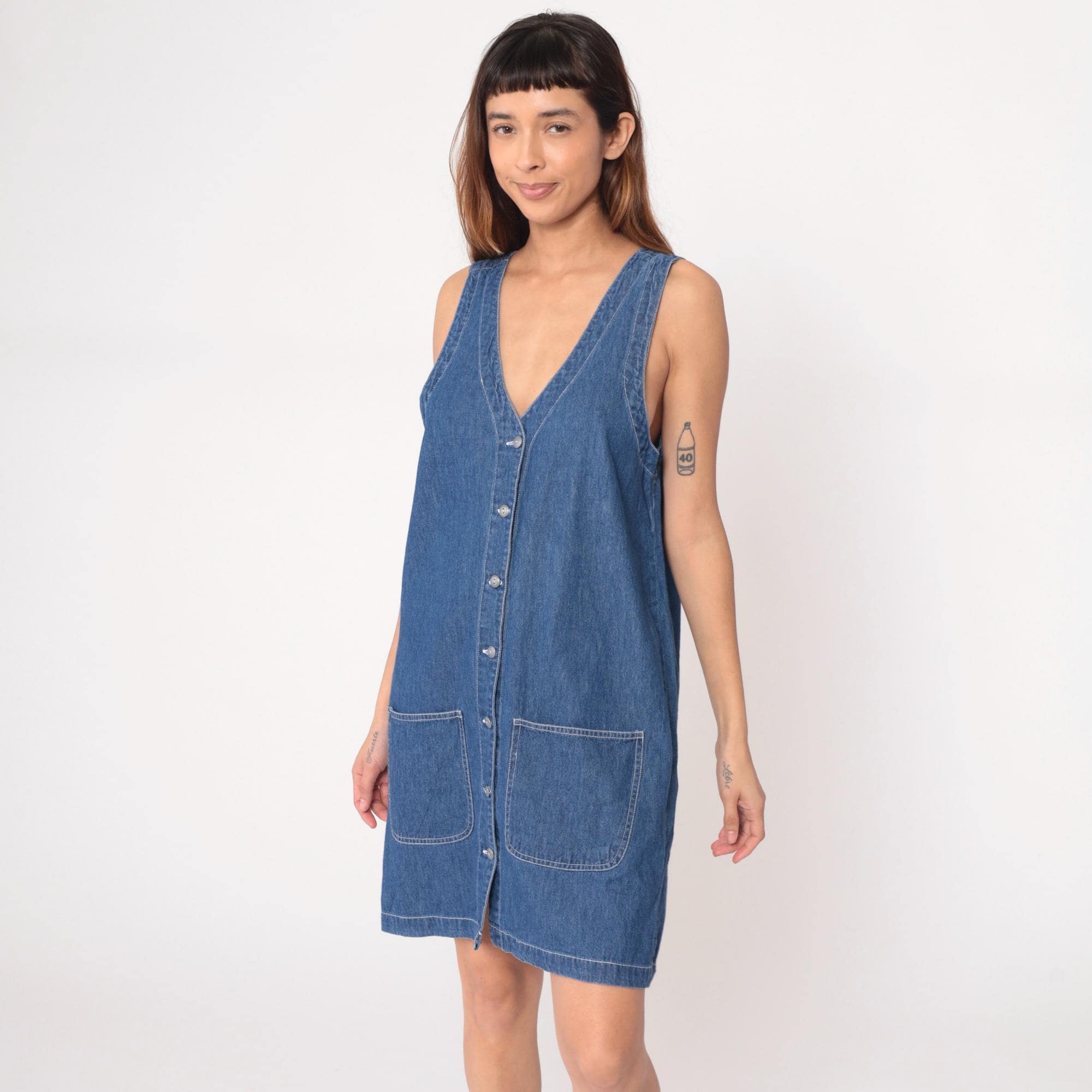 90s sleeveless denim dress from northwest blue with button front closure and deep V-neckline. Two patch pockets at hip level, knee-length straight silhouette.