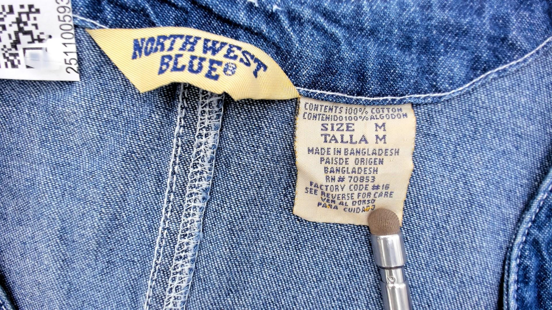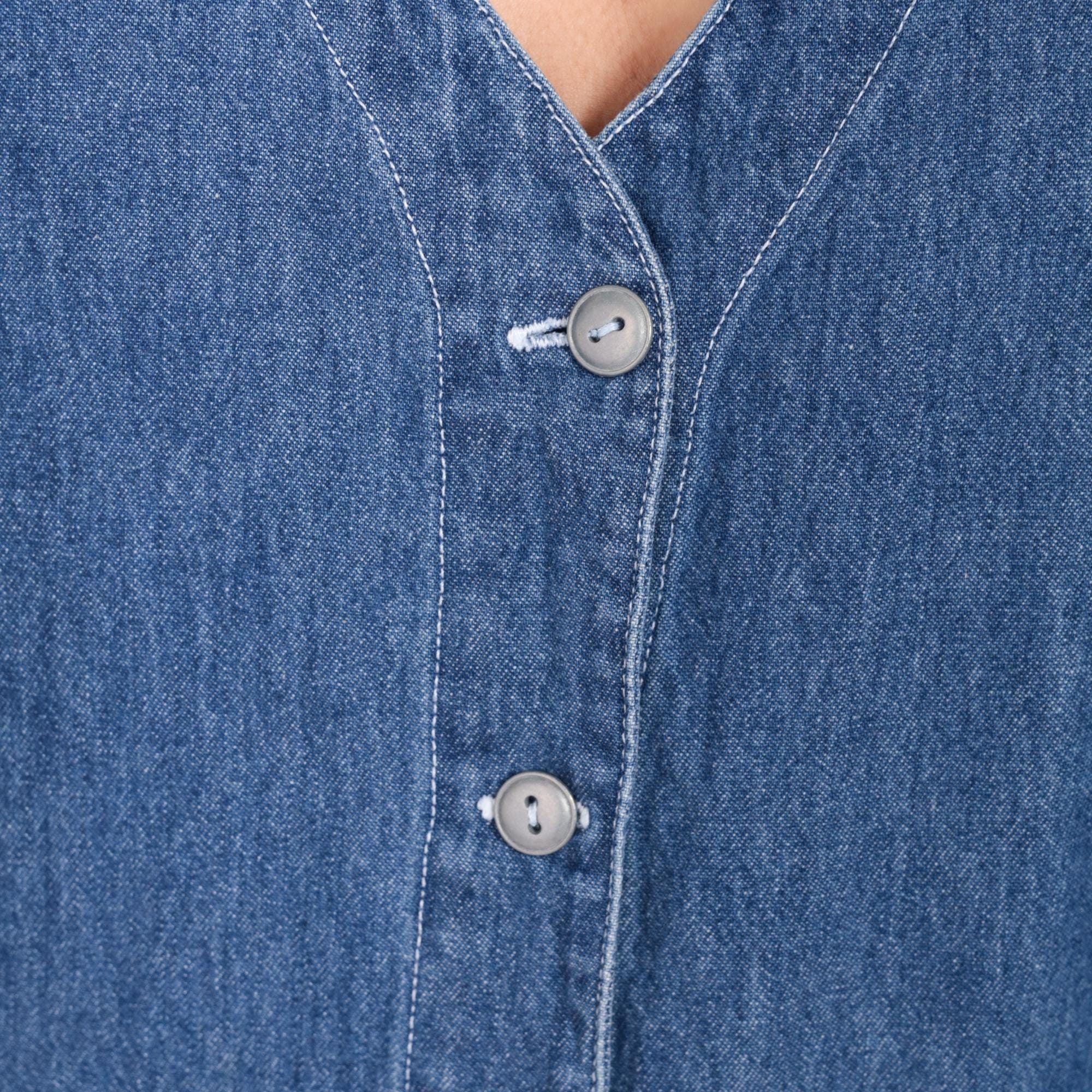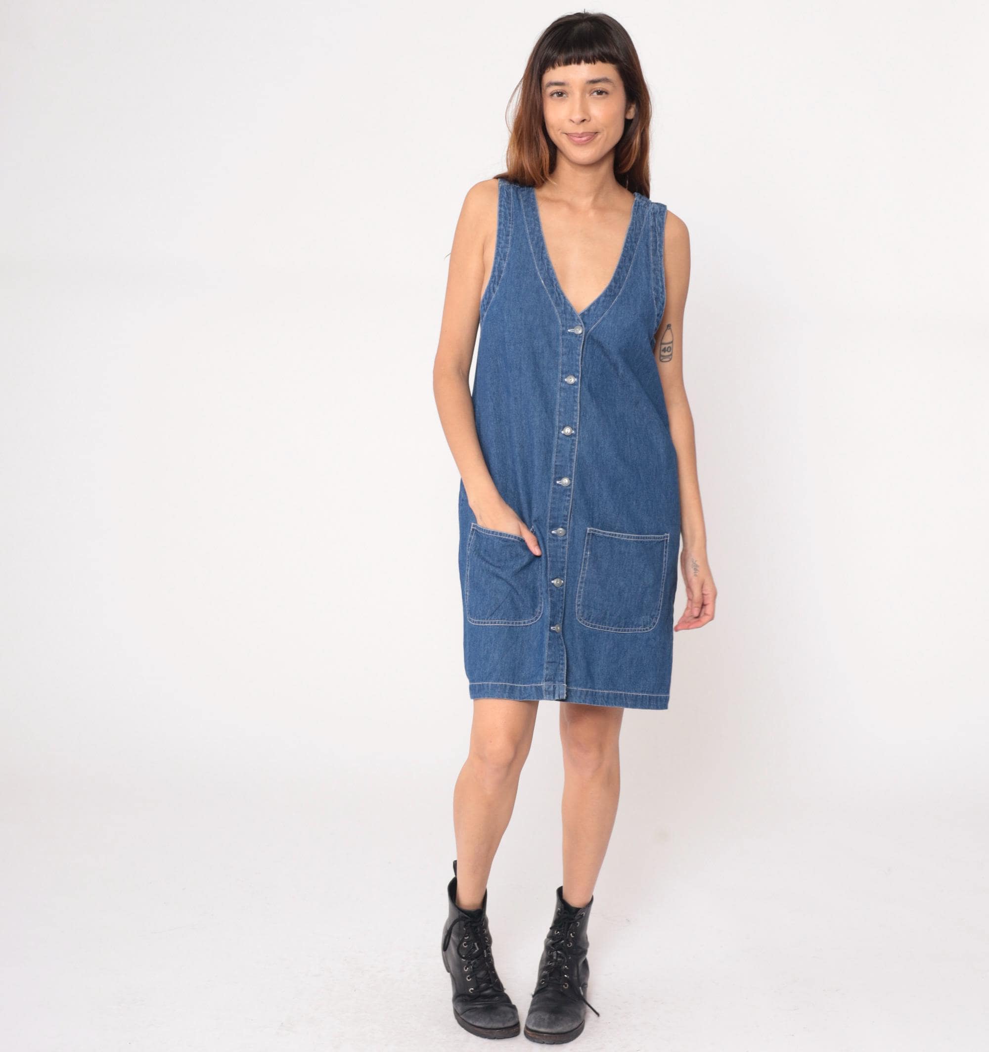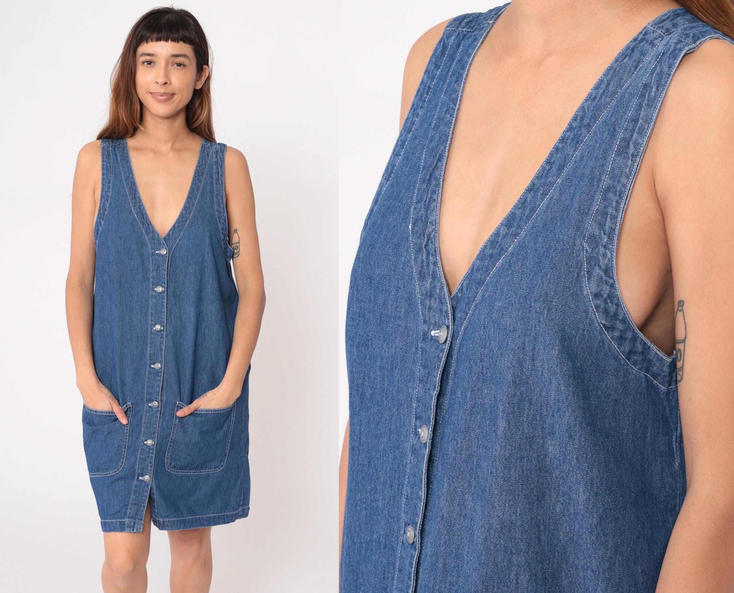 90s sleeveless denim dress from northwest blue with button front closure and deep V-neckline. Two patch pockets at hip level, knee-length straight silhouette.