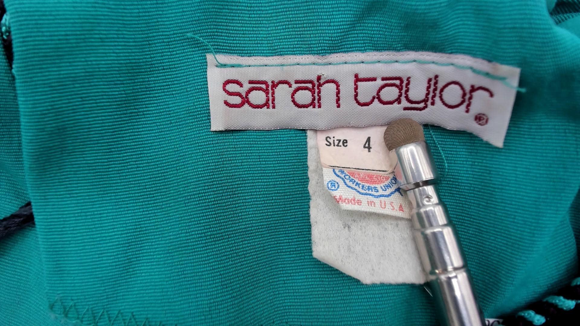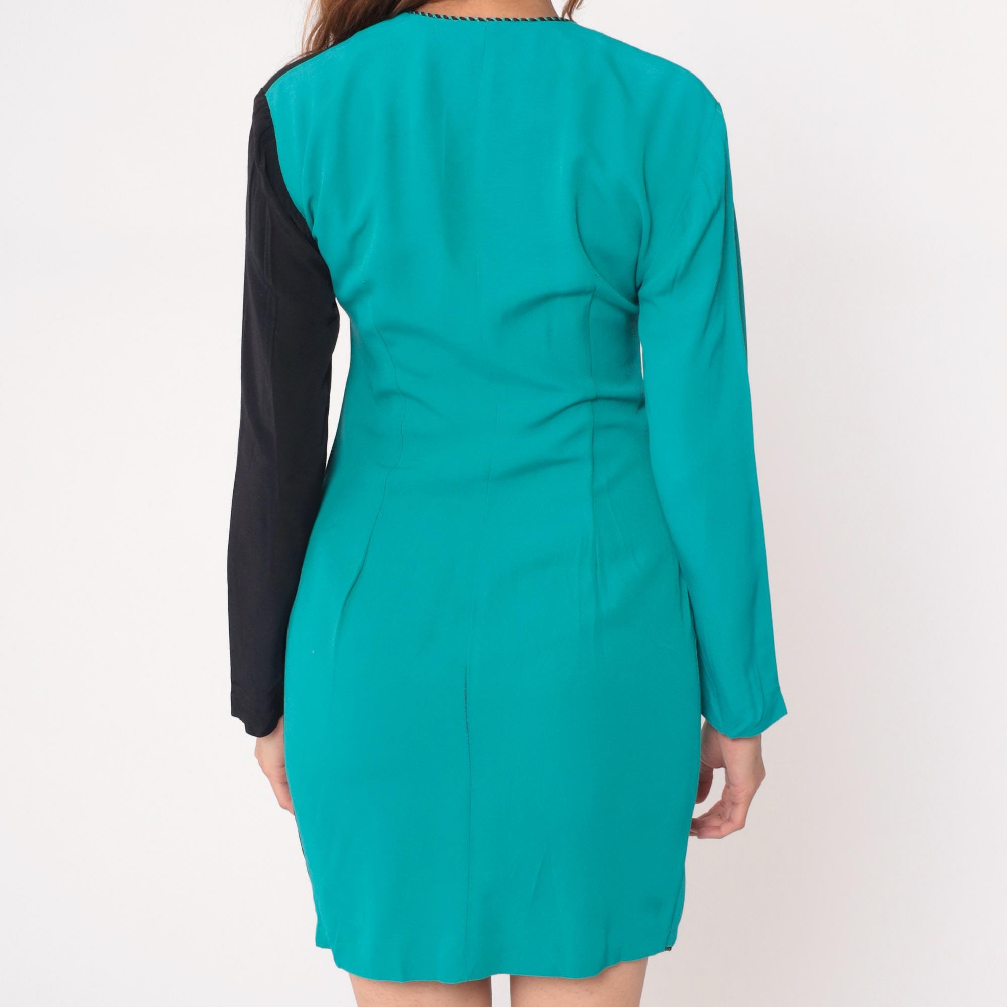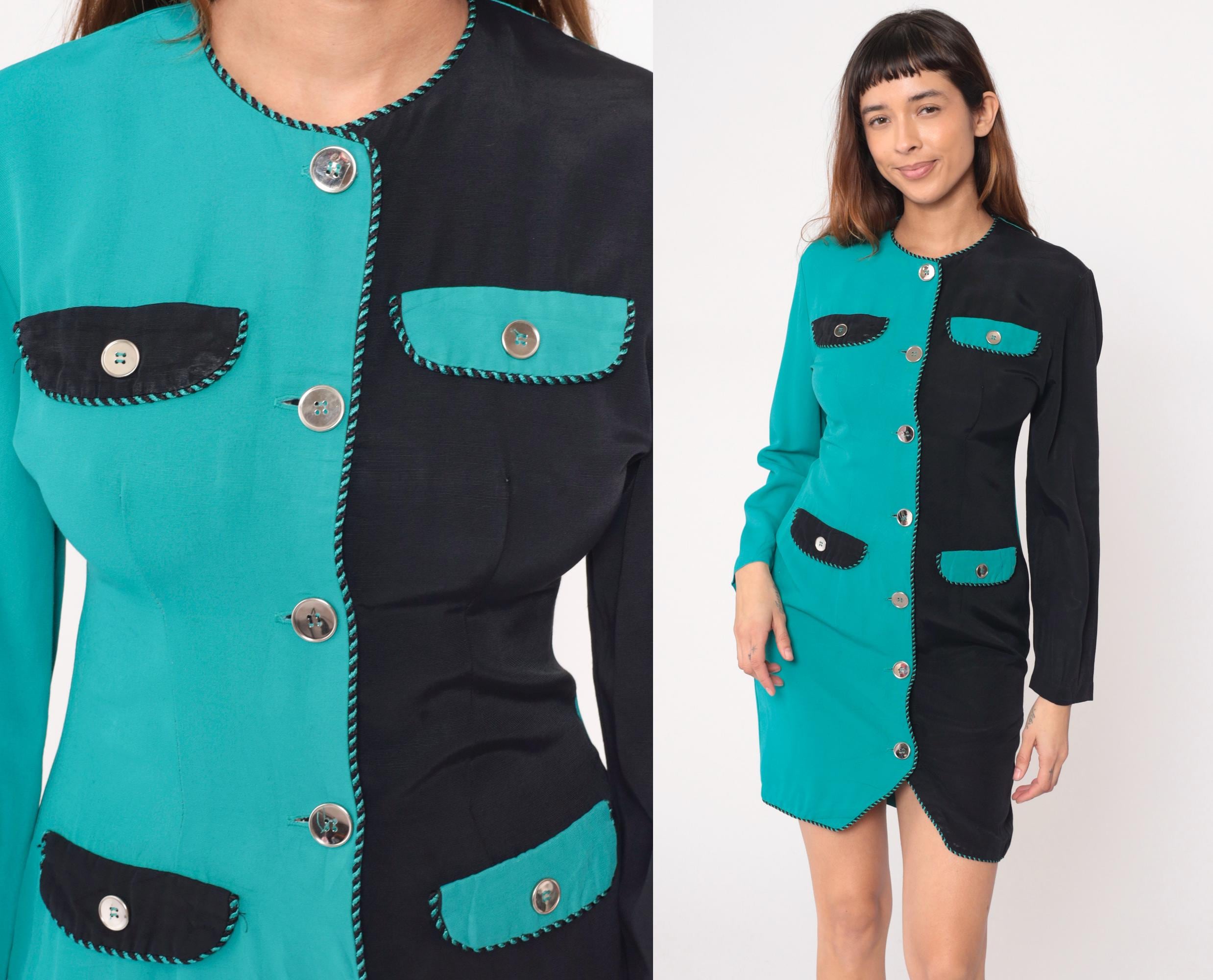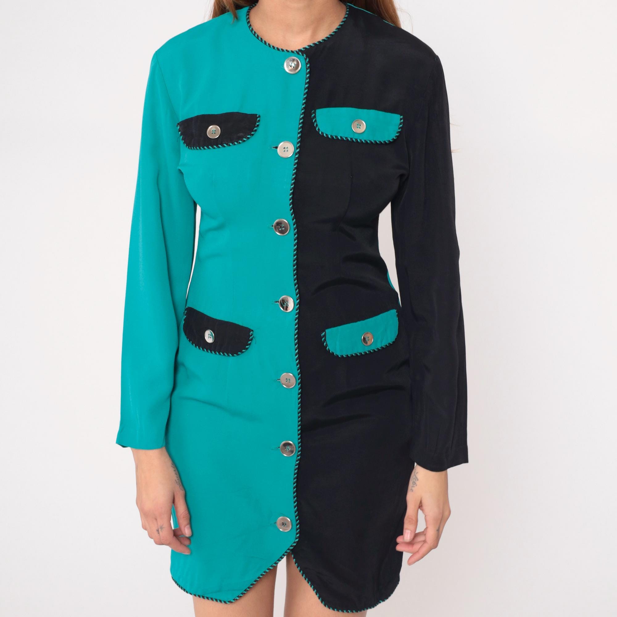 90s turquoise and black colorblock dress from Sarah Taylor with vertical split design and decorative contrast stitching along edges. Button front closure with round neckline, long sleeves, four faux pockets with inverted colorblock pattern.